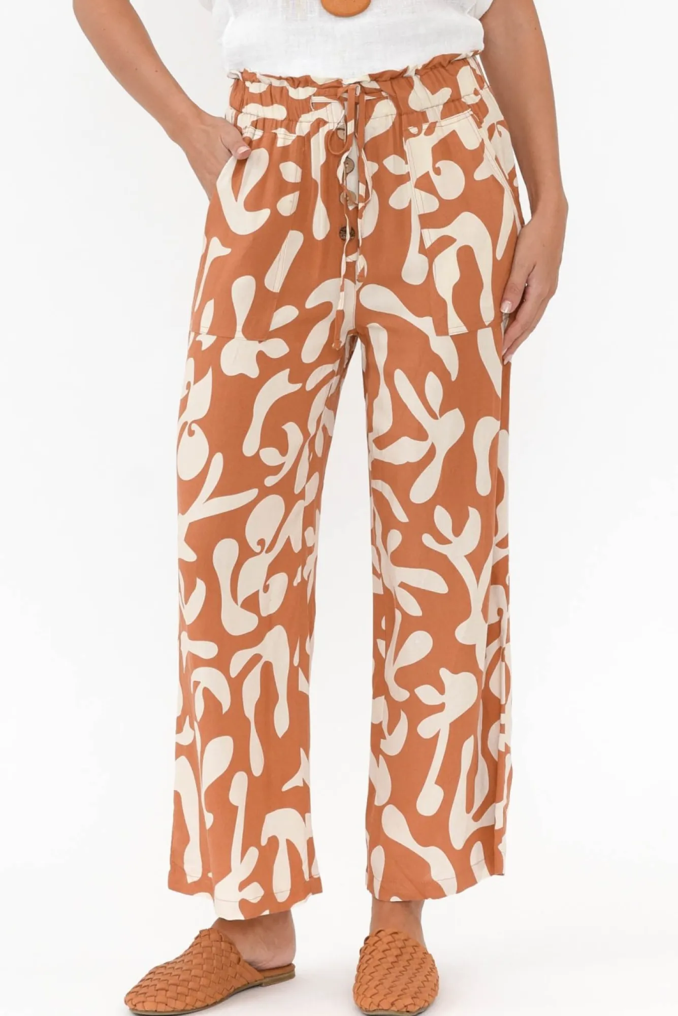 Fit: True To Size. Refer To Size & Fit Tab Below For Specific Size RecommendationNNfabric: 100% RayonNconstructed From Lightweight, Non-Stretch Fabric With A Soft Hand FeelNNelasticated Paper Bag-Style Waistband Designed With An Adjustable Drawstring Nfaux Fly Detailing With Fixed Wooden Buttons For An Everyday Look Nrelaxed Straight-Leg Silhouette Ntwo Generous Front PocketsNfalls To Ankle LengthNNcare: Cool Gentle Hand Wash RecommendedNNcolour: Bold Rust And Cream Abstract Print