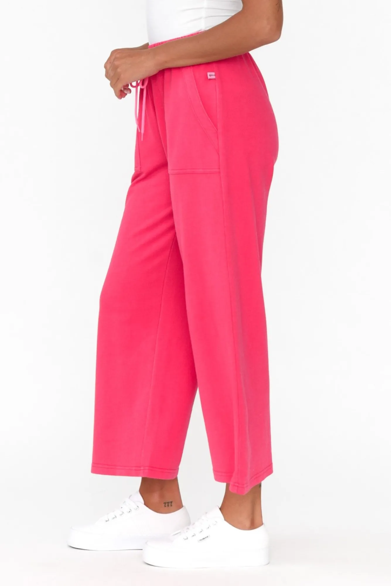 Fit: True To Size. Refer To Size & Fit Tab Below For Specific Size RecommendationNNfabric: Cotton / PolyesterNlightweight, Stretchy Cotton Blend With A Soft Handfeel And Unbrushed Fleece InnerNNruched Elastic Waistband With Drawstring Tie NNsophisticated Wide-Leg SilhouetteNNcropped LengthNtwo Statement Front PocketsNNcare: Cool Gentle Machine Wash RecommendedNNcolour: Hot Pink