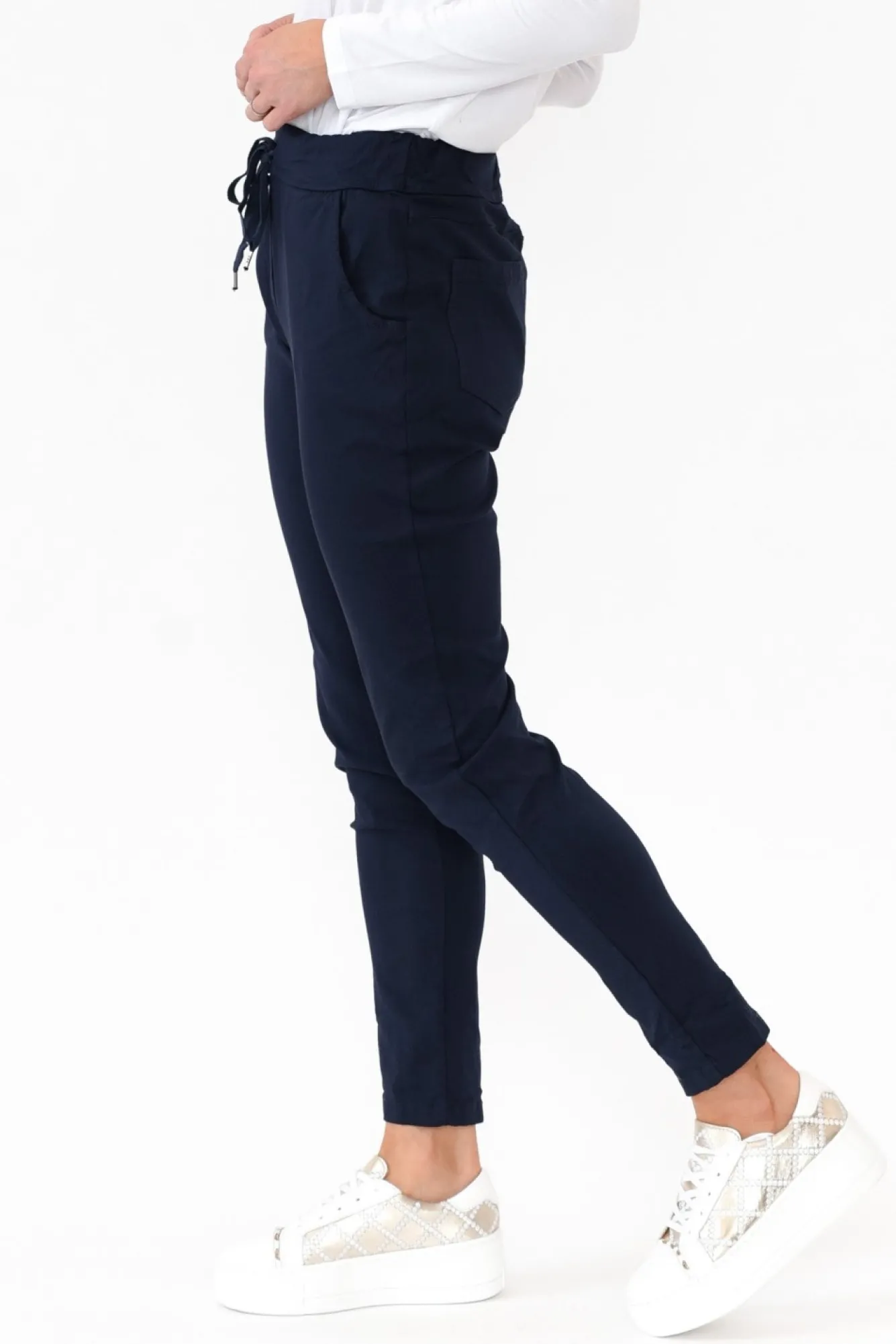 Fit: True To Size. Refer To Size & Fit Tab Below For Specific Size RecommendationNNfabric: 77% Viscose, 18% Nylon, 5% ElastaneNmade In Italy From A Lightweight And Stretchy Crinkle Fabric With A Textured Hand Feel Nwear With A Relaxed Crushed Effect Or Steam For A Sleek LookNstretchy, Ruched Elastic Waistband With A Drawstring Complemented By A Faux FlyNmid-Rise Waist Sits Just Below The NavelNstraight Leg Silhouette Offers Limitless Styling Possibilities!NNfour Functional Pockets – Two At The Front, Two At The Back Nfull Length Falls To The Ankle NNcare: Cool Gentle Machine Wash RecommendedNNcolour: True Navy Blue