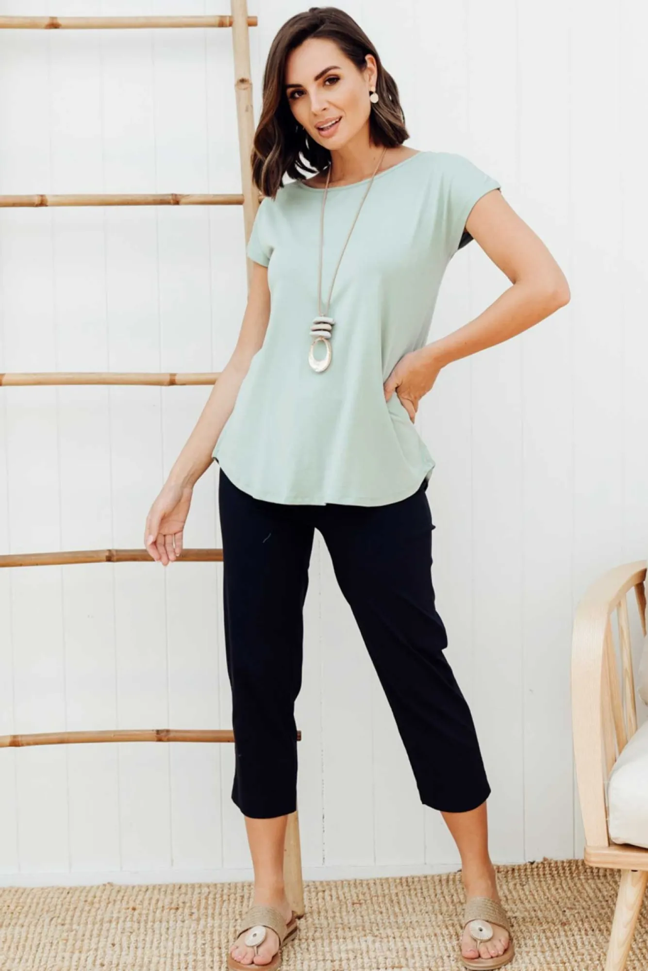 Fit: True. Refer To Size & Fit Tab Below For Specific Size Recommendation NNfabric: 65% Viscose, 30% Nylon, 5% ElastaneNlightweight, Breathable, Silky Stretch Fabric Nelastic On The Back Of The Pant, Leaving The Front Without Elastic Creates A Very Flattering And Elegant Look Ntwo Structural Front PocketsNstraight Leg Ncropped LengthNNcare: Cool Gentle Hand Wash RecommendedNNcolour: Classic Navy Shade