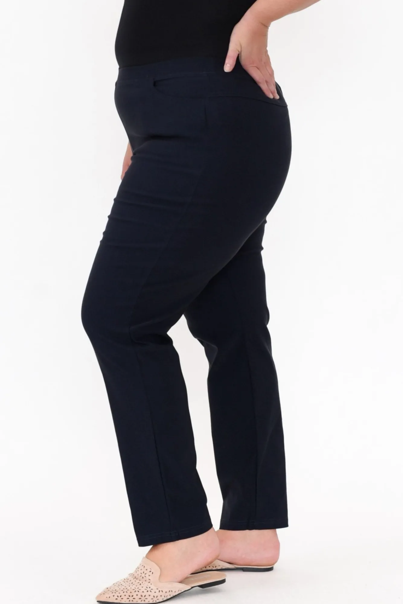 Fit: Runs Slightly Large, If In Between Sizes We Recommend Sizing Down. Refer To Size & Fit Tab Below For Specific Size Recommendation NNfabric: Cotton/PolyesterNcomfortable Ultra-Stretchy Cotton Blend Fabric With A Smooth Hand Feel And Slight Sheen For A Refined Look NNelasticated Waist For Support And Comfort NNsame Flattering Shape As The Jensen Stretch Pant But In A Full-Length Style Nstraight Silhouette With Tapering Near The Hem NNtwo Front Pockets Located Near The Waist Seam Nreaches Ankle Length NNcare: Cool Gentle Hand Wash RecommendedNNcolour: True Navy ShadeNNstyle Tip: Hem Can Be Neatly Cuffed To A Desired Length, Creating A More Cropped LookNN Note:Please See Photos Rather Than Video For Most Accurate Colour.