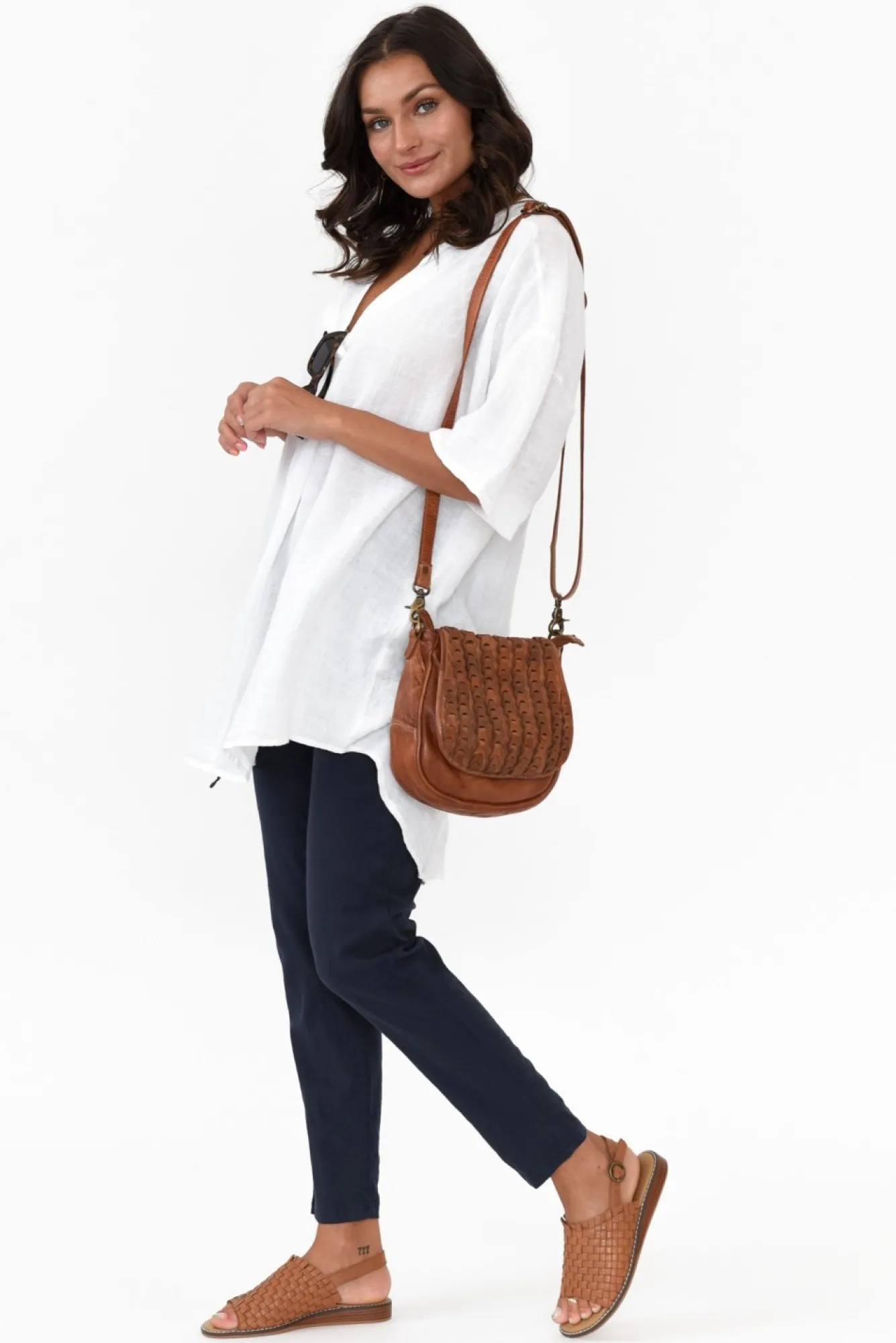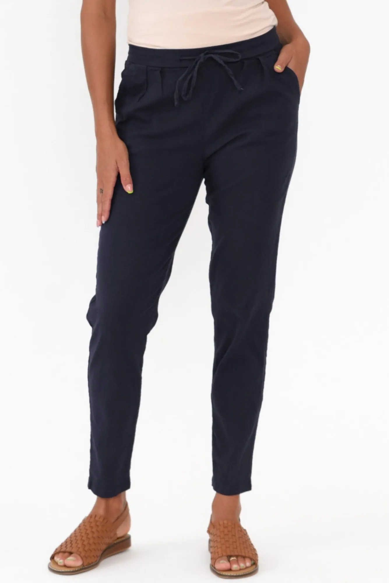 Fit: True To Size. Refer To Size & Fit Tab Below For Specific Size Recommendation NNfabric: 85% Rayon, 12% Linen, 3% Spandex Nwoven Linen Blend With A Textured Feel And Spandex For A Comfortable Stretch NNstretch Waistline With Drawstring TieNNpleated Details At The Waistline Ncropped Length NNstraight Leg Silhouette NNtwo Internal Front Pockets NNcare: Cool Gentle Hand Wash RecommendedNNcolour: Classic Navy