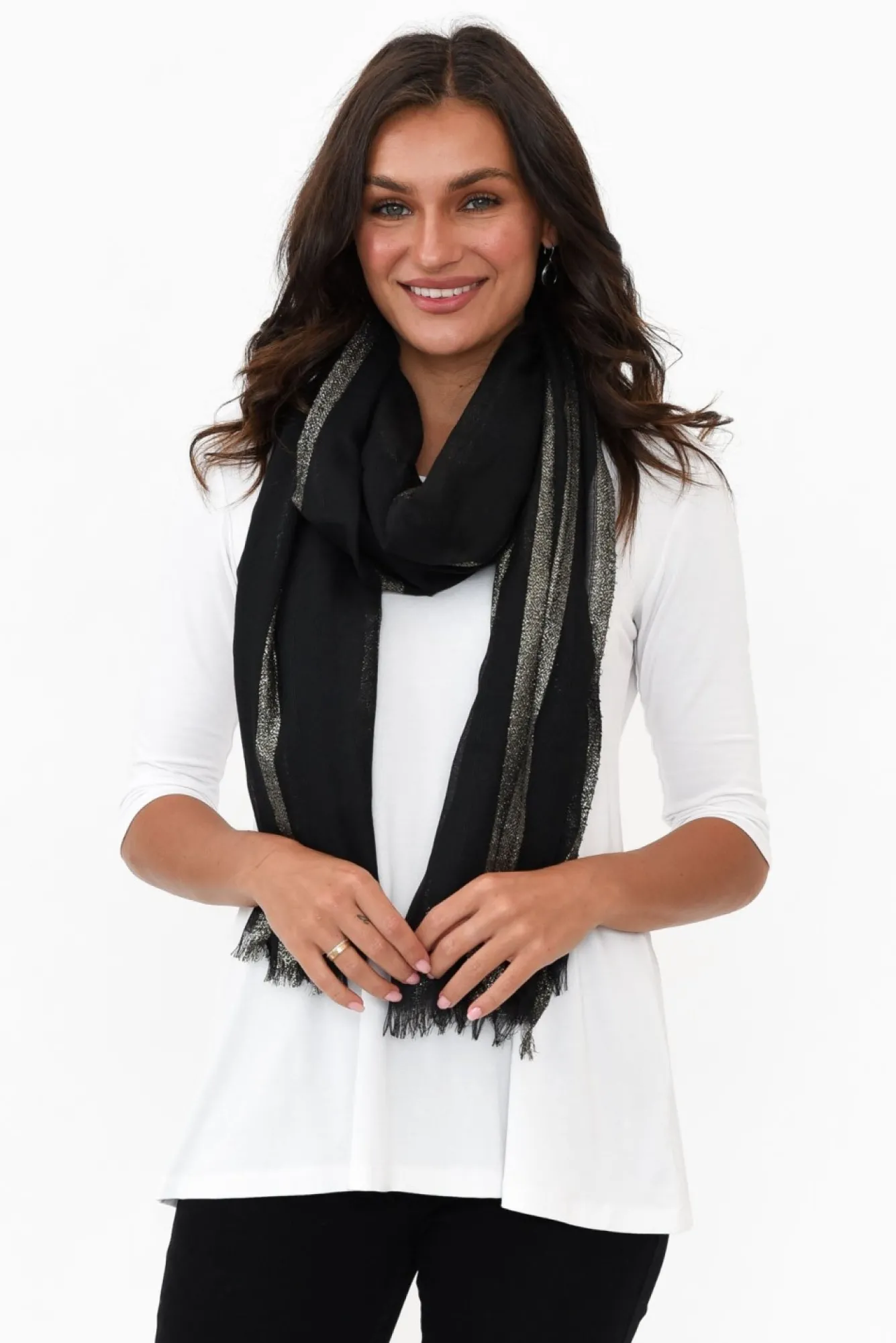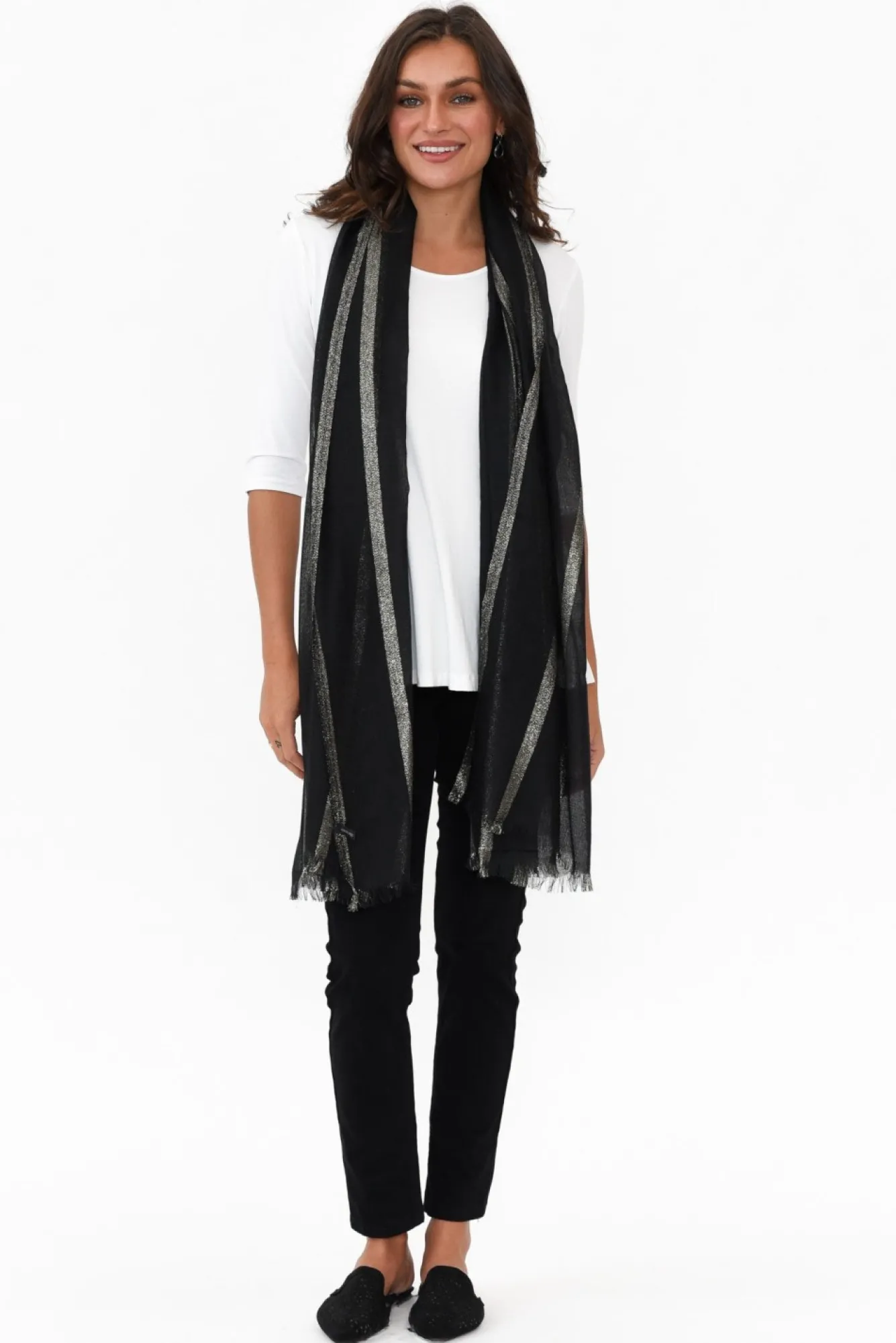 Add A Touch Of Luxury To Your Wardrobe With This Eye-Catching Accessory Ncrafted From A Lightweight And Cosy FabricNfeatures A Sleek Silver Metallic Stripe And Lightly Frayed EdgeNperfect For Layering And Transseasonal WeatherNNcolour: Classic Black With Silver Stripe NNNfabric: 100% PolyesterNcare: Cool Gentle Machine Wash RecommendedNdimensions: 85 X 202 Cm