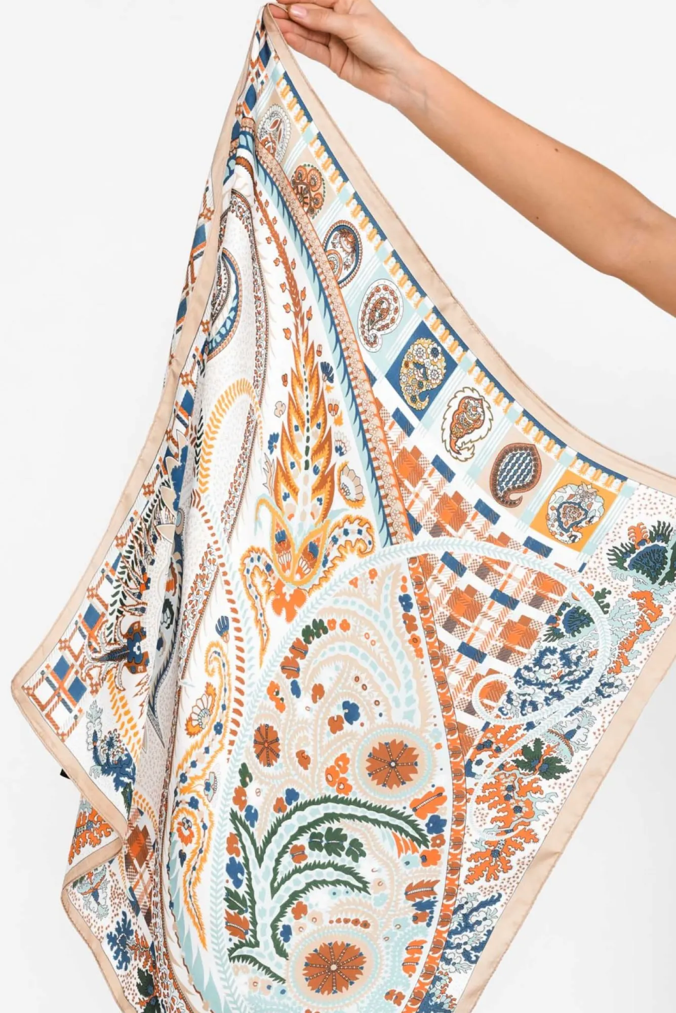 Style This Trendy Scarf Around Your Neck Or Hair, The Options Are Endless!Nsquare Shaped Satin Scarf In A Gorgeous Paisley PrintNNcolour: Beige, Orange, Blue And Green HuesNNNfabric: 100% PolyesterNcare: Cool Gentle Machine Wash RecommendedNNdimensions: 70Cm X 70Cm