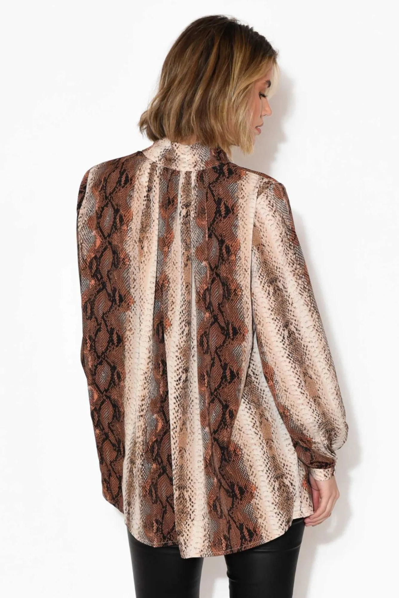 Fit: True To Size. Refer To Size & Fit Tab Below For Specific Size Recommendation NNfabric: 100% PolyesterNlightweight And Luxurious, Chiffon-Like Polyester FabricNhigh Banded Collar Neckline With A Tie-Up V SplitNNfull-Length Billowy Bishop Sleeves With Buttoned CuffNNfeminine Floaty Silhouette With Slight Pleats Falling From The NecklineNNrelaxed, Oversized StyleNNhemline Falls To A Hip LengthNNNcare: Cool Gentle Machine Wash RecommendedNNcolour: On-Trend Brown Snake Print
