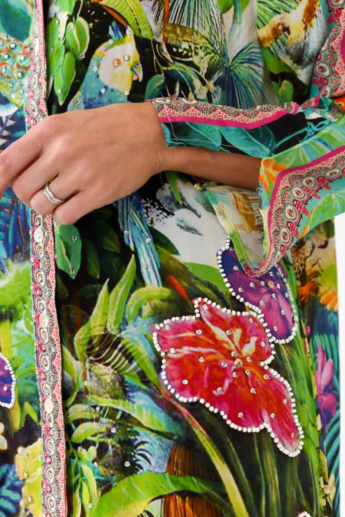 Fit: True To Size. Refer To Size & Fit Tab Below For Specific Size RecommendationNNfabric: 100% SilkNstay Bold And Bright In This Stunning Shirt Made From Lightweight, Semi-Sheer Silk Fabric Designed With A Signature Soft Hand Feel NNsharp Collared Neckline Complements The Pearlescent Button-Down Front N3/4 Length Sleeves With A Small Split At The CuffsNNeffortless Drape SilhouetteNbeaded Embellishments Featured On The Front, Collar And PlacketNfalls To Hip-Skimming Length NNNcare: Specialist Dry Clean OnlyNNcolour: Graphic Tropical Print In Hues Of Green And Pink