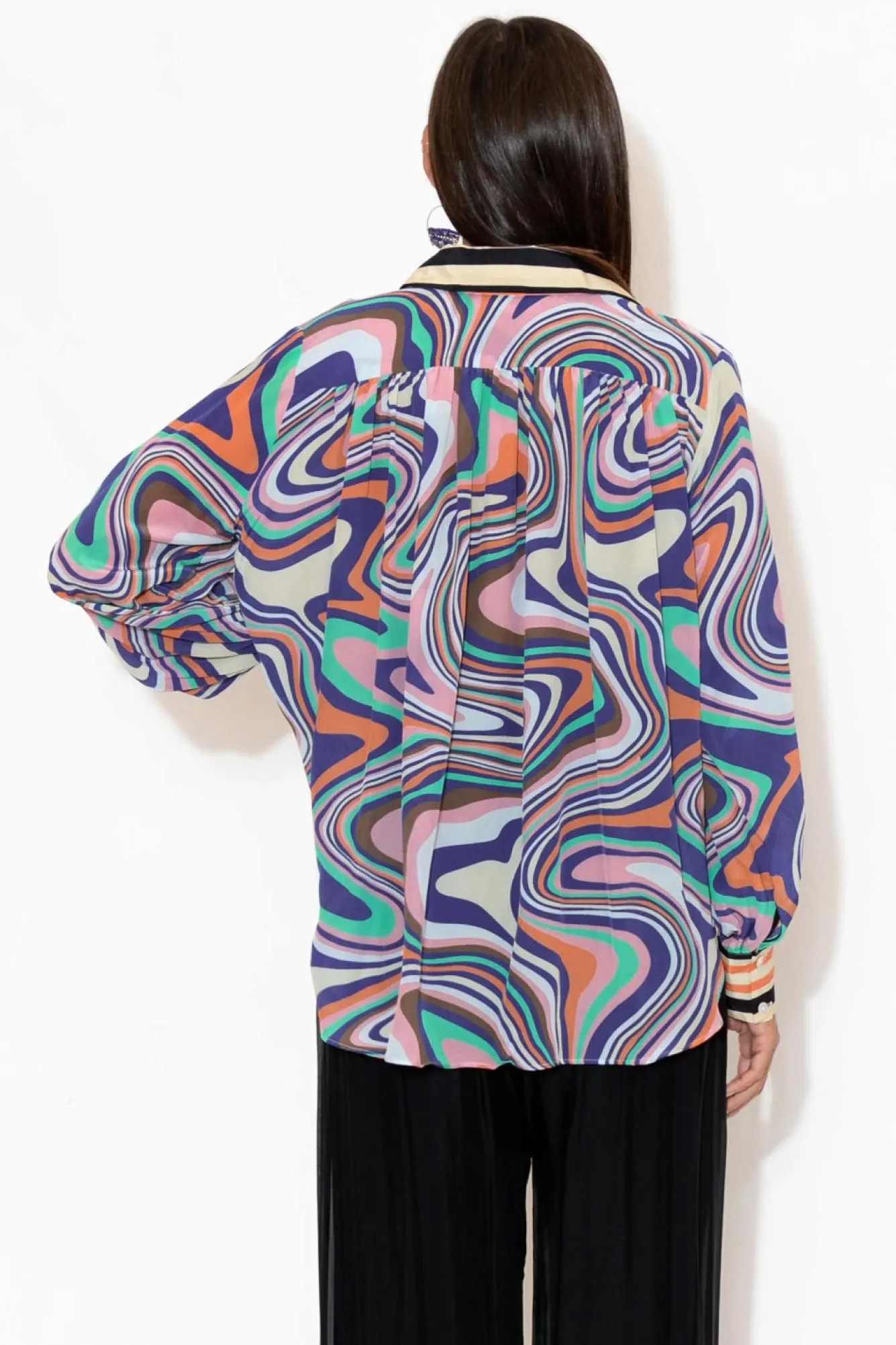 Fit: True To Size. Slightly Oversized Fit. Refer To Size & Fit Tab Below For Specific Size Recommendation NNfabric: 100% SilkNmake A Statement In The Office With This Trendy, Non-Stretch Silk GarmentNhidden Button-Down Style With Structured CollarNextra Long Statement Puff Sleeve With Thick Buttoned, Embellished CuffNNclassic, Straight Cut Fit NNstraight HemlineNNbelow Hip LengthNNcare: Cool Gentle Hand Wash RecommendedNNcolour: Abstract Ripple Print With Hints Of Blue, Orange And Green