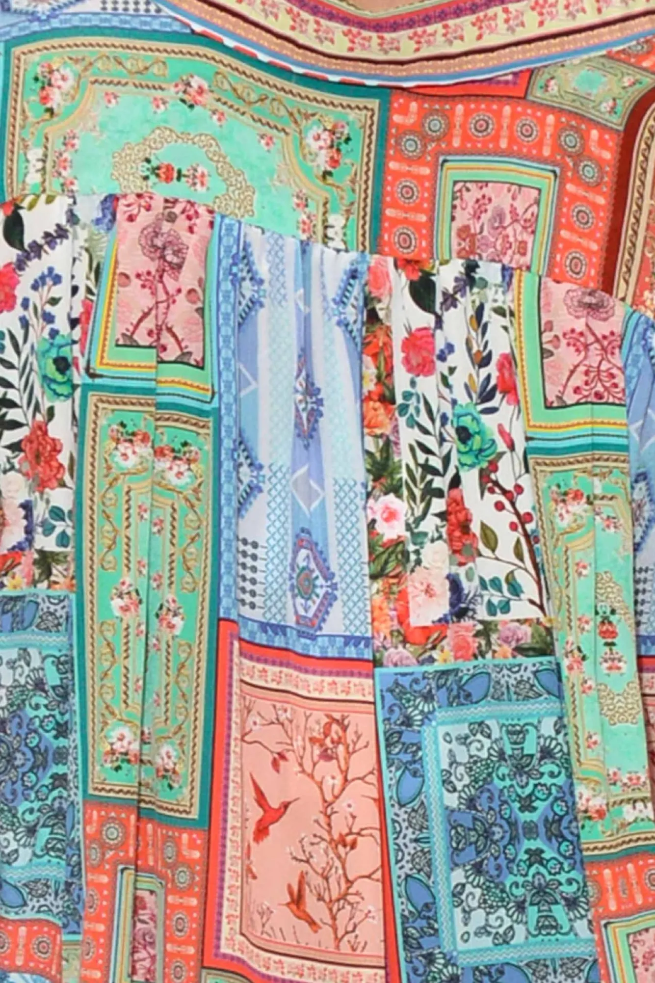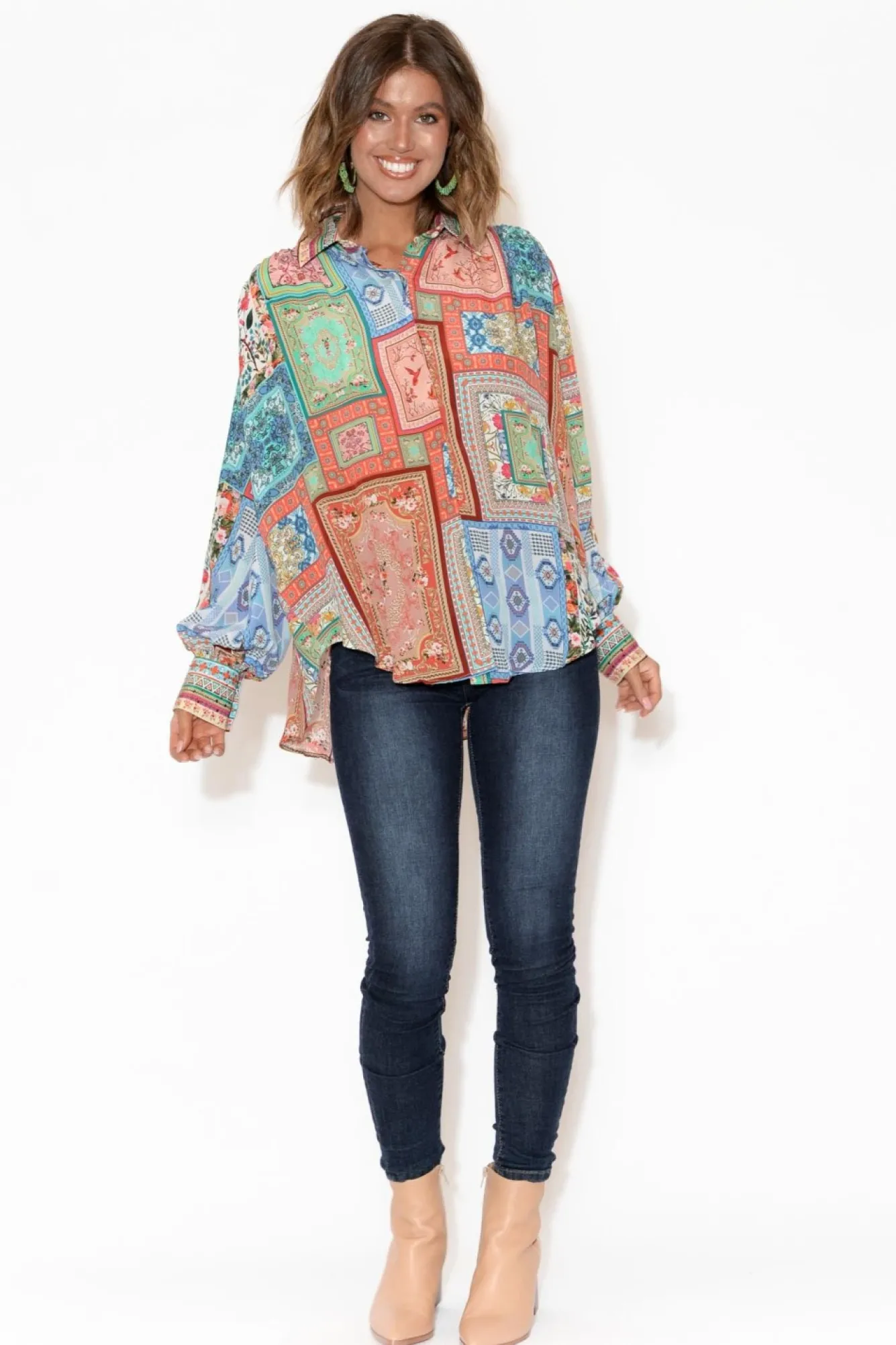 Fit: True To Size. Slightly Oversized Fit. Refer To Size & Fit Tab Below For Specific Size Recommendation NNfabric: 100% SilkNmake A Statement Whether You Are In The Office, Or Walking The Red Carpet, This Trendy, Non-Stretch, Silk Shirt Is Sure To Stand OutNhidden Button-Down Style With Structured CollarNextra Long Statement Puff Sleeve With Thick Buttoned, Embellished CuffNNflattering And Classic, Straight Cut NNstraight HemlineNNbelow Hip LengthNNcare: Cool Gentle Hand Wash RecommendedNNcolour: Bold Red Abstract Print Featuring Intricate Patchwork And Shades Of Blue And Green