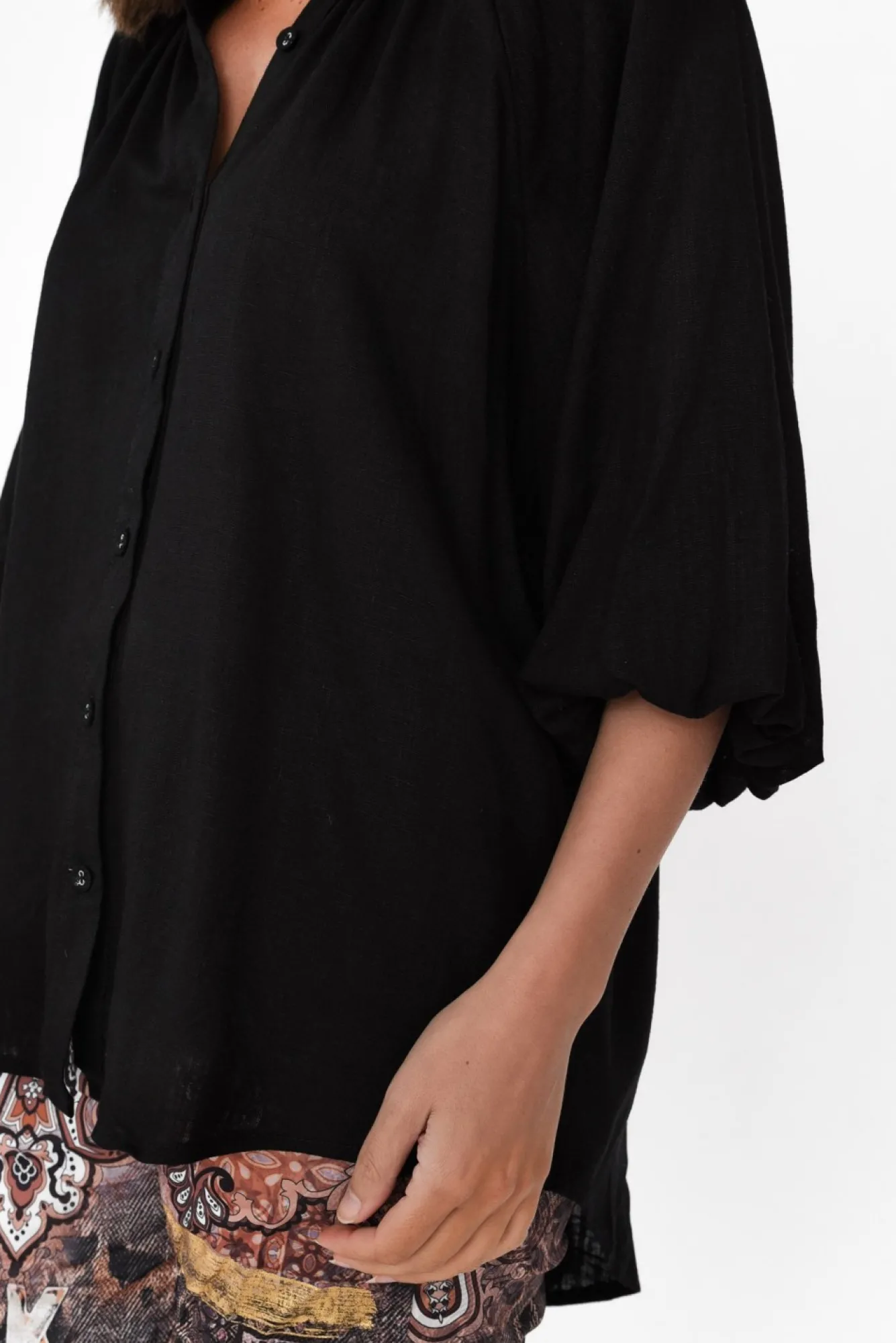 Fit: True To Size. Refer To Size & Fit Tab Below For Specific Size RecommendationNNfabric: 70% Rayon, 30% Linen Nlightweight Fabric Blend With A Linen-Like Woven And Soft Hand FeelNNfeature Pleating Adorns The Collared Neckline, Flowing To A Button FrontNstatement, Double-Lined Puff Sleeves Extend To The Elbow And Finish With An Elastic Cuff Nclassic Straight Silhouette NNhi-Lo Hem Provides More Coverage At The BackNNNcare: Cool Gentle Hand Wash RecommendedNNcolour: Versatile Black