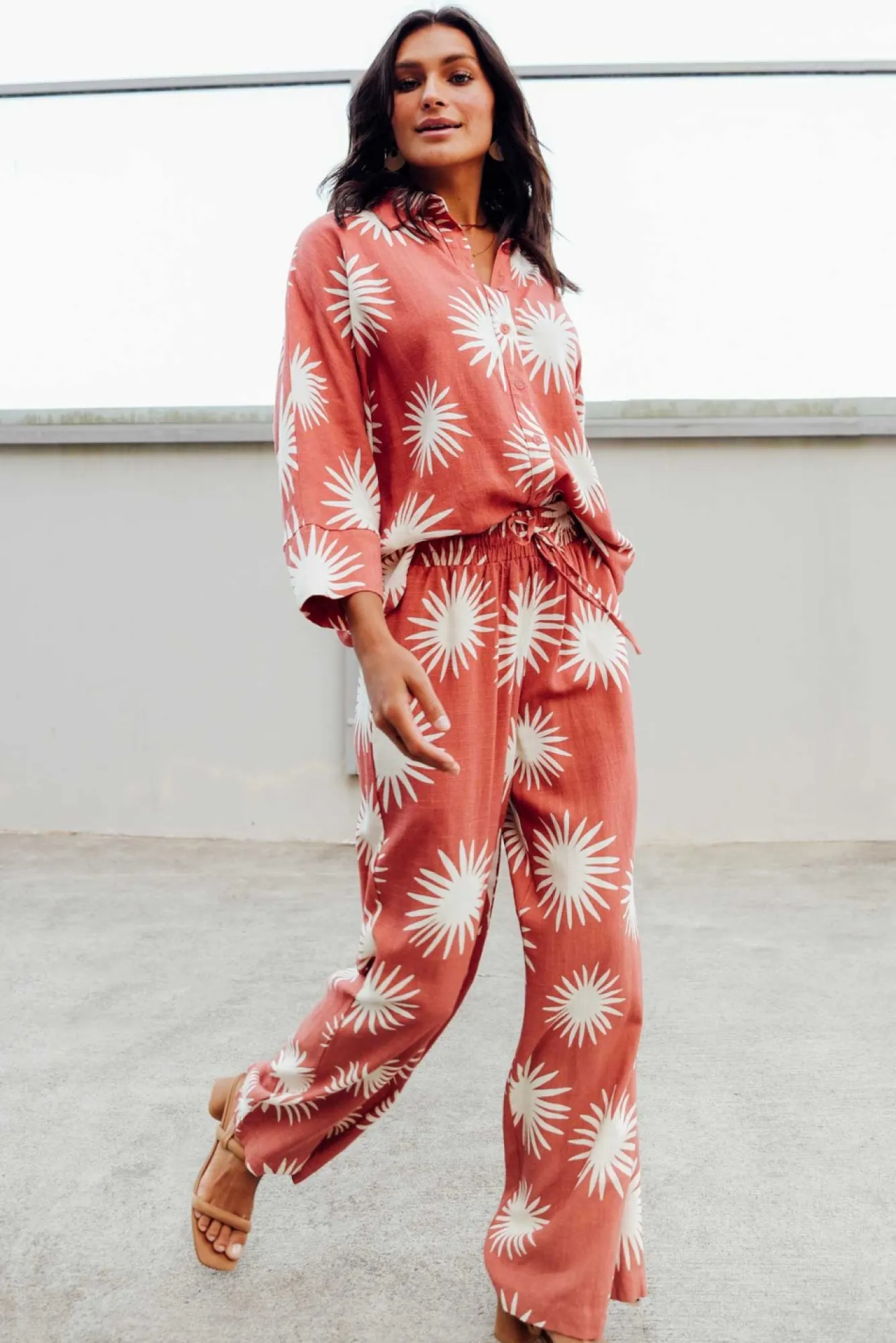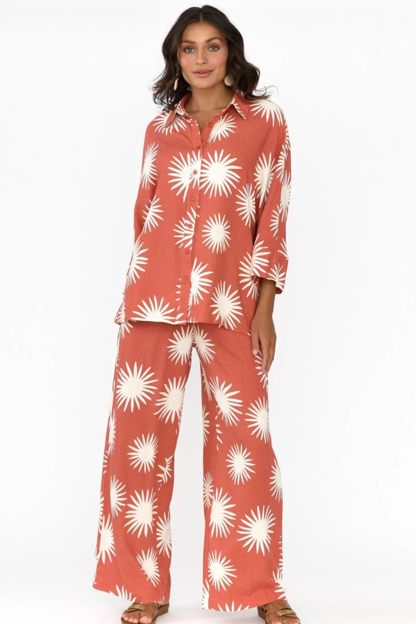 Fit: True To Size. Refer To Size & Fit Tab Below For Specific Size RecommendationNNfabric: 70% Rayon, 30% Linen Nlightweight Fabric Blend With A Soft And Textured Woven Hand Feel NNcollared Neckline Flows To A Buttoned FrontNfull-Length Sleeves Featuring A Drop Shoulder For A Relaxed LookNNdrape Silhouette Flows Over Curves Nstraight Hem Falls Below The HipsNNNcare: Cool Gentle Hand Wash RecommendedNNcolour: Rust Base With A Simple Cream Flower Overlay