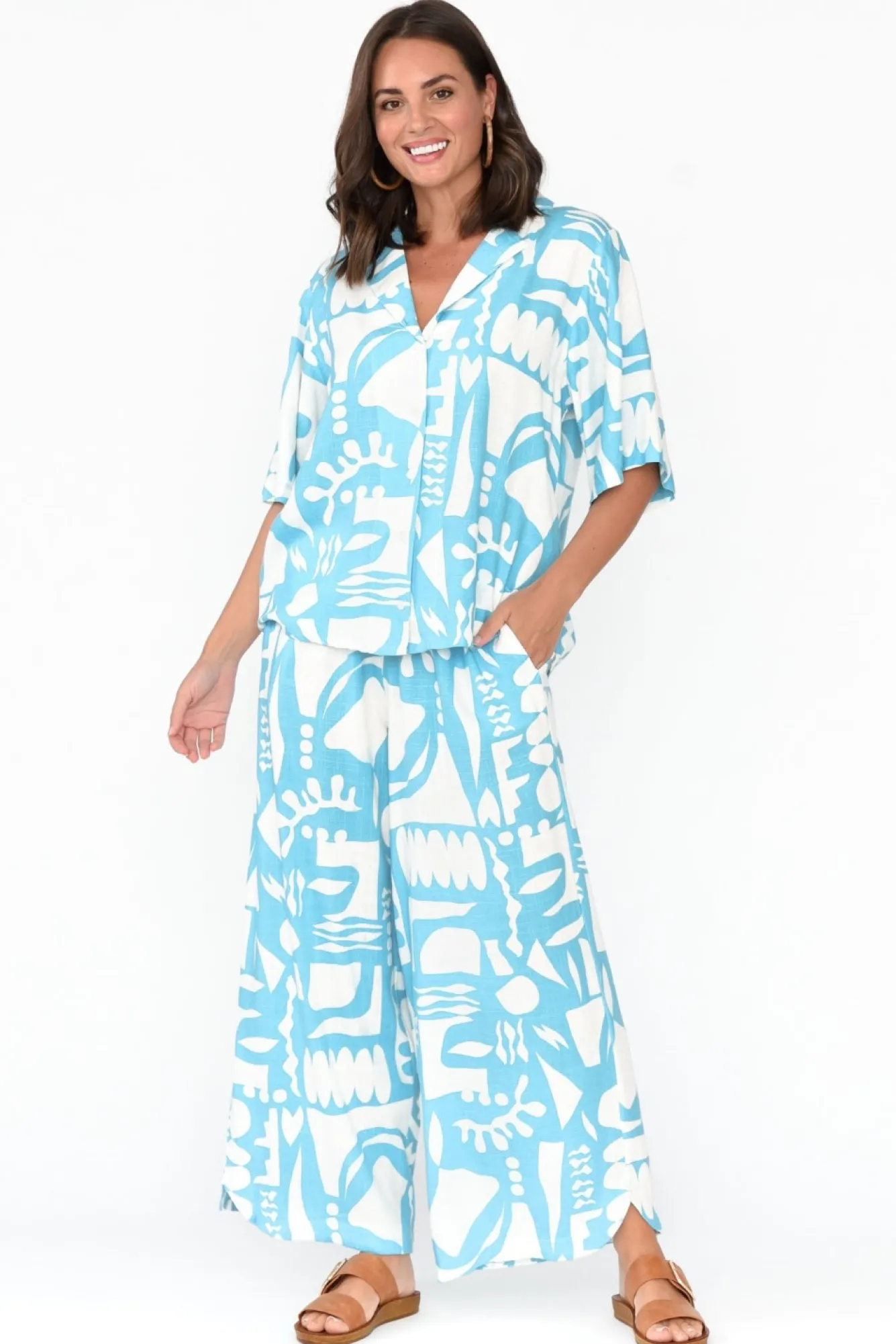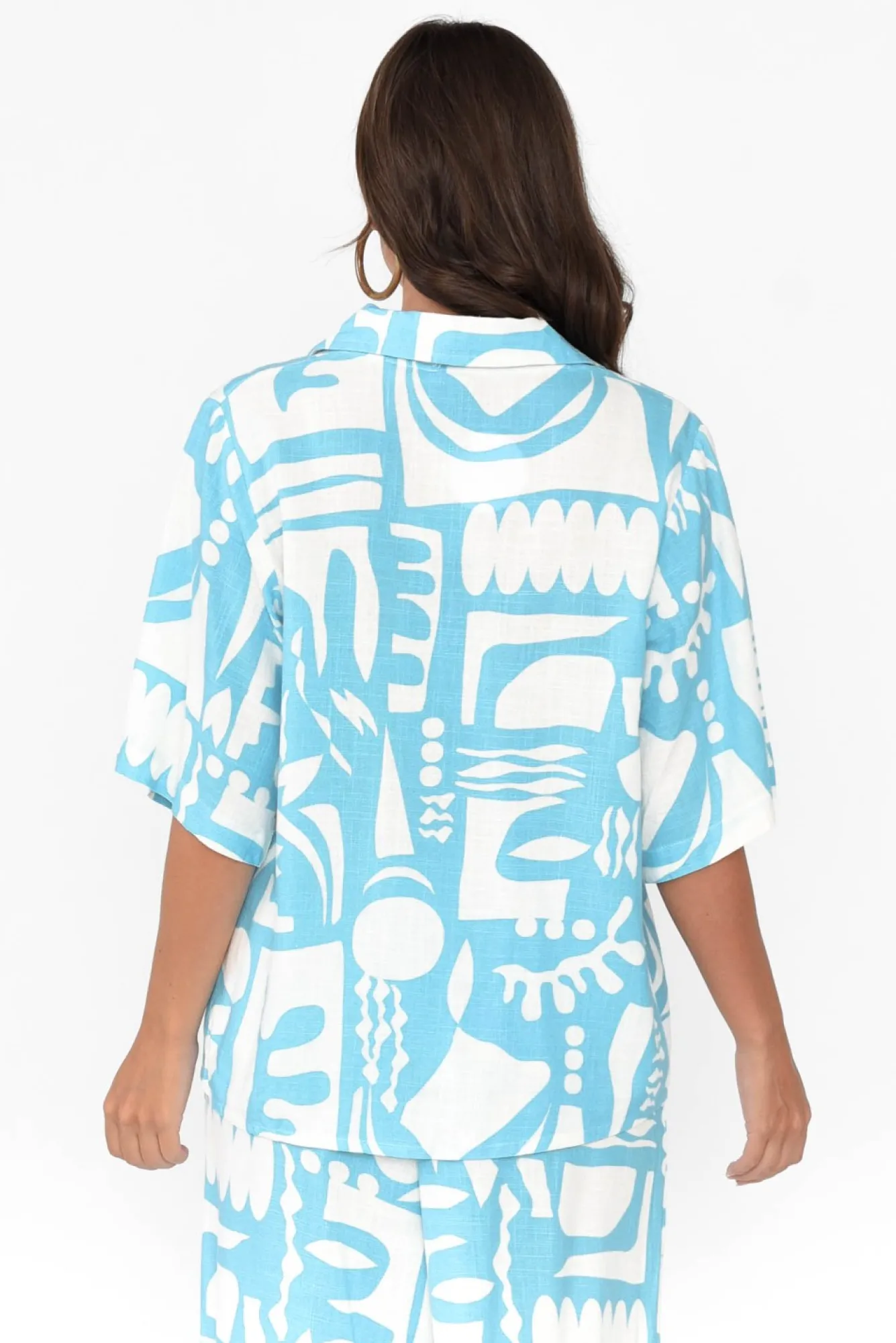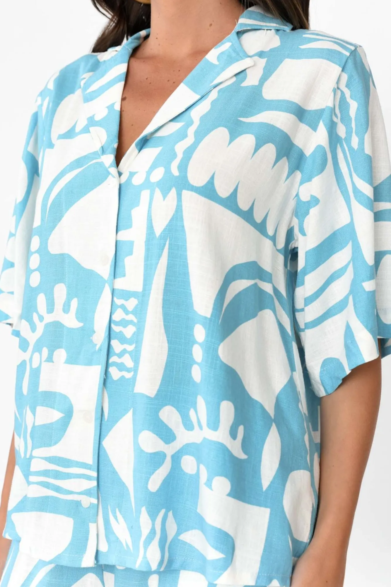 Fit: True To Size. Refer To Size & Fit Tab Below For Specific Size RecommendationNNfabric: 70% Rayon, 30% Linen Nlightweight Fabric Blend With A Classic Soft And Woven Linen TextureNNcollared Neckline Flows To A Button FrontNNhalf-Length Sleeves Drape In An Oversized Fit For A Relaxed LookNNboxy Silhouette For All-Day Comfort And Easy Layering Over Swimwear Nstraight Hem Falls Just Above The HipsNNNcare: Cool Gentle Hand Wash RecommendedNNcolour: White Base With An Abstract Sky Blue Overlay