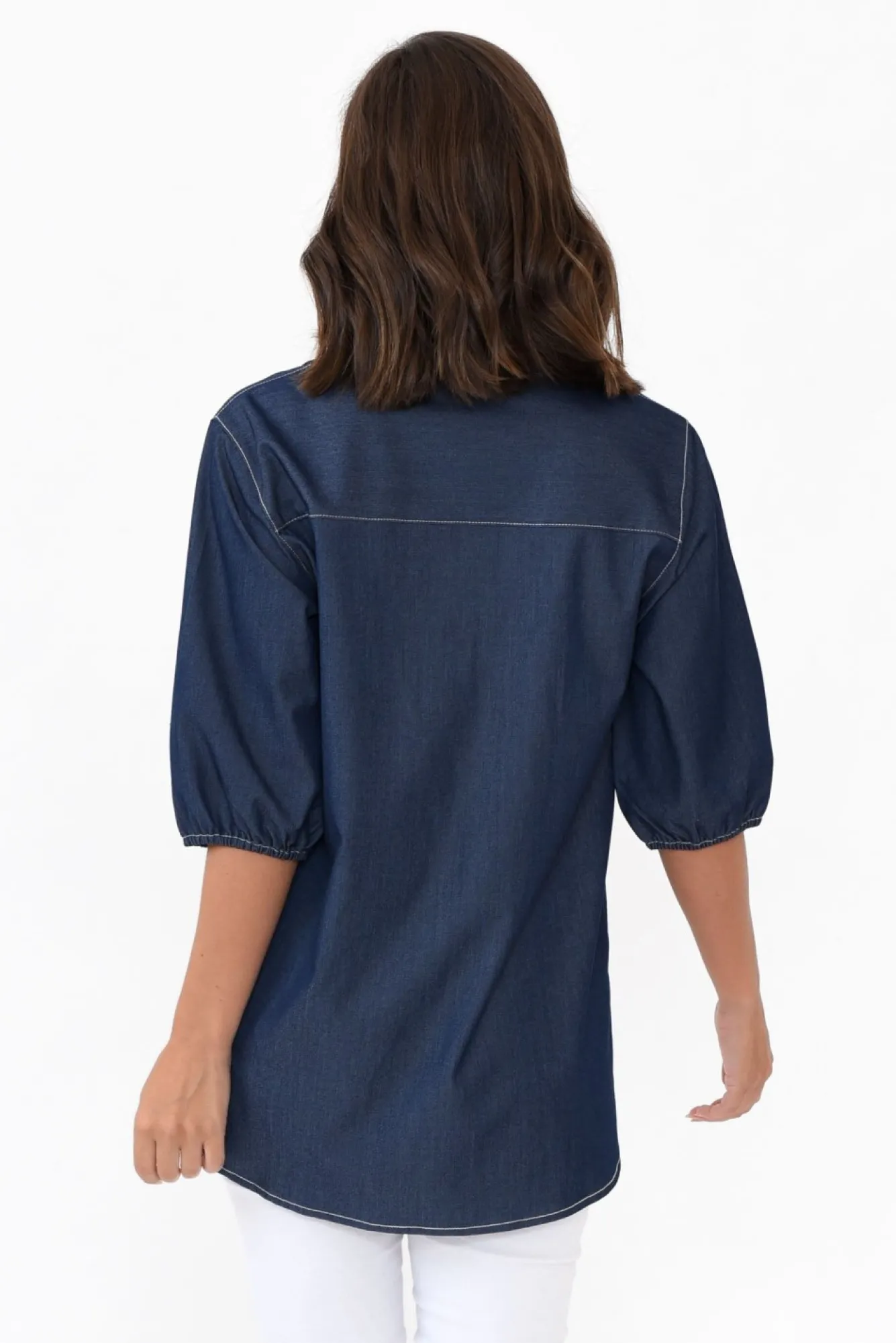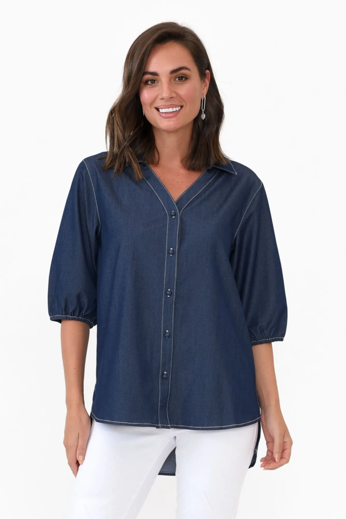 Fit: True To Size. Refer To Size & Fit Tab Below For Specific Size RecommendationNNfabric: 75% Tencel, 20% Rayon, 5% SpandexNlightweight, Non-Stretch Fabric With A Lovely Soft Hand Feel And Denim Look FinishNcollared Neckline Flows To A Button Front NNcontrast Stitching Throughout Elevates This StyleNhalf-Length Puff Sleeves With A Loose Elastic CuffNNstraight Silhouette Flows Over CurvesNNhi-Lo Hem Provides More Coverage At The Back With Splits At The Sides For Ease Of MovementNhip-Skimming LengthNNcare: Cool Gentle Hand Wash RecommendedNNcolour: Washed Denim Blue