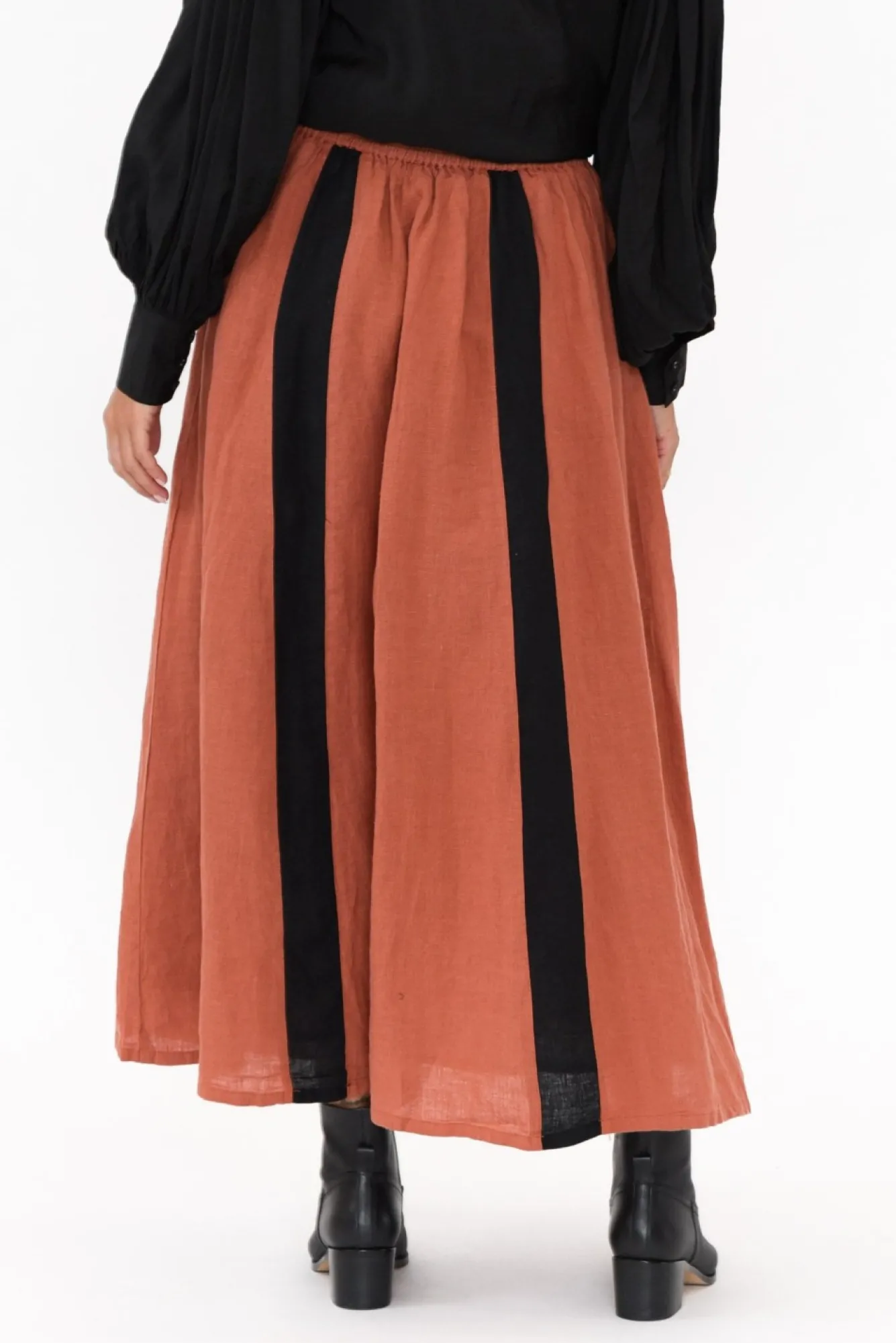 Fit: True To Size. Refer To Size & Fit Tab Below For Specific Size RecommendationNNfabric: Shell: 100% Linen Lining: 100% CottonNperfectly Lightweight And Breathable Linen With The Classic Textured Woven Hand FeelNNsoft Cotton Lining For Extra Comfort And Coverage Nstretchy Elastic Waistband Flatters The WaistNNcontrast Black Panelling At The Front And Back Add DimensionNbillowy A-Line Silhouette Flows Over The Hips Without ClingingNclassic Straight Hem Length Falls To A Midi Length NNcare: Cool Gentle Machine Wash RecommendedNNcolour: Stunning Rust Hue With Black Panelling