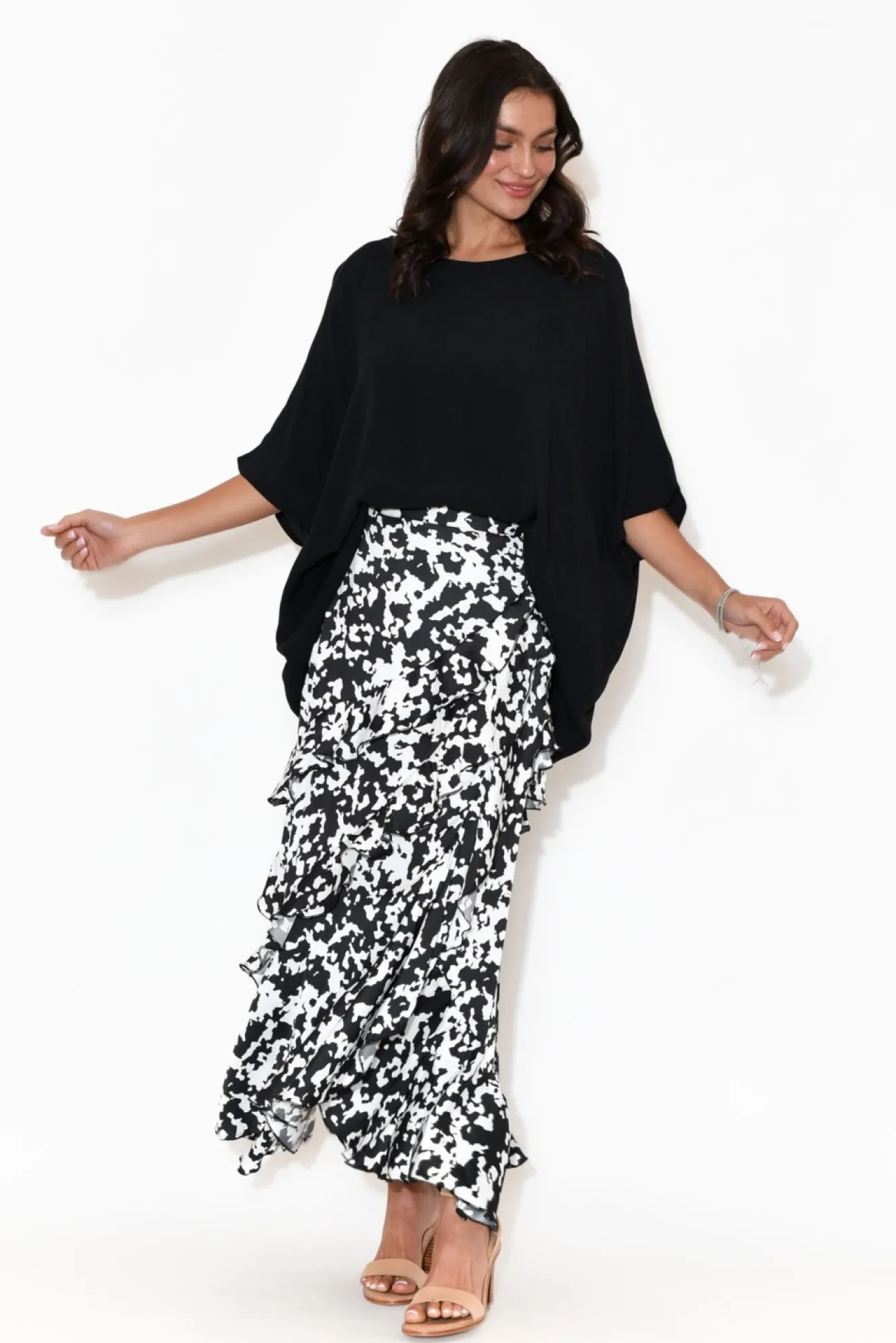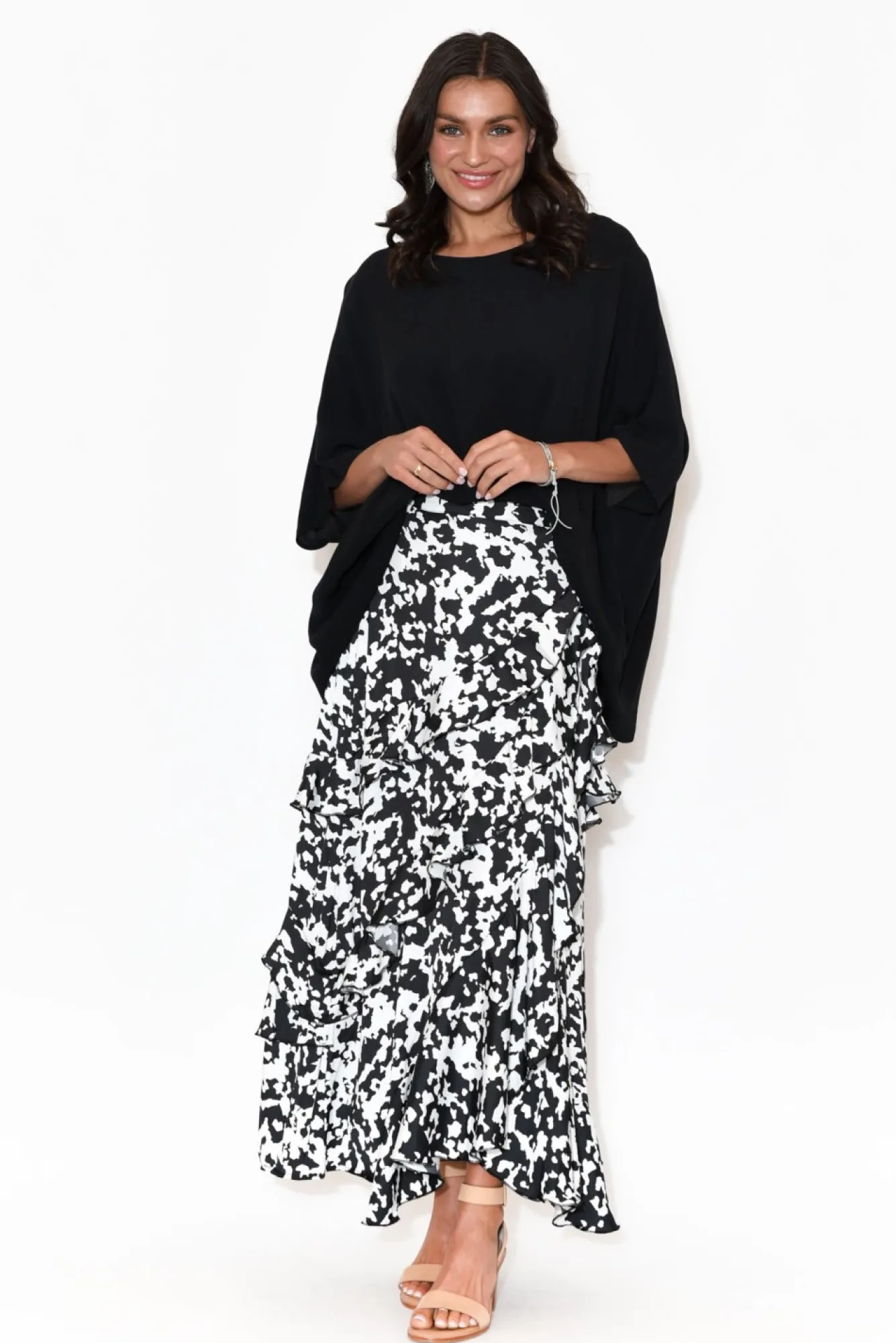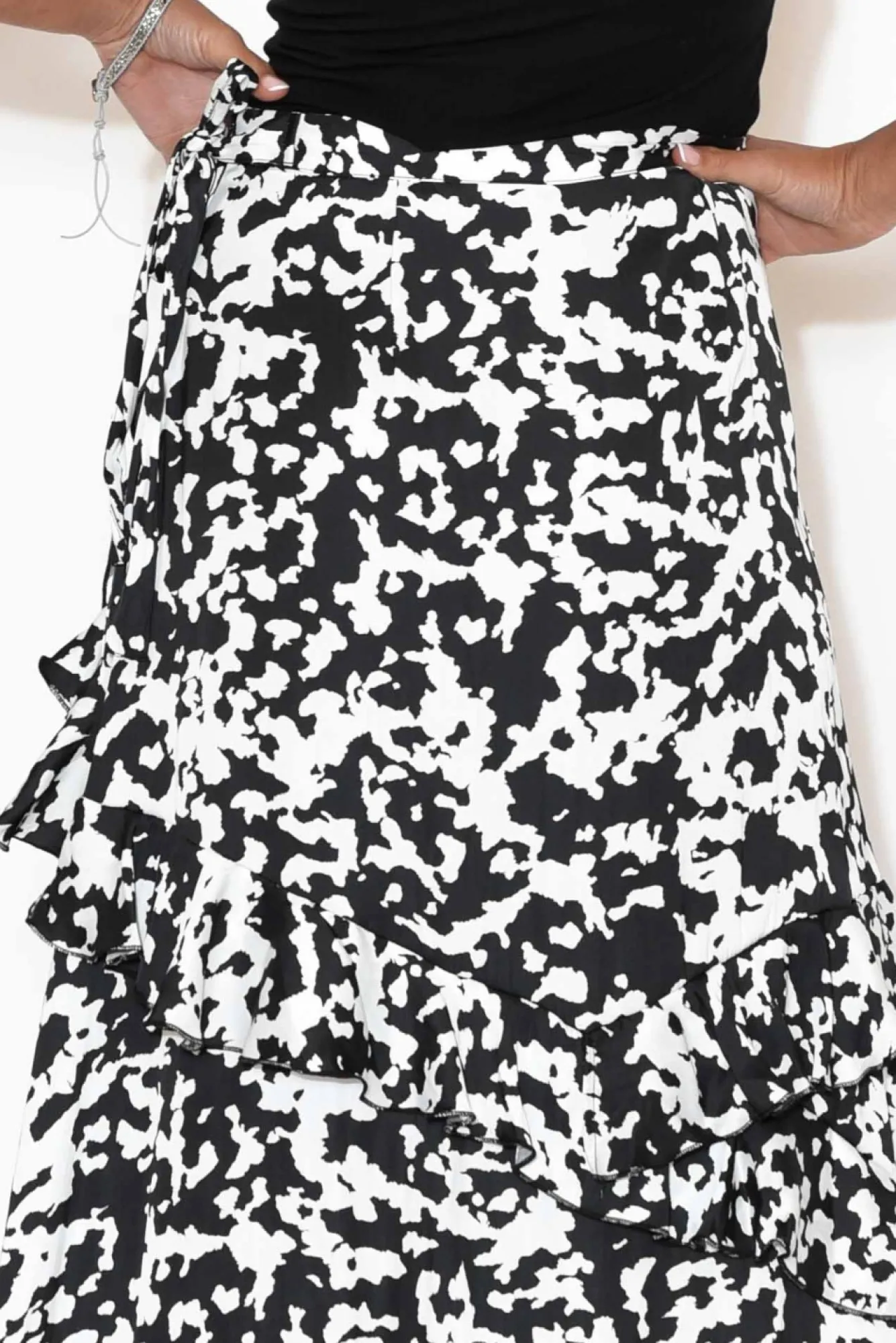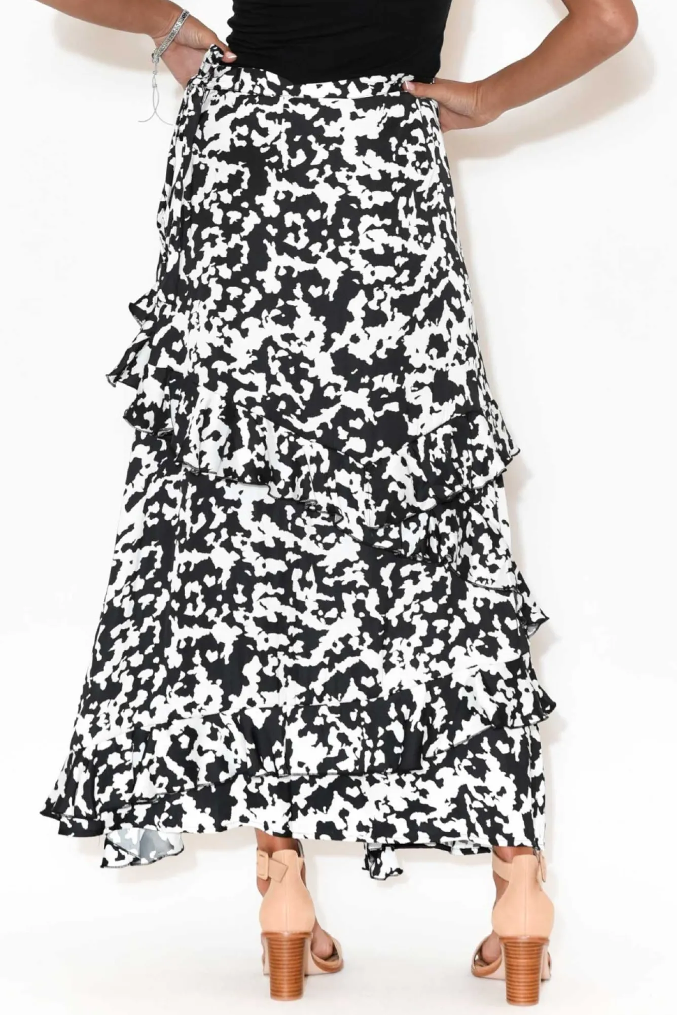 Fit: Runs Small. Refer To Size & Fit Tab Below For Specific Size Recommendation NNfabric: PolyesterNan Elegant, Silky-To-Touch Event Style In A Beautiful Abstract PrintNNnon-Stretch Waistband With Zip And Hook And Eye Closure At The Hip Increases Functionality And Ease Of Wear Ndisguise The Zip With The Attached Waist Tie – Imitate A Wrap Style Skirt Without The Fuss!Ntrue A-Line Flare Accentuated By Dramatic, Slanted Ruffled TiersNasymmetric Hemline Falls Effortlessly To Maxi LengthNNNcare: Cool Gentle Machine Wash RecommendedNNcolour: Large Black And White Speckled Print