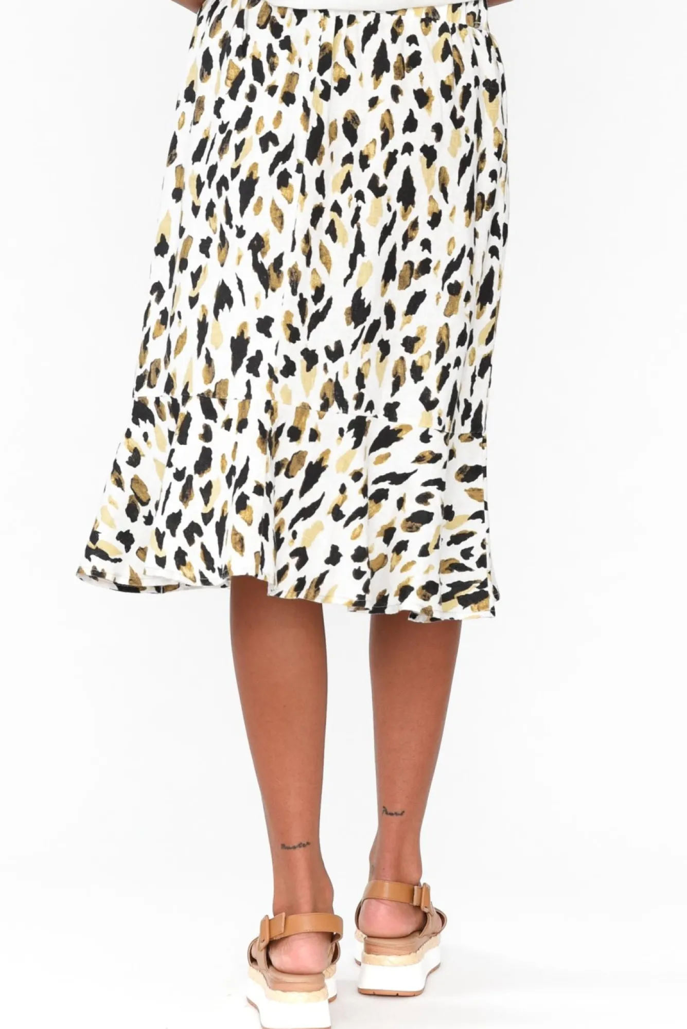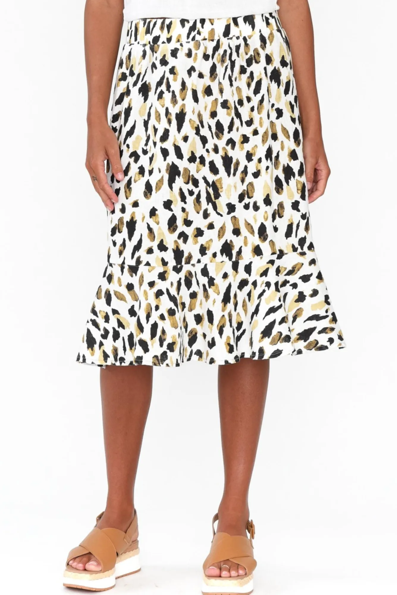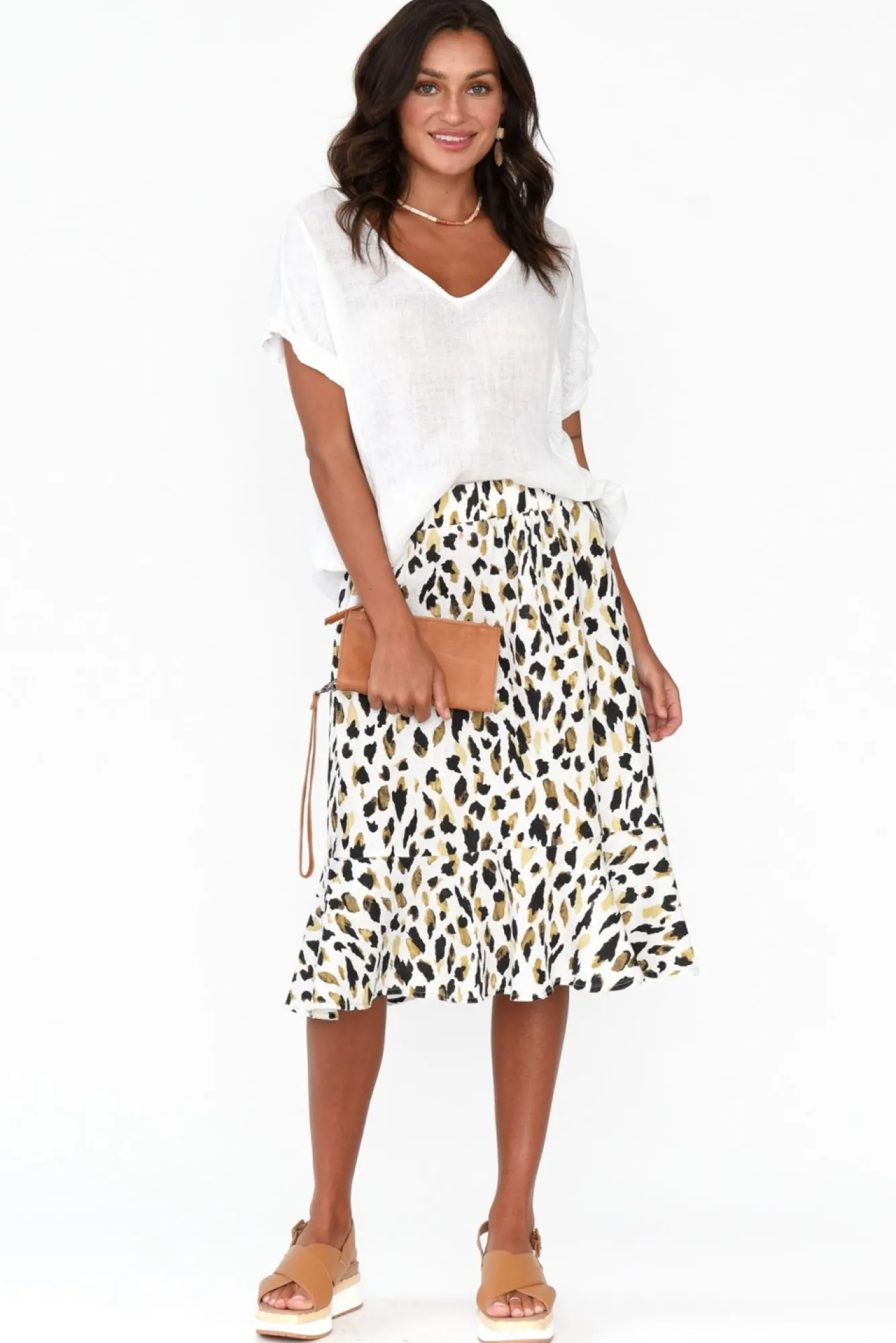 Fit: True To Size. Refer To Size & Fit Tab Below For Specific Size RecommendationNNfabric: 100% LinenNlightweight And Breathable Linen Skirt With A Classic Woven Hand FeelNstretchy, Ruched Waistband Sits At A Mid-Rise And Is Wide For A Supportive FeelNfeminine A-Line Silhouette For Ease Of MovementNNfrill Hem Falls To A Below-Knee LengthNNcare: Cool Gentle Hand Wash RecommendedNNcolour: White Base With A Yellow And Black Animal Print