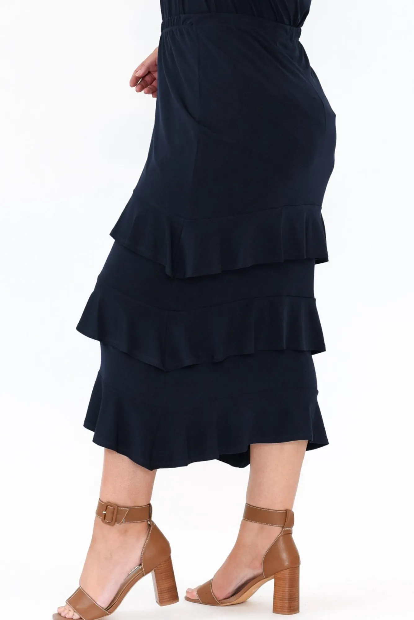 Fit: True To Size. Refer To Size & Fit Tab Below For Specific Size RecommendationNNfabric: 95% Polyester, 5% SpandexNultra-Stretchy Fabric With A Lovely Flowing Drape And A Smooth, Sheened Finish Nproudly Made In AustraliaNstretchy Elastic Waistband So You Don’T Have To Sacrifice Comfort For StyleNNtiered Tulip Silhouette That Tapers At The Hem For A Flattering Fit NNstunning Ruffle Details From Below The Hips To The Hem Elevate The LookNNslightly Curved Hem Falls To A Midi Length NNcare: Cool Gentle Machine Wash RecommendedNNcolour: True Navy Blue