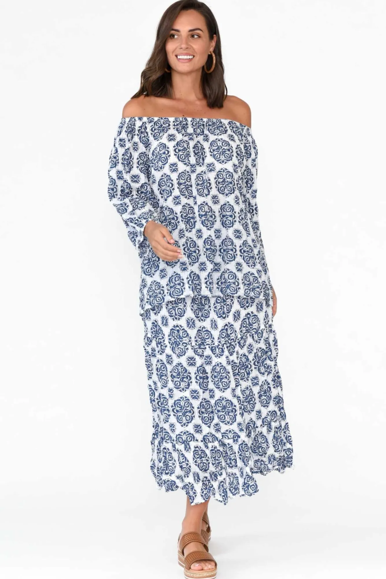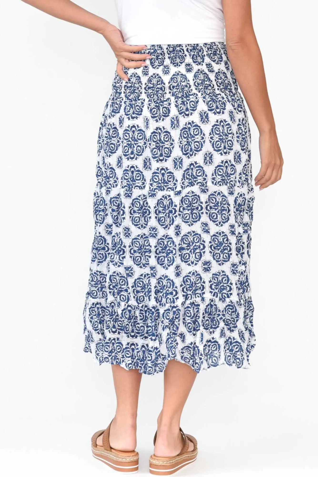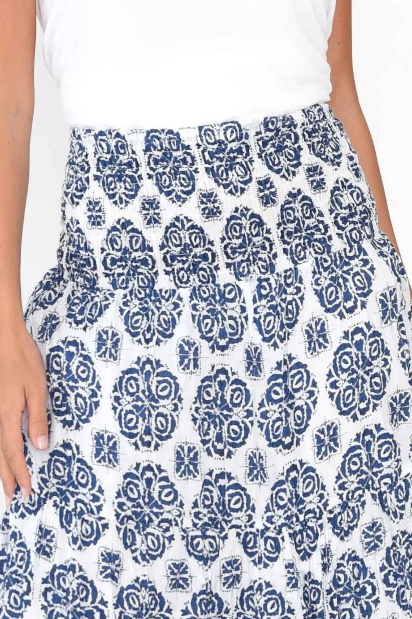 Fit: True To Size. Refer To Size & Fit Tab Below For Specific Size RecommendationNNfabric: 100% Cotton Nlightweight And Breathable Crinkle Cotton Skirt With A Lovely Woven, Non-Stretch Hand FeelNcrinkle Cotton Is The Ultimate Fuss-Free Fabric – Keep The Crinkle Effect By Storing Rolled UpNwide, Ruched, Elastic Waistband Supports The MidlineNNknee Length Lining For Additional CoverageNcan Be Worn High-Waisted For A Midi Length Or Lower For A Maxi Length NNa-Line Tiered Skirt Creates A Timeless, Polished LookNNcare: Cool Gentle Hand Wash RecommendedNNcolour: White Base With A Lovely Blue Damask Pattern