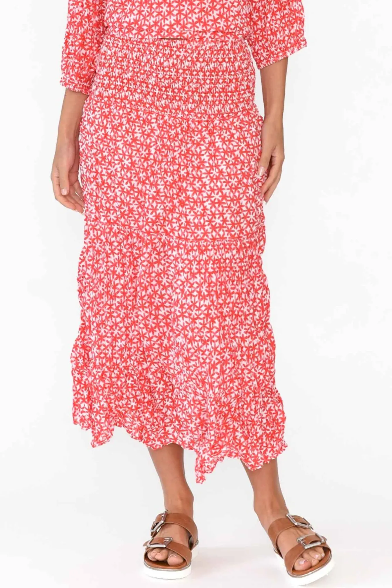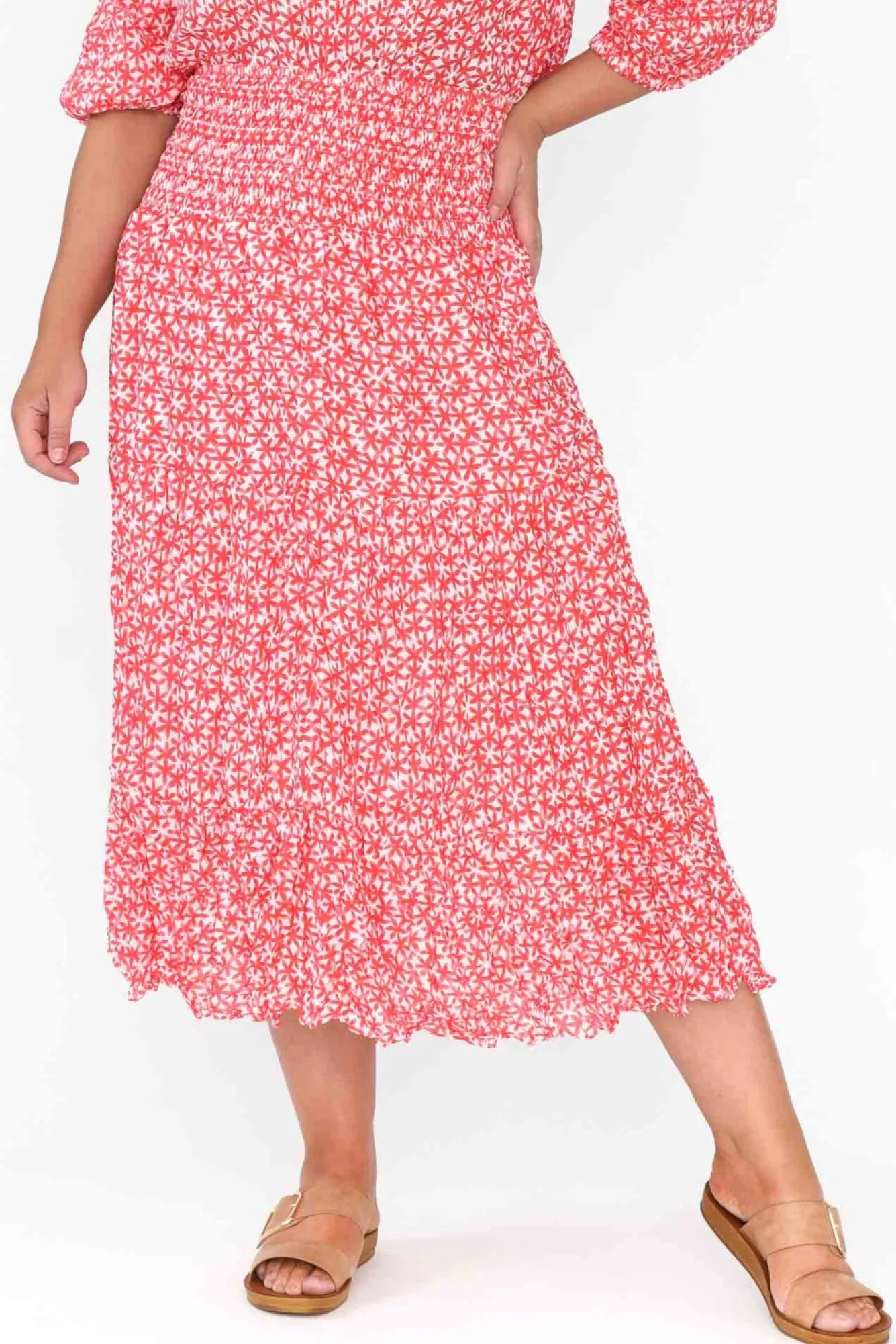 Fit: True To Size. Refer To Size & Fit Tab Below For Specific Size RecommendationNNfabric: 100% Cotton Nlightweight And Breathable Crinkle Cotton Skirt With A Lovely Woven, Non-Stretch Hand FeelNcrinkle Cotton Is The Ultimate Fuss-Free Fabric – Keep The Crinkle Effect By Storing Rolled UpNNwide, Ruched, Elastic Waistband Supports The MidlineNNknee Length Lining For Additional CoverageNcan Be Worn High-Waisted For A Midi Length Or Lower For A Maxi Length NNfloaty A-Line Tiered Silhouette Flatters All Body Types NNcare: Cool Gentle Hand Wash RecommendedNNcolour: White Base With A Dainty Red Floral Pattern