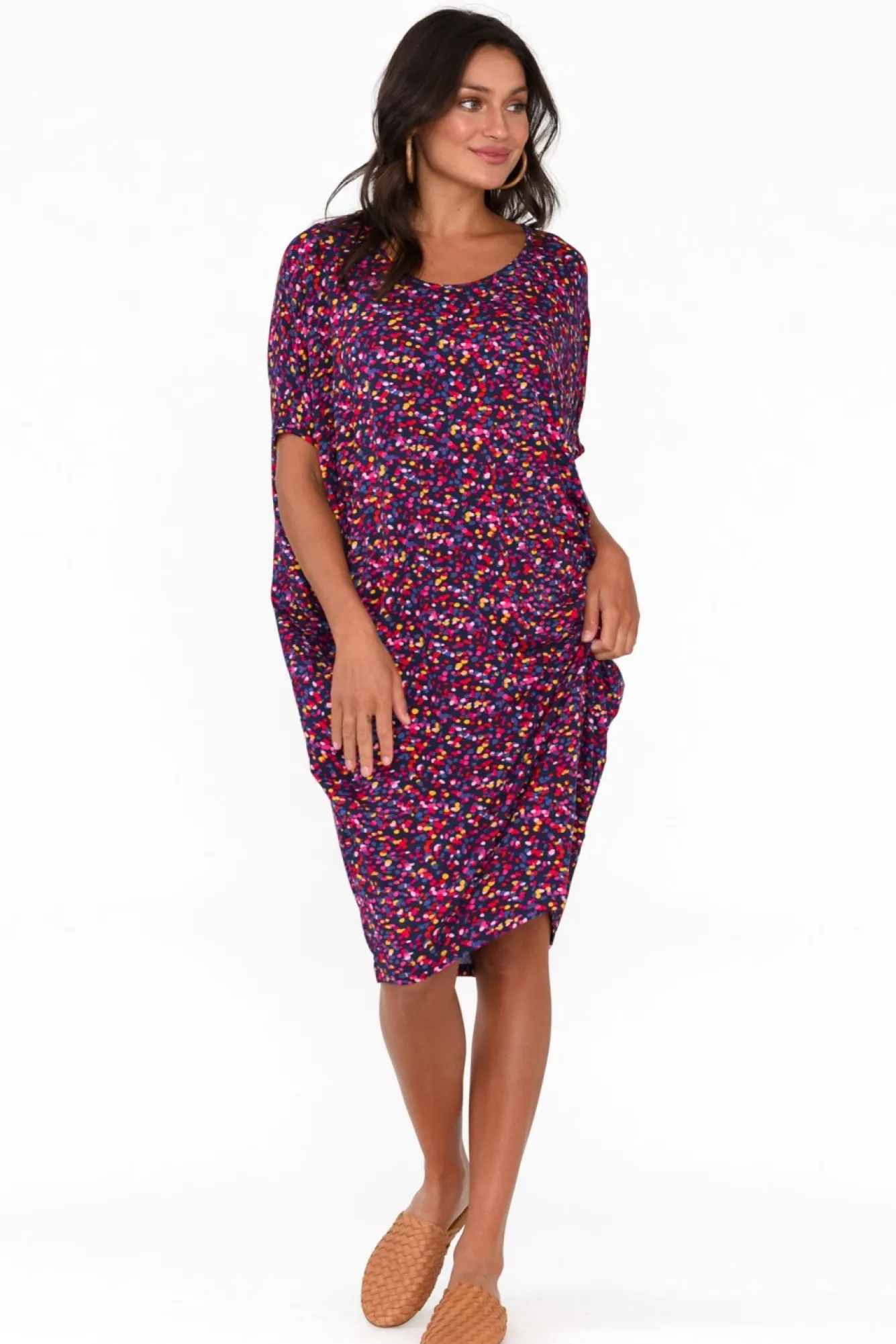 Fit: Oversized. Refer To Size & Fit Tab Below For Specific Size RecommendationNNfabric: Viscose/ElastaneNa Lightweight And Comfortable Drape Dress Made From Soft And Stretchy FabricNwide Round NecklineNchic Batwing Sleeves Provide Upper Arm CoverageNrelaxed Silhouette Drapes Through The Torso And Tapers At The HemNhemline Falls To The Knee For An Everyday Look NNcare: Cool Gentle Hand Wash RecommendedNNNcolour: Navy With Multicolour Confetti Overlay