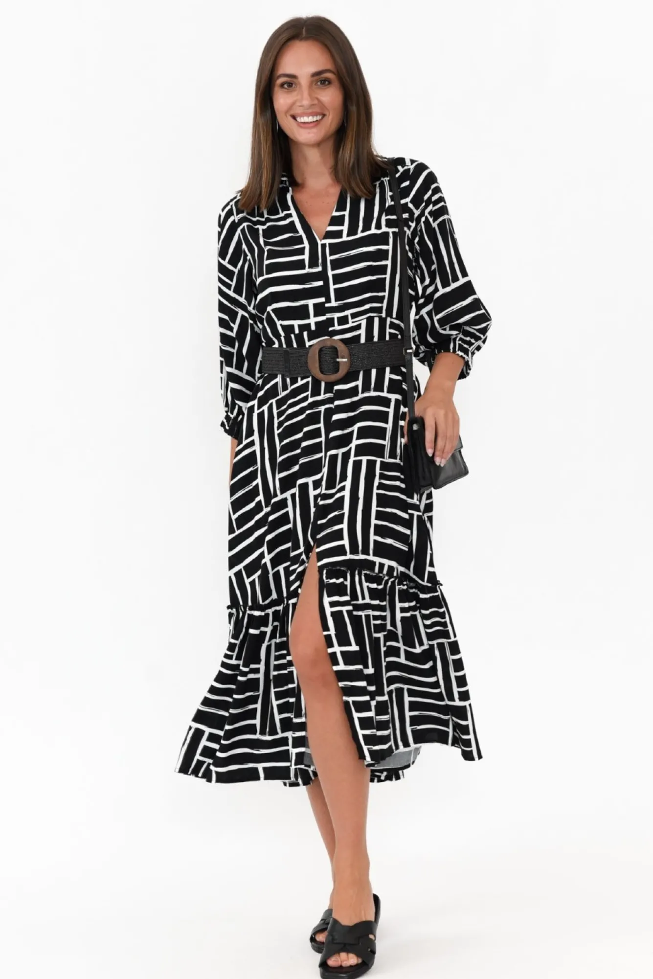 Fit: True To Size. Refer To Size & Fit Tab Below For Specific Size RecommendationNNfabric: 100% ViscoseNcomfortable Lightweight Non-Stretch Fabric Soft And Smooth Hand Feel NNsharp Collared V-Neckline NN3/4 Length Billowy Sleeves Elasticated Ruched Cuff NNflattering A-Line Silhouette With Elasticated Back Panel For Shape And ComfortNNtwo Side Seam Pockets NN43Cm Front SplitNdrop-Tiered Hemline With Frill DetailNNNcare: Cool Gentle Hand Wash RecommendedNNcolour: Midnight Black And White Abstract Stripe Print