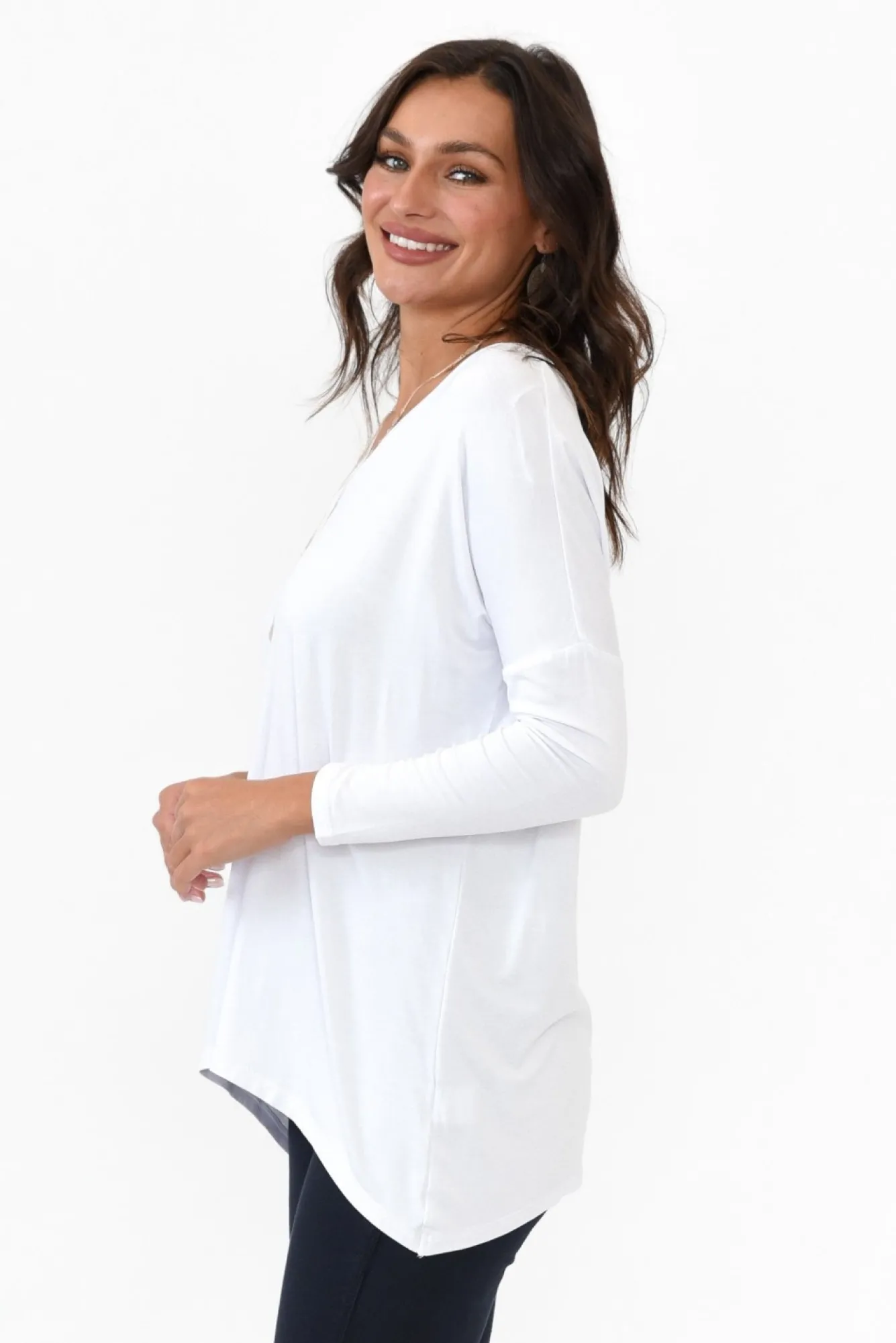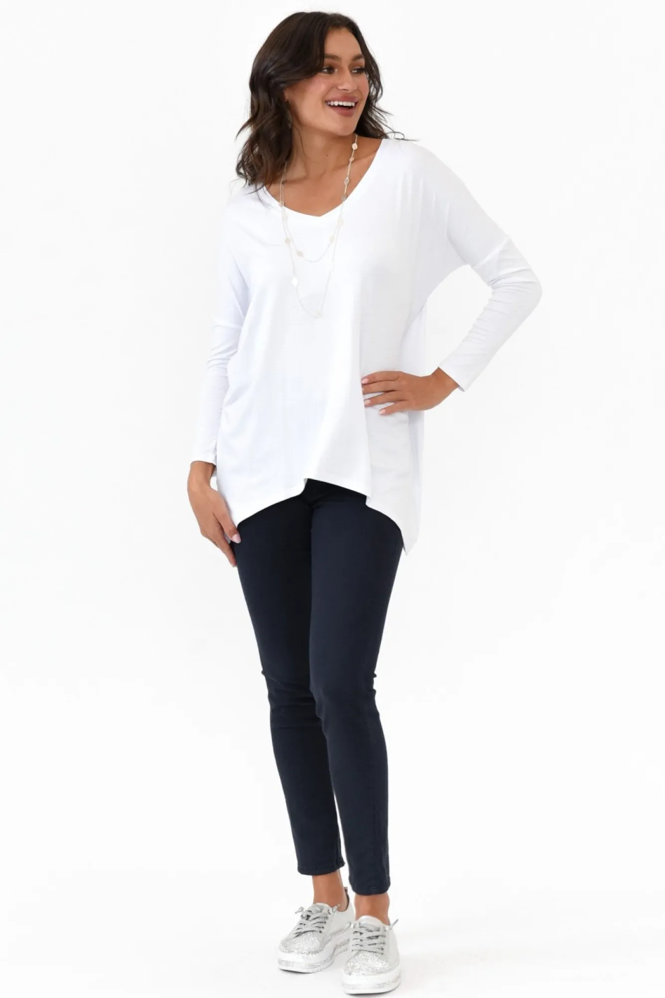 Fit: True To Size. Refer To Size & Fit Tab Below For Specific Size RecommendationNNfabric: Viscose / ElastaneNlightweight And Ultra-Stretchy Fabric Blend With A Smooth And Soft Hand Feel Nslightly Sheer Fabric, We Recommend Wearing Nude UndergarmentsNbanded V-NecklineNNfull-Length Sleeve Complemented By A Drop ShoulderNNslouchy And Relaxed Straight SilhouetteNNcurved Hi-Lo Hemline Provides Extra Coverage At The BackNNhip-Skimming LengthNNNcare: Cool Gentle Machine Wash RecommendedNNcolour: Cool White Tone