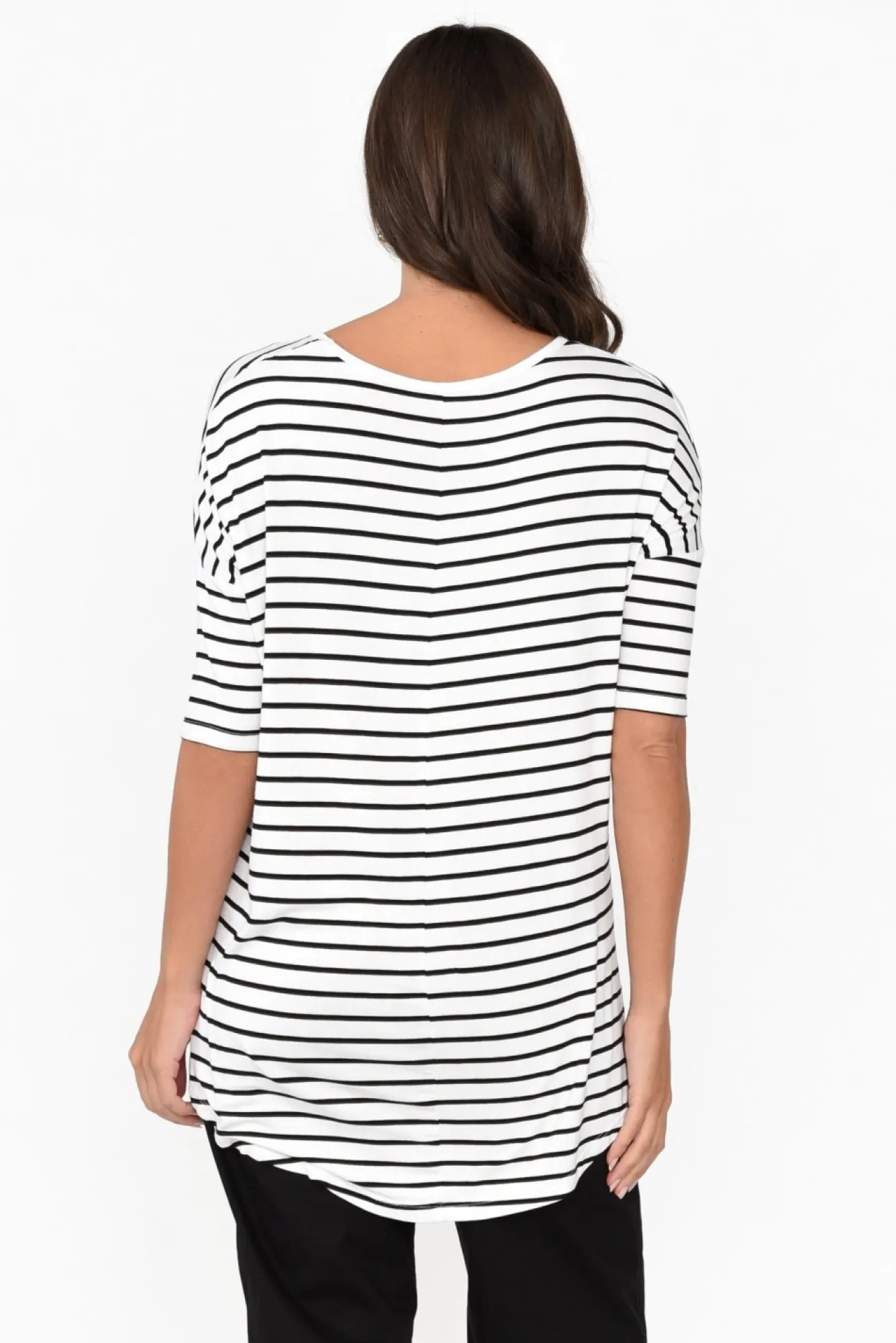 Fit: True To Size. Refer To Size & Fit Tab Below For Specific Size RecommendationNNfabric: Viscose / ElastaneNstretchy Fabric Blend With A Lightweight Feel And Soft Hand FeelNNclassic Rounded NecklineNNhalf-Length Sleeves Are Fitted To The Arm To Create A More Elevated LookNNrelaxed, Straight SilhouetteNNcurved Hi-Lo Hemline Provides Extra Coverage At The BackNNstraight Hem Falls To A Hip-Skimming LengthNNcare: Cool Gentle Machine Wash RecommendedNNcolour: White Base With A Black Stripe Overlay