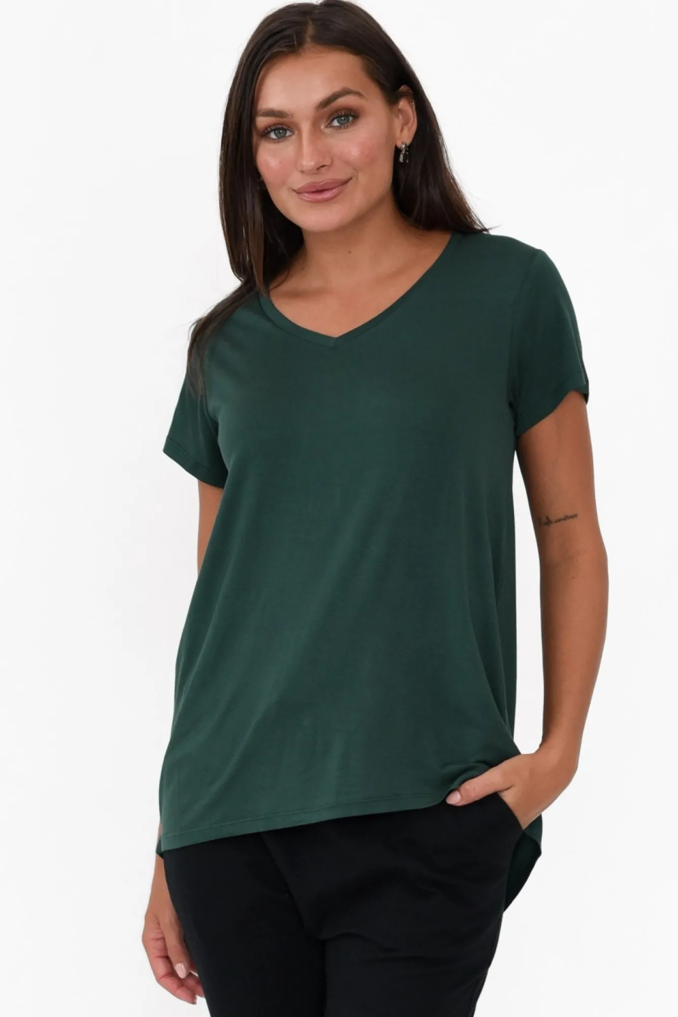 Fit: True To Size. Refer To Size & Fit Tab Below For Specific Size Recommendation NN Fabric: Viscose/ElastaneNa Wardrobe Must-Have Tee In A Smooth And Super-Stretchy FabricNdesigned With An Elegant V-Neckline Cut Which Highlights The CollarbonesNNshort Tee-Style SleevesNNa Slim Swing Silhouette With An Ever-So-Slight Flare At The Base Enhanced By Singular Back PleatNfeaturing A Straight Front Hem And Curved Low Hem At RearNNgarment Falls To The HipNNNcare: Cool Gentle Hand Wash RecommendedNNcolour: Deep Forest Green Shade