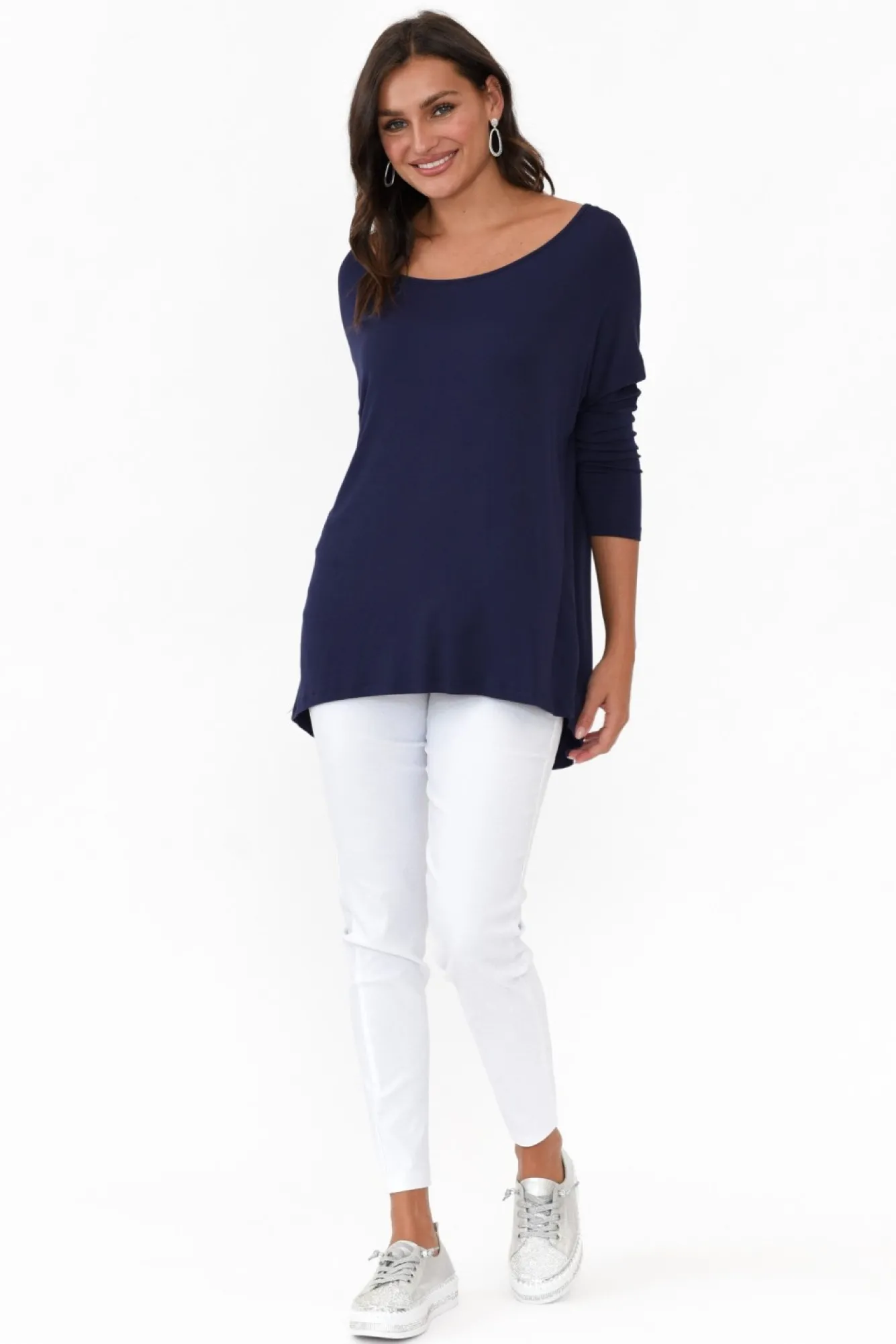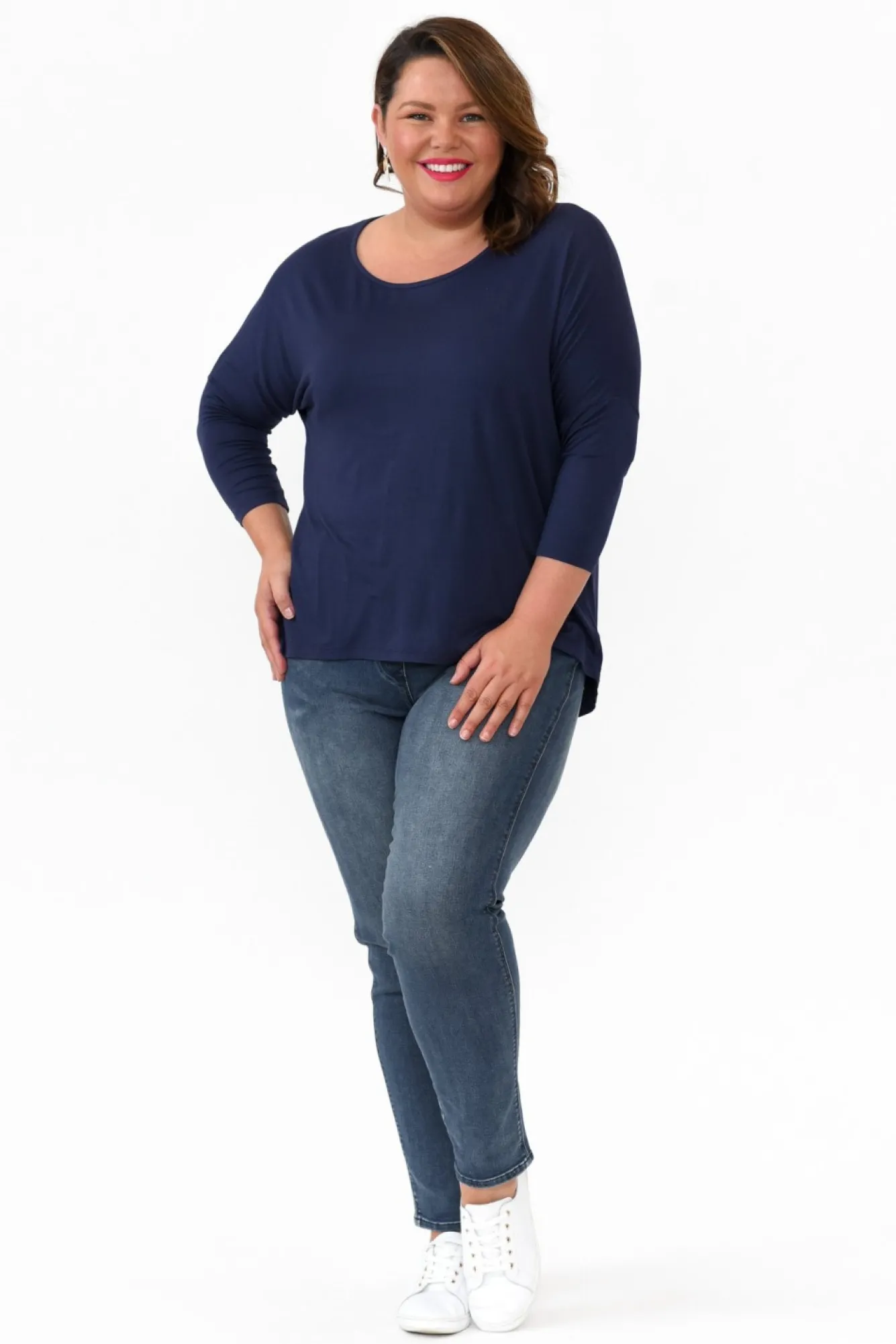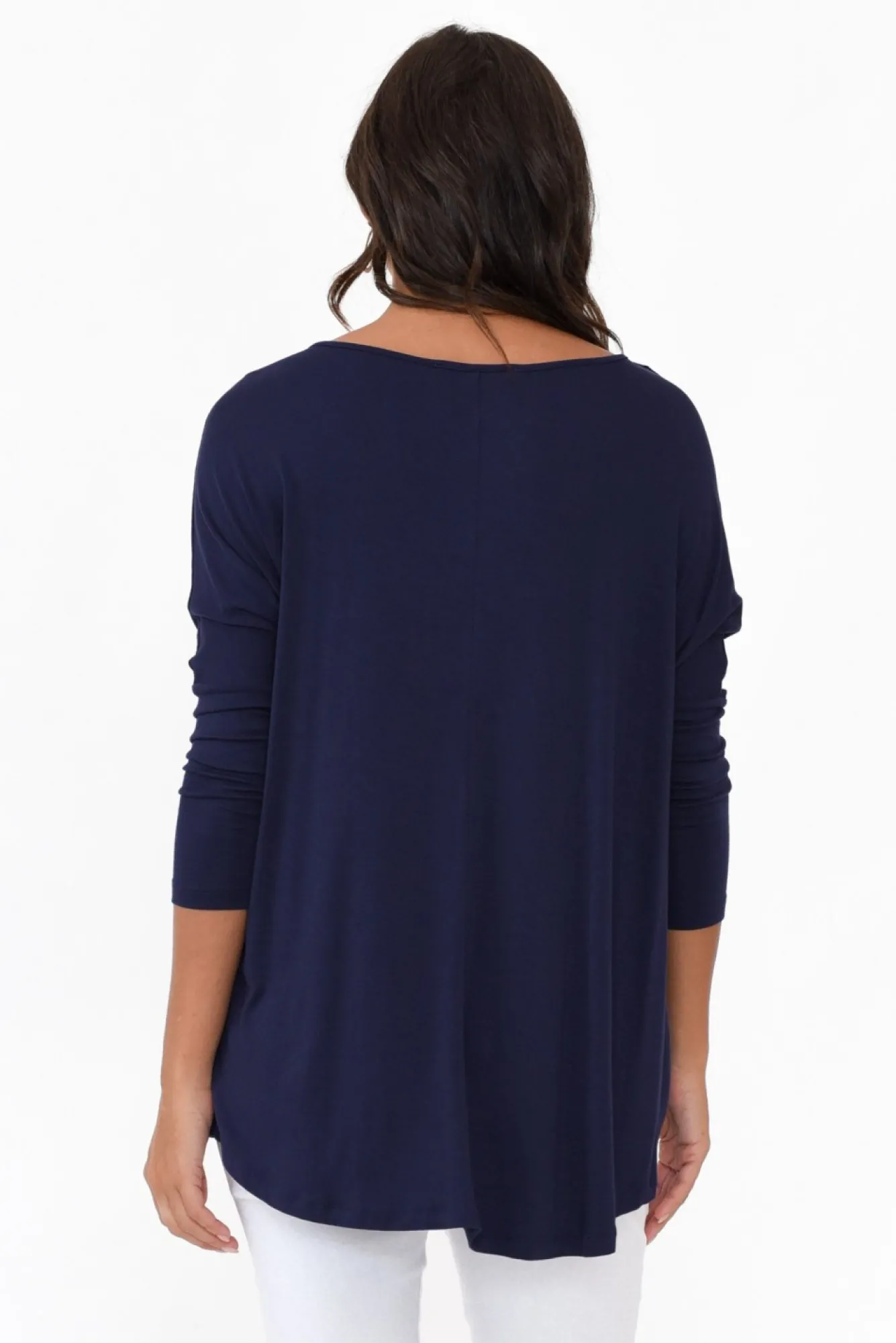 Fit: Oversized. Refer To Size & Fit Tab Below For Specific Size Recommendation NNfabric: Viscose/ElastaneNstyle With Ease In This Lightweight, Soft And Ultra-Stretchy Fabric Blend Made For Everyday WearNNfeatures A Wide Round NecklineNwith 3/4 Length Tapered Sleeves And Drop Shoulder SeamNsignature Relaxed FitNNclassic, Hi-Lo Hemline Falls To The HipNNcare: Cool Gentle Hand Wash RecommendedNNcolour: Navy Blue
