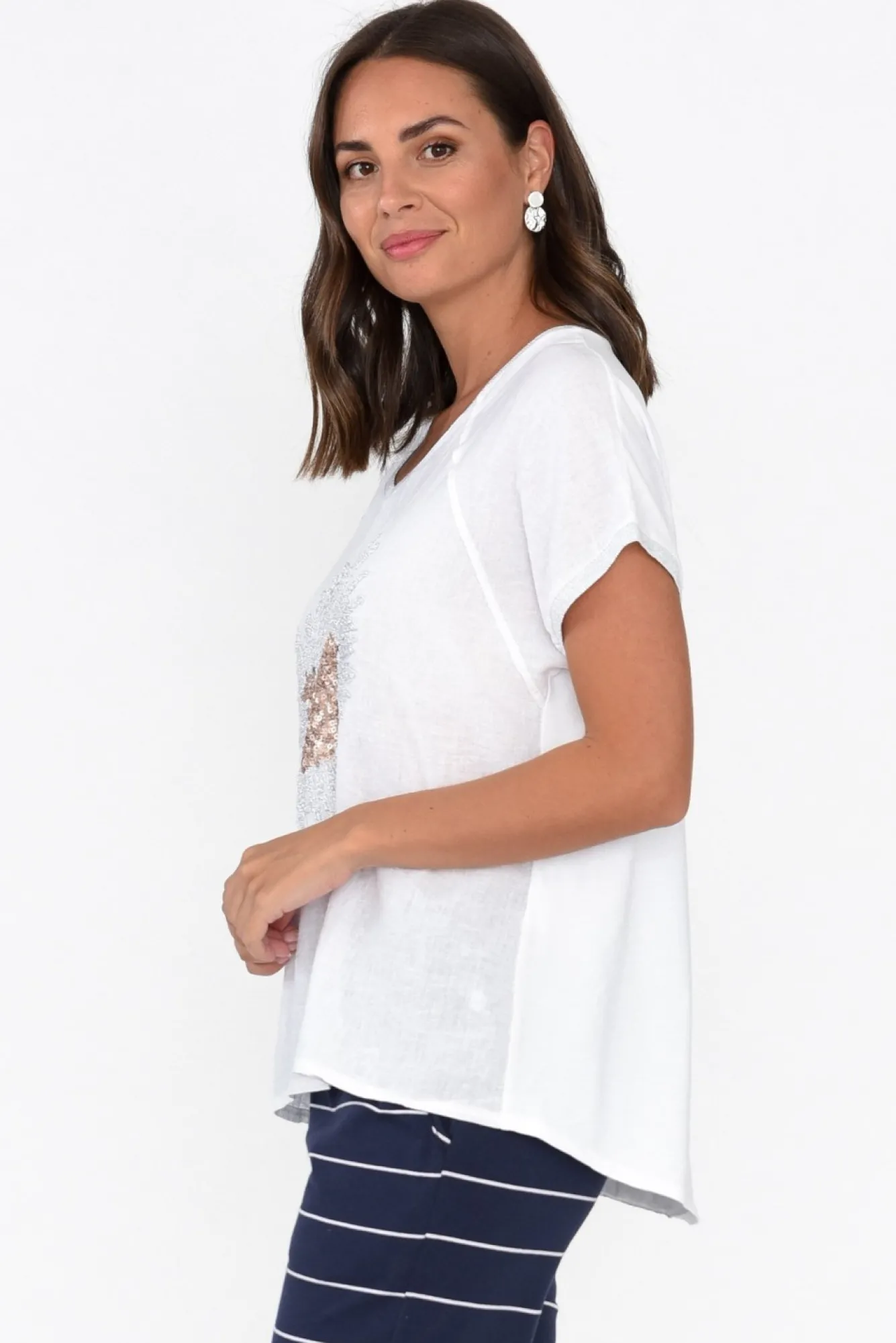 Fit: True To Size. Refer To Size & Fit Tab Below For Specific Size RecommendationNNfabric: 80% Linen, 20% CottonNultra-Lightweight, Breathable And Non-Stretch Linen Blend Fabric Ncrafted In Italy Nfeature V-Neckline Highlights The Collarbones NNmetallic Ribbed Trim Featured On The Neckline And Sleeves Ntee-Style Sleeves With Exposed Raglan Sleeve Stitching NNeveryday A-Line Design Features A Woven Front And Soft, Stretchy BackNelevated Sequin Heart Embellishment Outlined By Metallic Thread Detailing NNhi-Lo Hem Falls To Hip Length NNNcare: Cool Gentle Machine Wash RecommendedNNcolour: Crisp White With A Gold Sequin Heart Silver Thread Embellishment