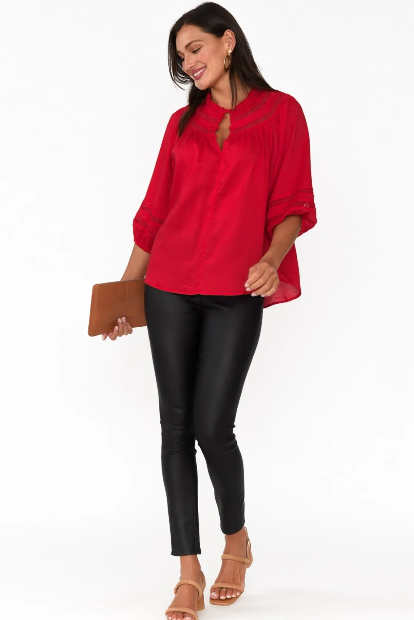 Fit: True To Size. Refer To Size & Fit Tab Below For Specific Size RecommendationNNfabric: Main: Viscose/Lyocell/Linen Trim: PolyesterNlightweight, Non-Stretch Fabric With A Soft And Smooth Hand Feel NNhigh Round Neckline With Delicate Frill Detail And Statement Ladder Trim NNthree Functional Buttons Featured Down Bust To Create An Optional V-Split N3/4 Length Billowy Sleeves With Matching Crisscross Ladder Trim And Elasticated CuffsNNversatile Straight Silhouette NNhi-Lo Hemline Falls To The Hips NNNcare: Cool Gentle Machine Wash RecommendedNNcolour: Chili Red Hue