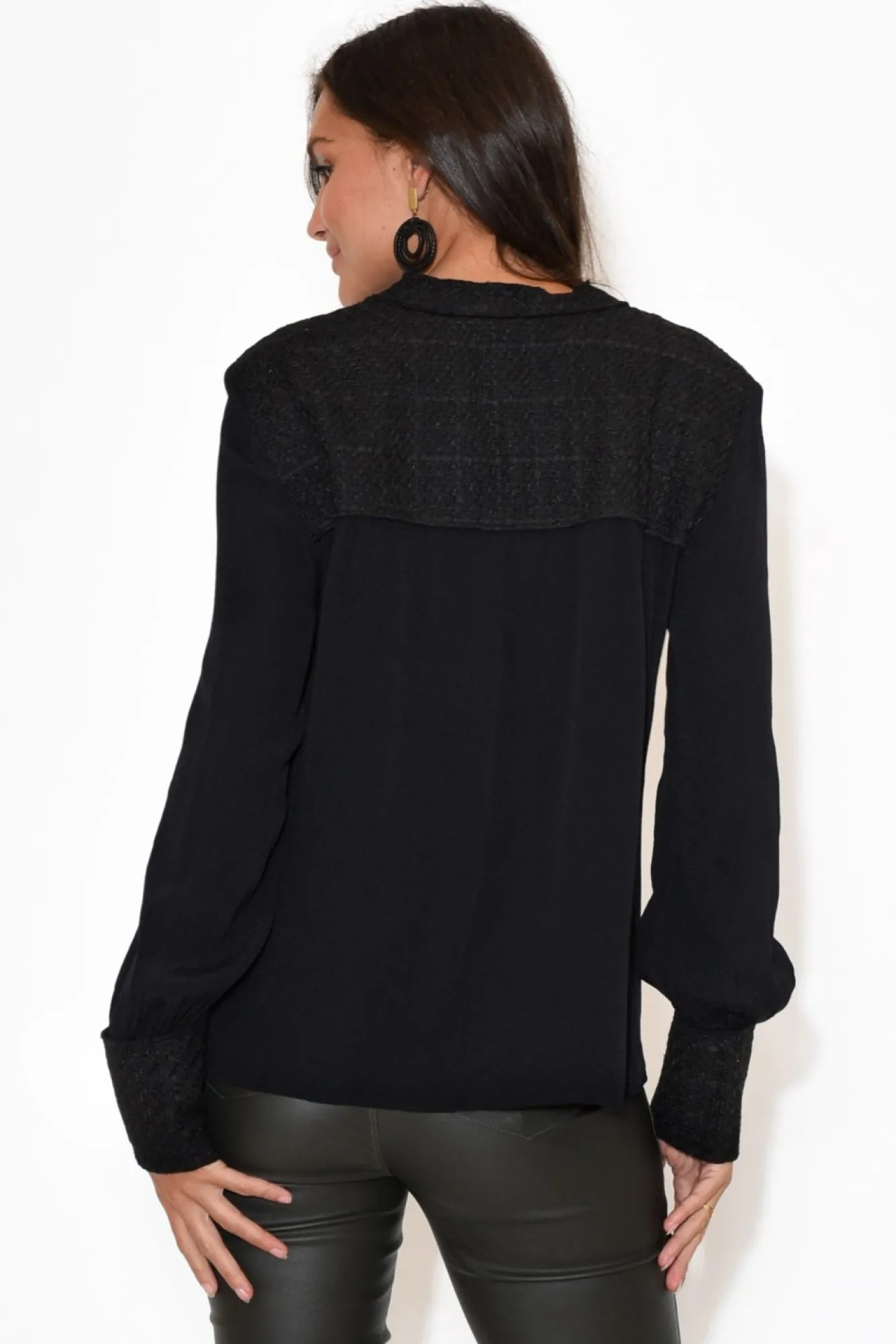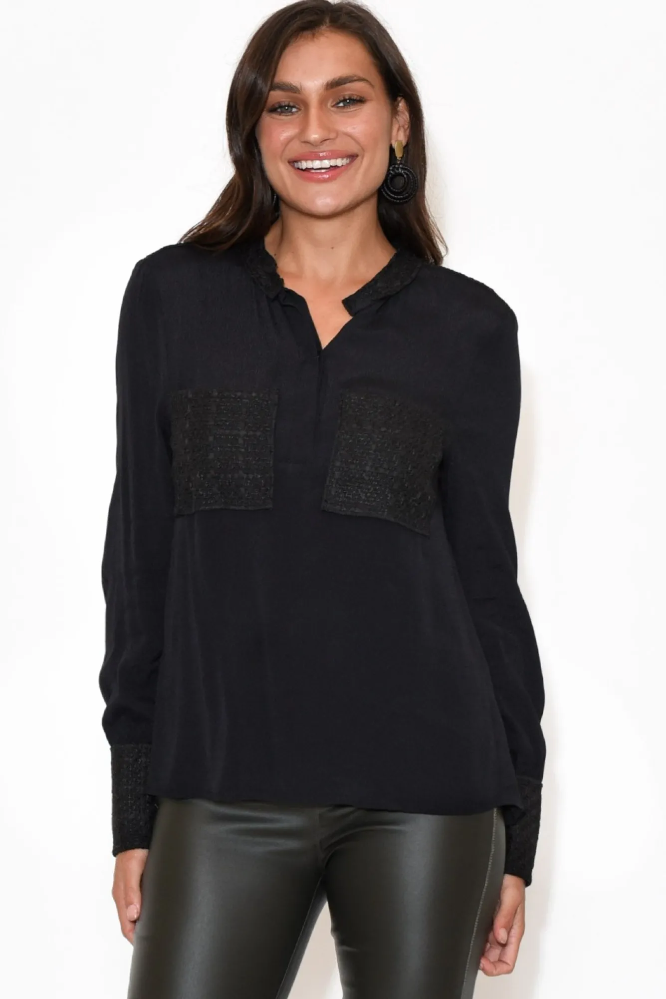 Fit: True To Size. Refer To Size & Fit Tab Below For Specific Size Recommendation NNfabric: Main: Viscose, Contrast: PolyesterNthis Non-Stretch, Long Sleeve Style With Eye-Catching Personality Will Elevate Your Style Whilst Remaining A Staple Piece You’Ll Want To Wear EverydayNtextured Woven Polyester Featured On Collar, Shoulders, Cuff And PocketsNa Dainty Round Neckline With Hidden Button Down Design From Neck To Waist For Increased Comfort Ntwo Functional Breast Pockets Add Dimension And ContrastNextra Long Straight Sleeves With Statement Textured CuffNNclassic T-Shirt Cut Nstraight Hemline Falls To The HipNNcare: Cool Gentle Hand Wash RecommendedNNcolour: Staple Black
