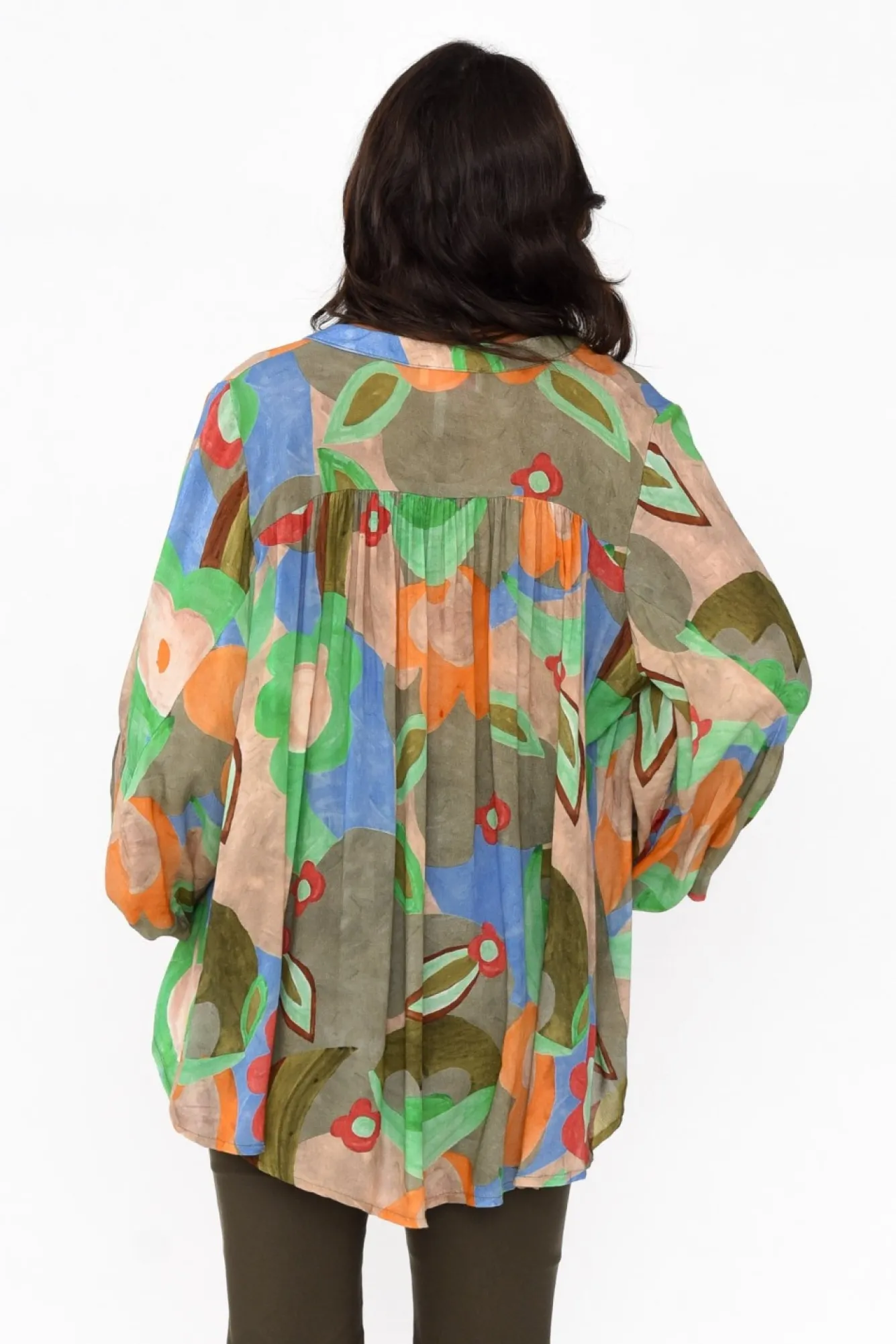 Fit: True To Size. Refer To Size & Fit Tab Below For Specific Size RecommendationNNfabric: 100% ViscoseNlightweight And Non-Stretch Fabric With A Lovely Soft Hand FeelNNbanded Round Collar With A Deep V-Split And Tassel Tie DetailNstatement Full-Length Puff Sleeves With An Elastic CuffNNsoft Pleating Details At The Yoke, Front Of The Shoulders And Sleeves Elevate The LookNrelaxed Straight Silhouette Flows Over CurvesNNcurved Hi-Lo Hem Provides More Coverage At The BackNNcare: Cool Gentle Hand Wash RecommendedNNcolour: Collage Of Flowers In Hues Of Khaki And Green
