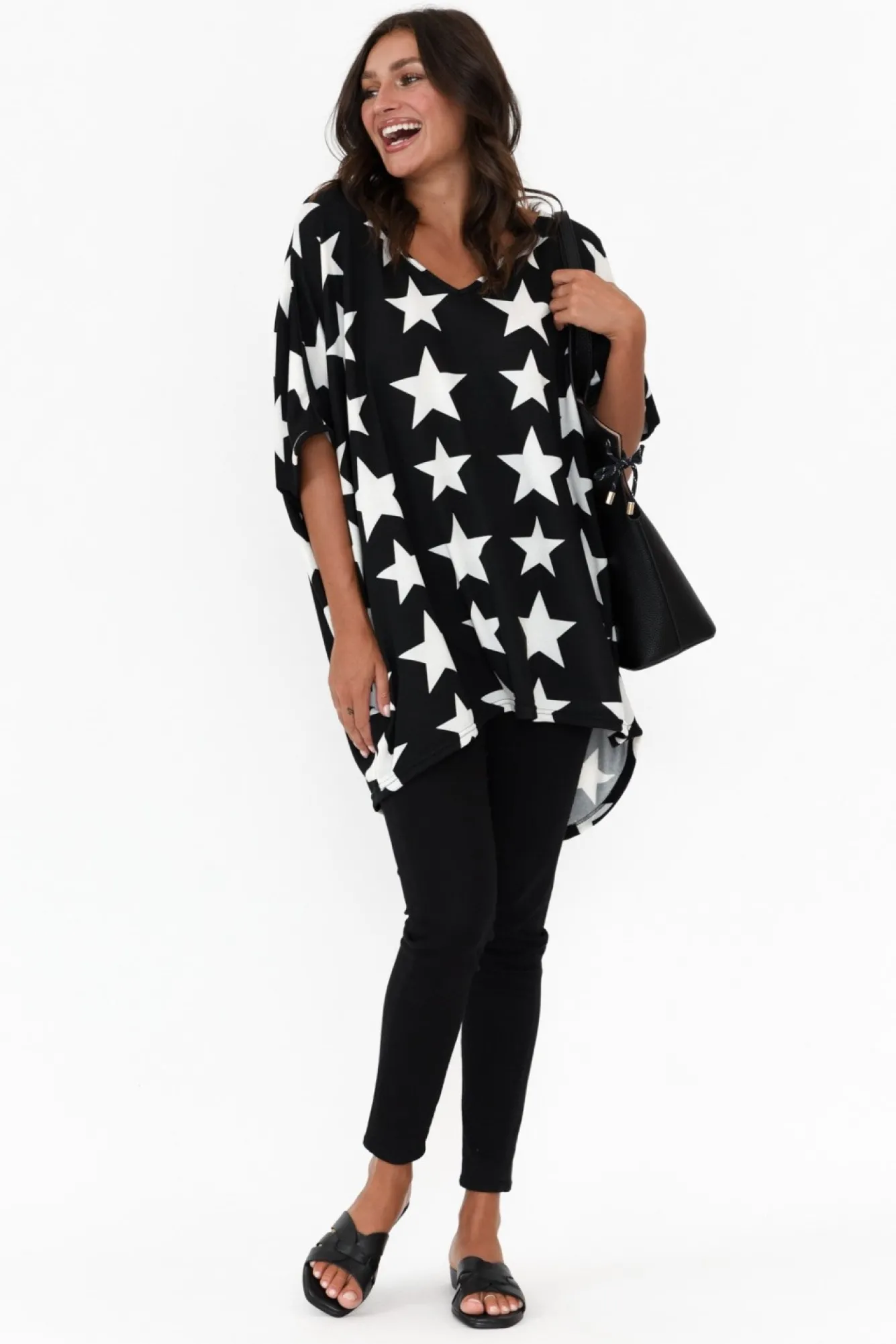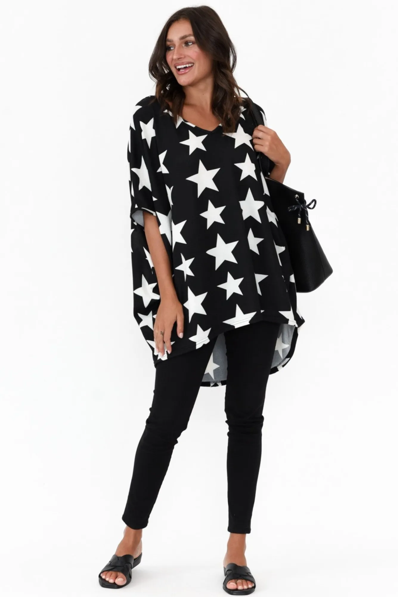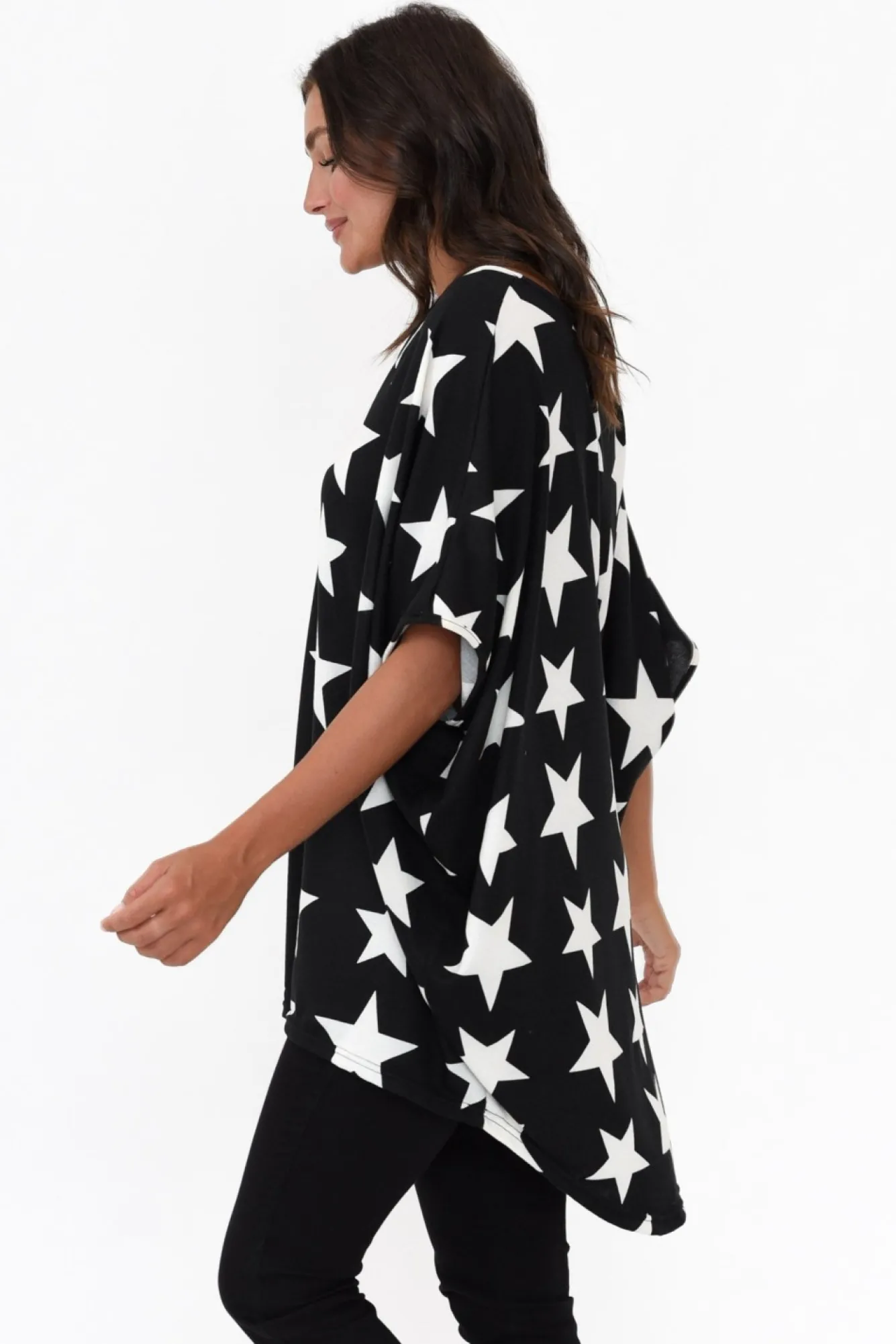 Fit: True To Size. Refer To Size & Fit Tab Below For Specific Size RecommendationNNfabric: 60% Polyester, 35% Wool, 5% ElastaneNultra-Soft And Lightweight Fabric With A Comfortable Knitted Stretch NNv-Neckline Highlights The Collarbones Nhalf-Length Drape Sleeves Enhance The Slouchy Design Neveryday Drape SilhouetteNNhi-Lo Hemline Falls Below Hip Length NNNcare: Cool Gentle Hand Wash RecommendedNNcolour: Midnight Black Base With White Stars