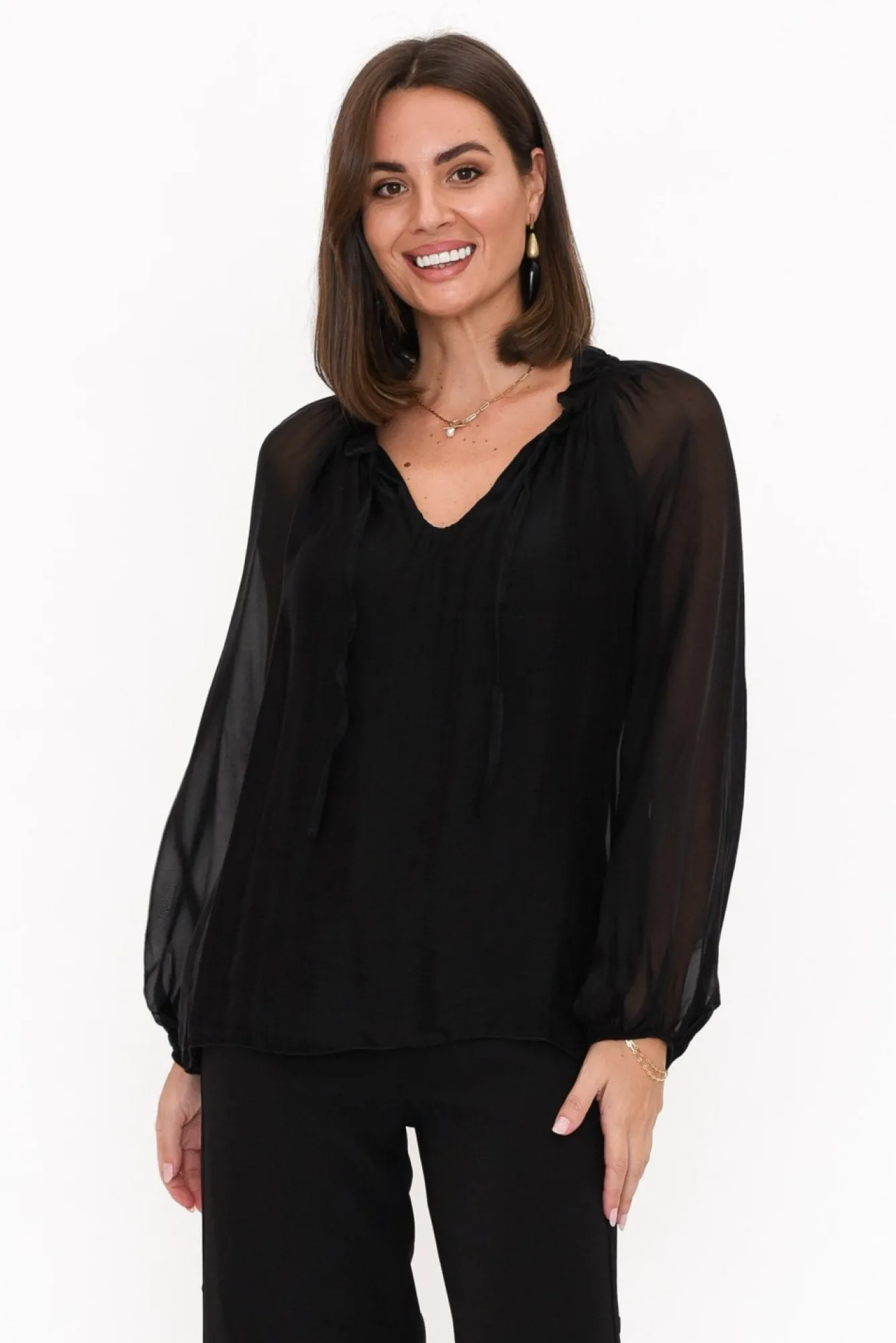 Be the first to review “Sleeved Tops<La Strada James Black Front Tie Silk Top” Cancel reply