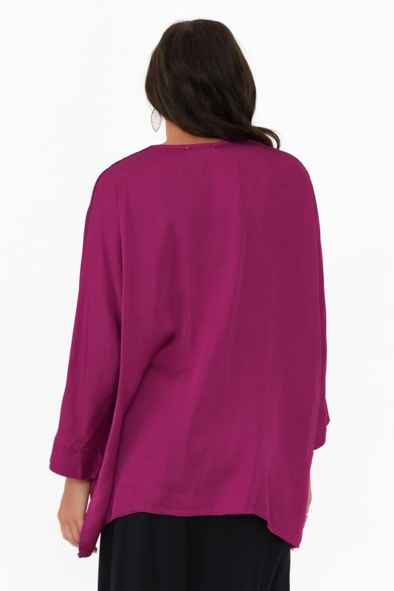 Fit: True To Size. Refer To Size & Fit Tab Below For Specific Size RecommendationNNfabric: 100% ViscoseNgorgeous Lightweight, Non-Stretch And Silky Smooth Fabric With An Elevated Glossy FinishNcrafted In ItalyNstriking Cross-Over V-Neckline NNstraight 3/4 Lengths Sleeves NNrelaxed Straight Silhouette Enhanced By Feature Front PleatNNdraping Hi-Lo Hemline Falls To Hip Length NNNcare: Cool Gentle Machine Wash RecommendedNNcolour: Berry Purple Shade