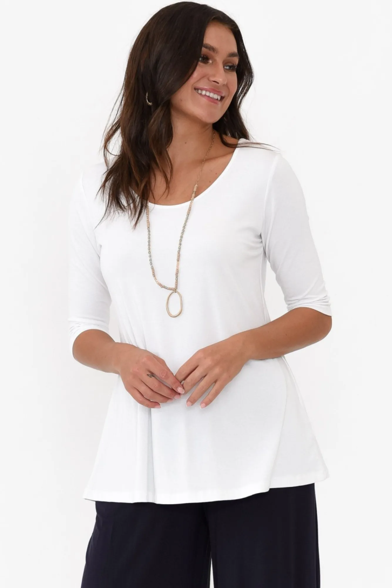 Fit: True To Size: Pick The Size You Would Normally BuyNNfabric: 92% Bamboo, 8% ElastaneNluxuriously Soft And Breathable Midweight Bamboo BlendNslightly Sheer Fabric, We Recommend Wearing Nude UndergarmentsNsimple Wide Round Neckline NNstraight Half-Length Sleeves NNversatile A-Line Silhouette NNfalls To Hip Skimming LengthNNcare: Cool Gentle Hand Wash RecommendedNNcolour: White Shade