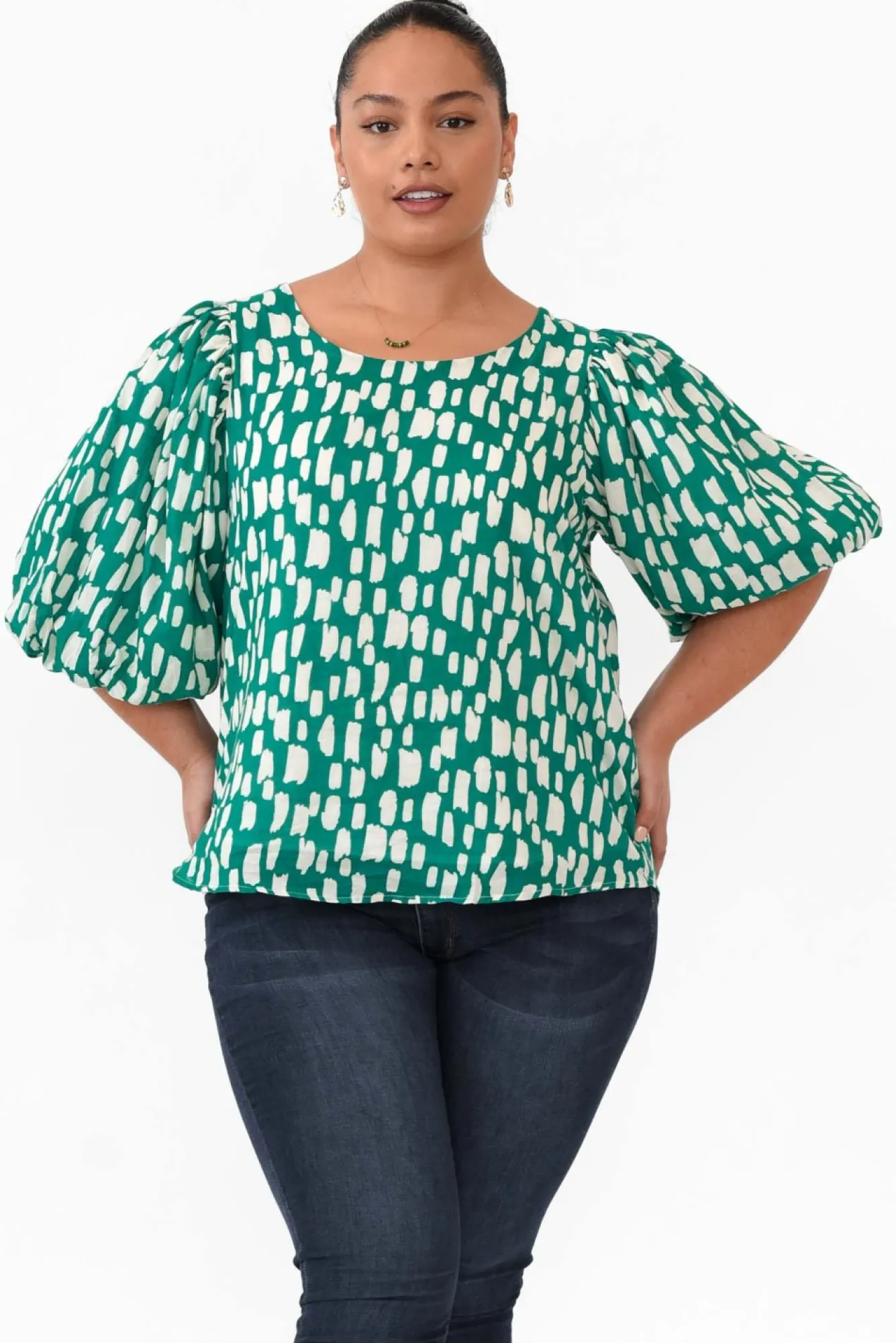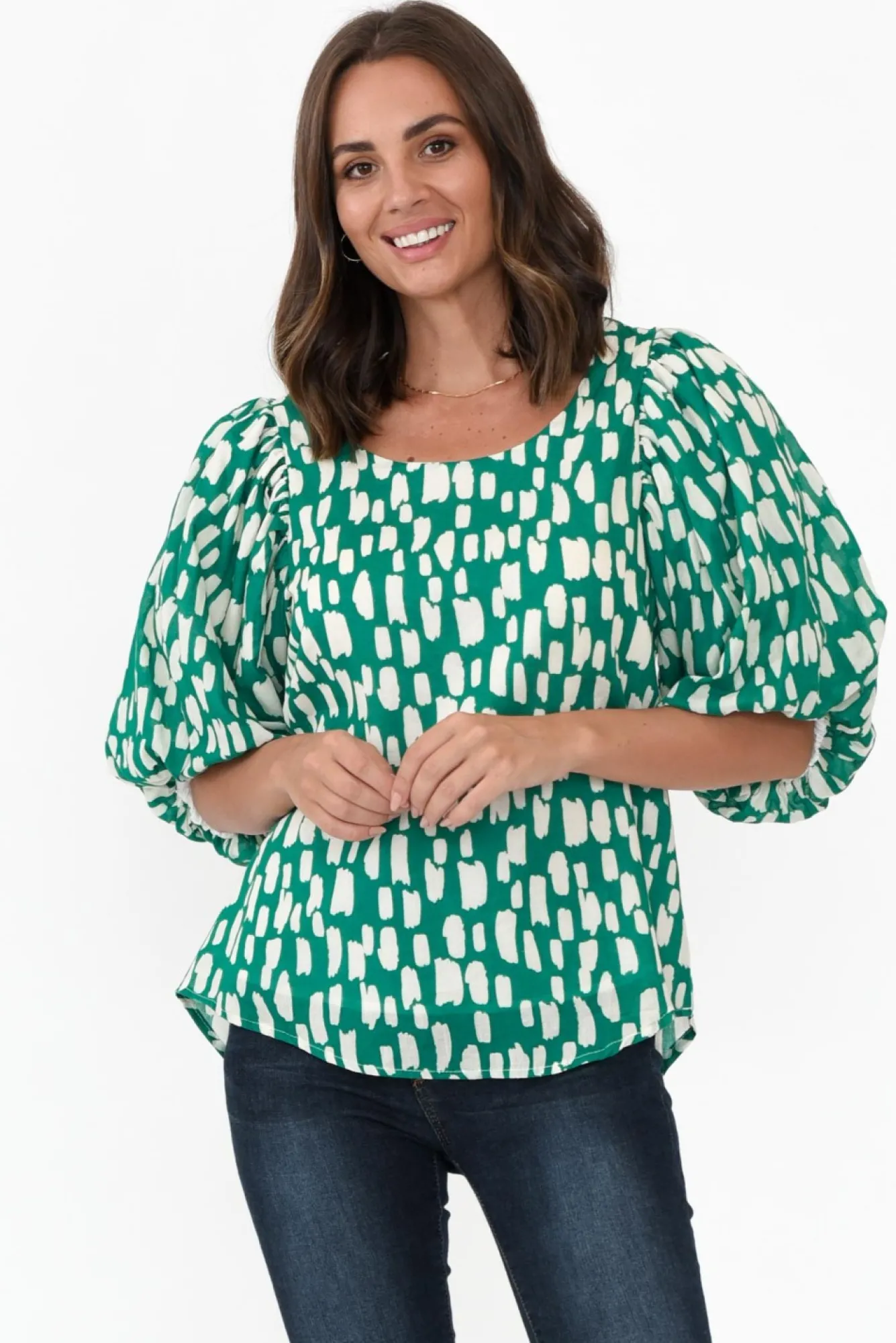 Fit: True To Size. Refer To Size & Fit Tab Below For Specific Size RecommendationNNfabric: 100% Rayon Nlightweight, Non-Stretch Rayon Style With A Textured Woven Hand FeelNNfully Lined For Added CoverageNfeature 3/4 Length Puff Sleeves With A Hidden Elastic Cuff And Pleated Shoulder Seam DetailNrelaxed A-Line SilhouetteNstraight Hem Falls To A Hip-Skimming LengthNNcare: Cool Gentle Hand Wash RecommendedNNcolour: Elegant Green Base With A White Fleck Overlay