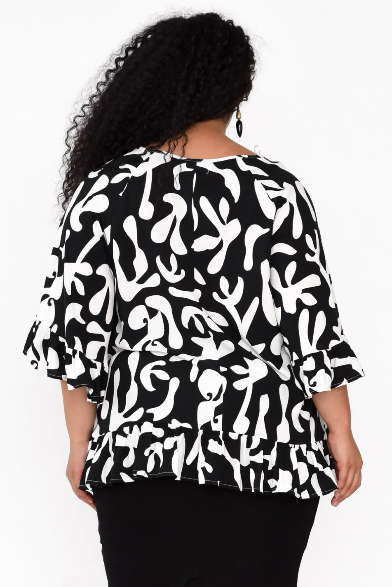 Fit: True To Size. Refer To Size & Fit Tab Below For Specific Size RecommendationNNfabric: 100% RayonNlovely Lightweight, Smooth, And Flowing Rayon Fabric NNclassic V-Split Neckline Is Elevated With Adjustable Tassel TieNNbillowing 3/4 Length Sleeves With A Frill Cuff NNoversized, Flowy Style Emphasises The Feminine Ruffle LookNfloaty Drape Silhouette Cascades Past HipsNNcare: Cool Gentle Hand Wash RecommendedNNcolour: Chic Black And White Abstract Print