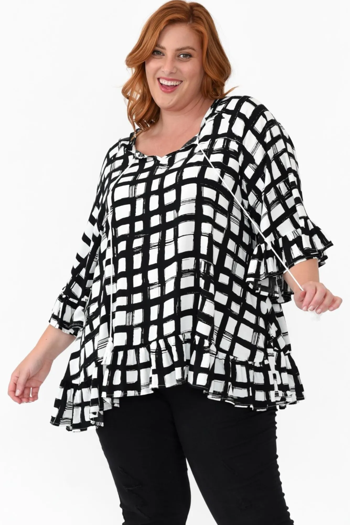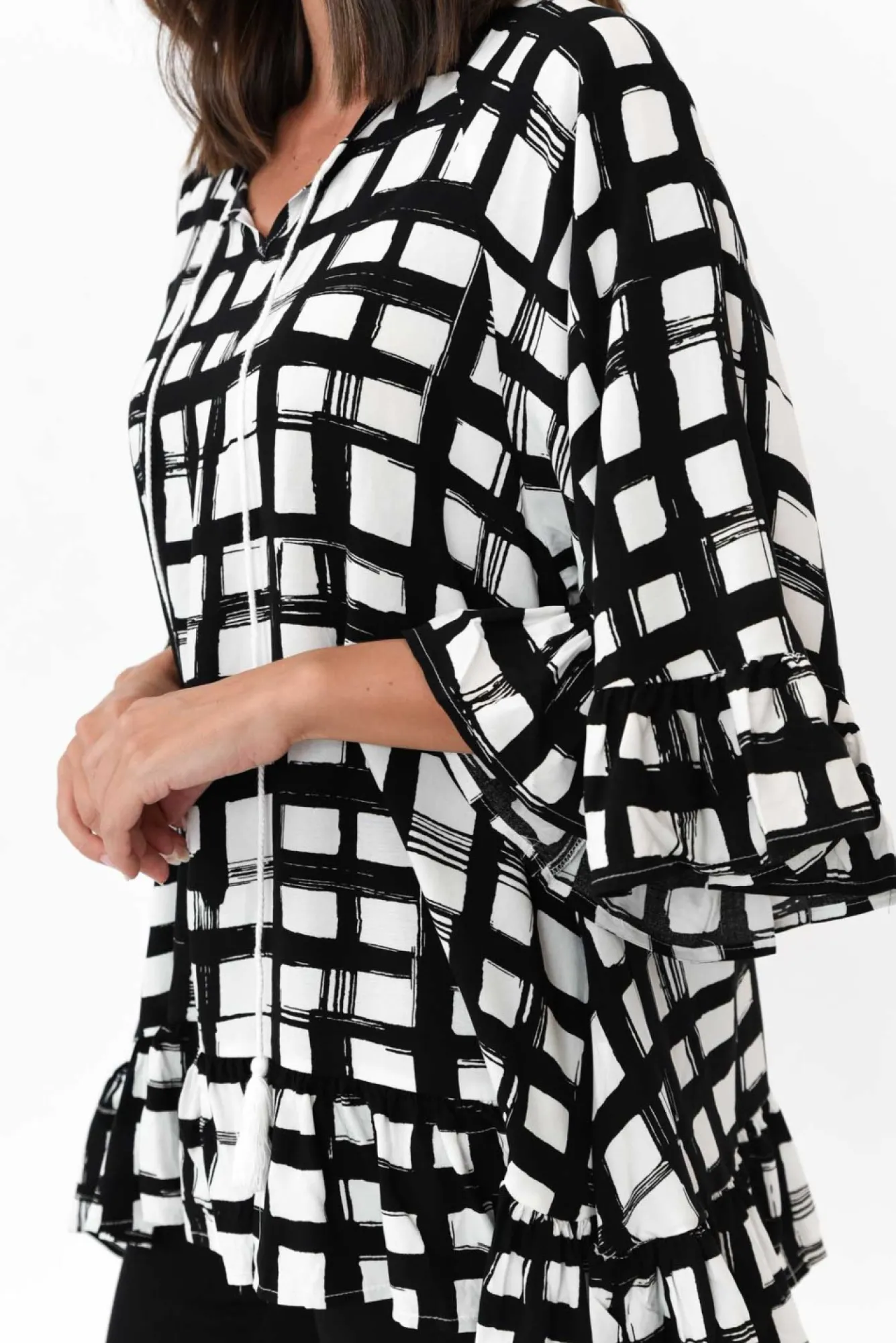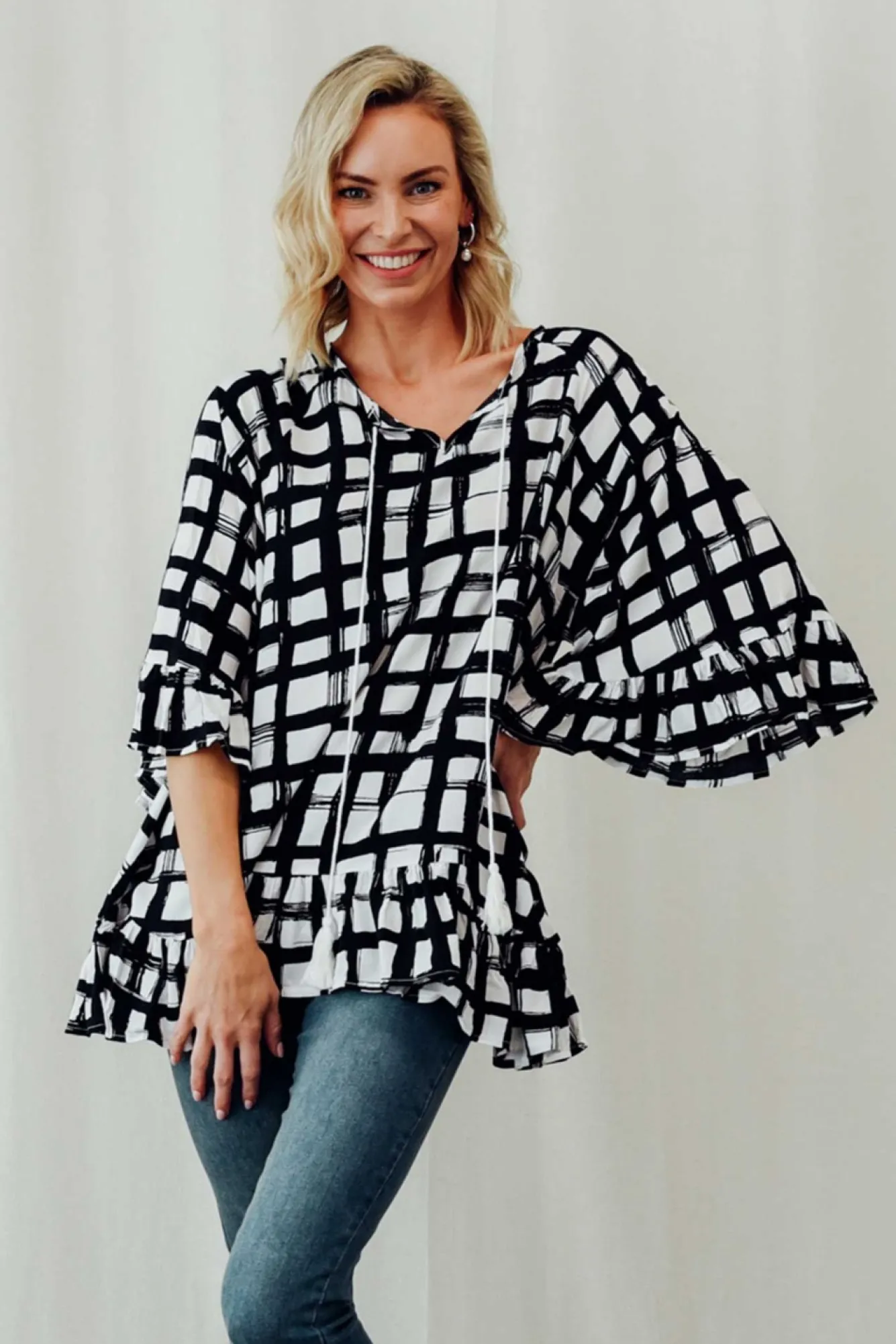 Fit: True To Size. Refer To Size & Fit Tab Below For Specific Size RecommendationNNfabric: 100% RayonNcomfortable Ultra-Lightweight, Non-Stretch Fabric With A Smooth Hand Feel NNtimeless V-Split Neckline Featuring Adjustable Tassel TieNNstatement 3/4 Length Sleeves Elevated By Frill Cuff Noversized, Flowy Style Emphasises The Feminine Ruffle LookNeasy-To-Wear Drape SilhouetteNNsweet Frill Hem Falls Just Below Hip-LengthNNNcare: Cool Gentle Hand Wash RecommendedNNcolour: Bold Black And White Painted Check Print