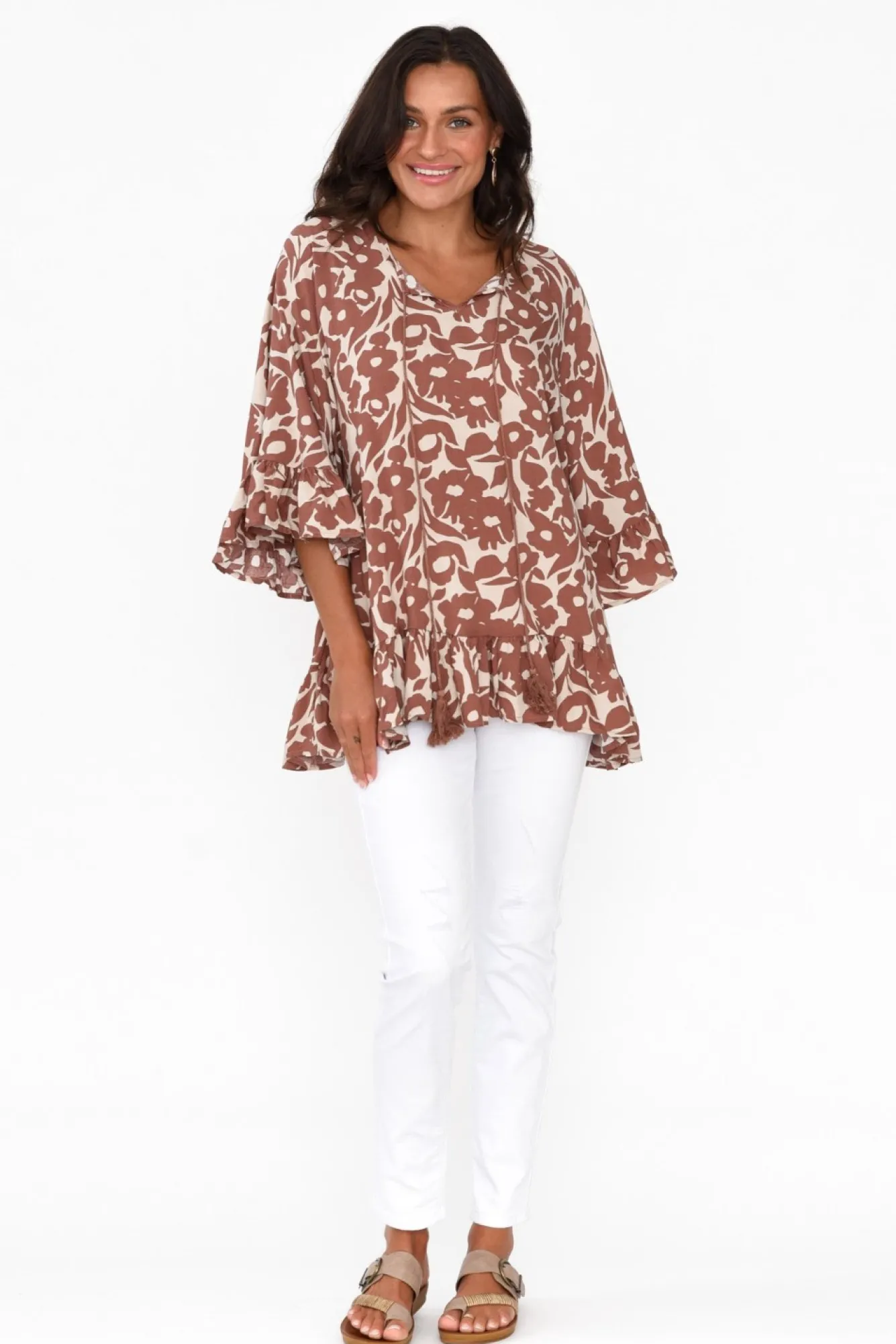 Fit: True To Size. Refer To Size & Fit Tab Below For Specific Size RecommendationNNfabric: 100% RayonNlovely Lightweight, Smooth, And Flowing Rayon Fabric NNtimeless V-Neck Featuring A Tassel Tie ClosureNNbillowing 3/4 Length Sleeves With A Frill Cuff NNoversized, Flowy Style Emphasises The Feminine Ruffle LookNfloaty Drape Silhouette Cascades Past HipsNNcare: Cool Gentle Hand Wash RecommendedNNcolour: Taupe Base With An Abstract Brown Floral Overlay