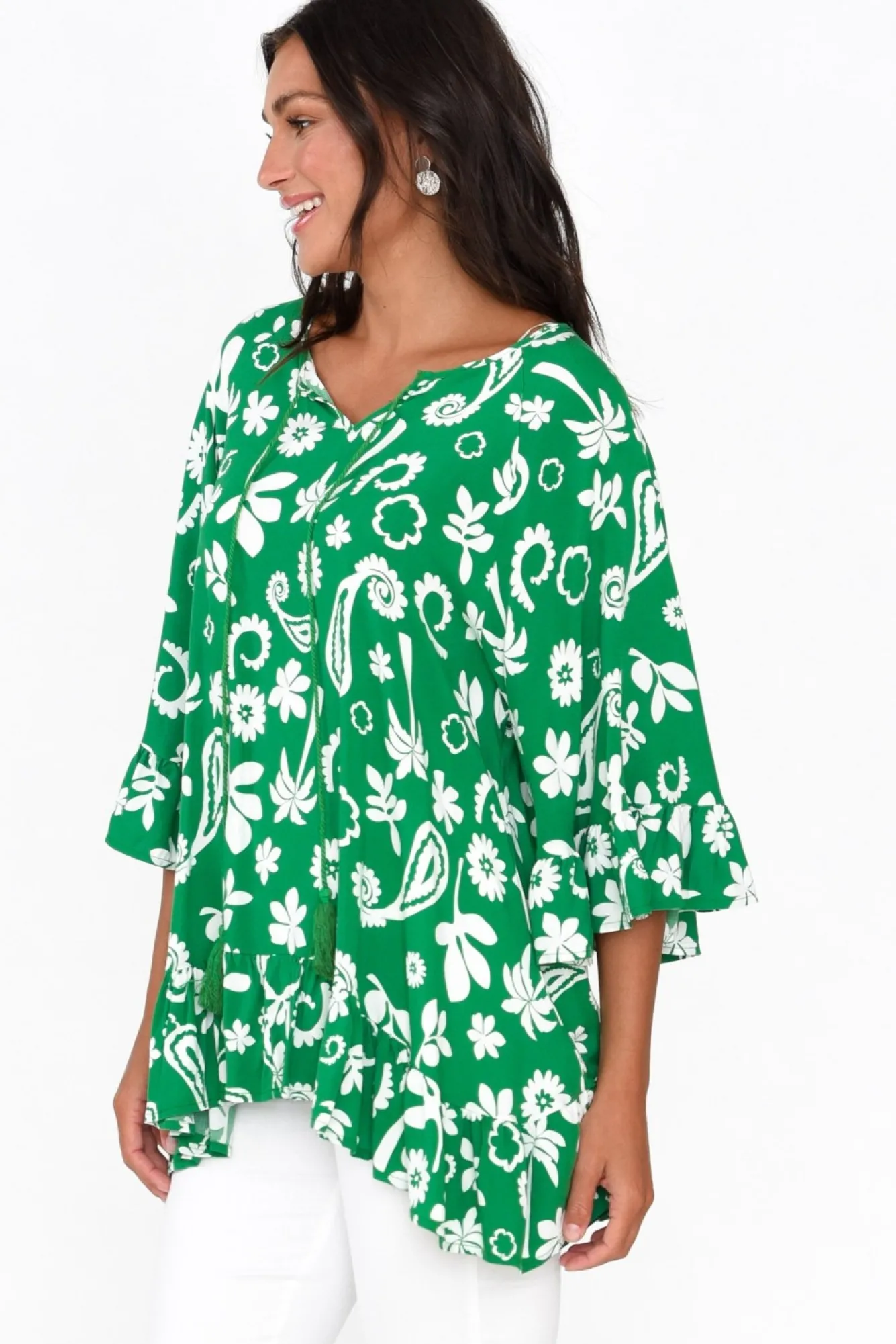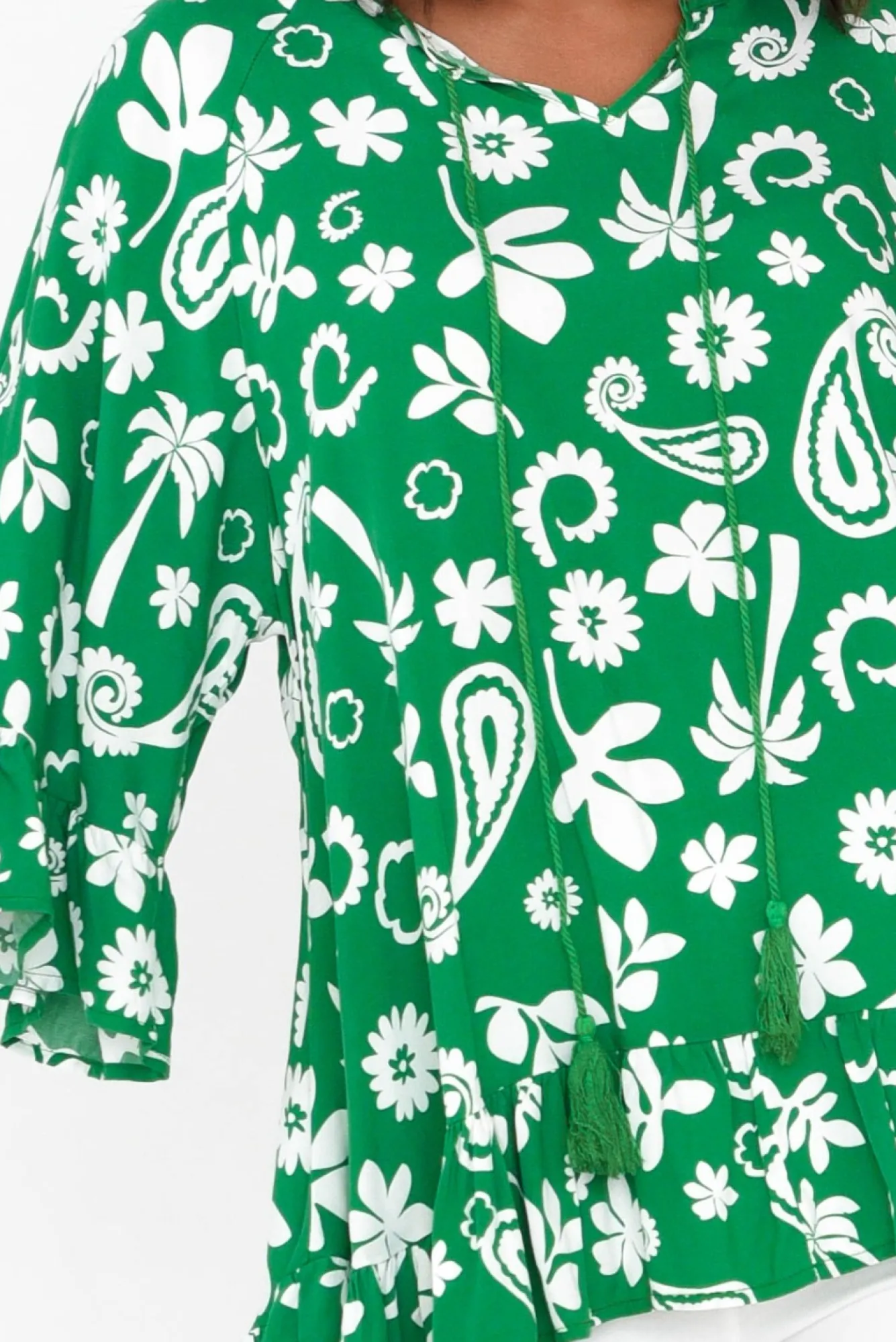 Fit: True To Size. Refer To Size & Fit Tab Below For Specific Size RecommendationNNfabric: 100% RayonNflowy, Lightweight Garment Made From Non-Stretch, Draping FabricNclassic Round Neckline Featuring A V-Split And Tassel Tie DetailNNthree Quarter Length Billow Sleeve, Featuring A Frill CuffNoversized, Flowy Style Emphasises The Feminine Ruffle LookNflattering Drape Silhouette NNslightly Curved, Frill Hem Falls Past The HipsNNNcare: Cool Gentle Hand Wash RecommendedNNcolour: Green With A Fun Floral And Paisley Print