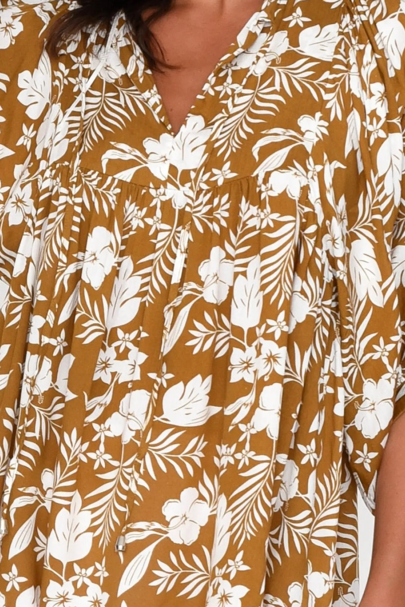 Fit: True To Size. Refer To Size & Fit Tab Below For Specific Size RecommendationNNfabric: 100% RayonNlightweight, Non-Stretch Rayon With A Lovely Soft Hand FeelNNround Neckline With A V-Split And Tie DetailNNwide, Three-Quarter Sleeves Featuring Subtle Pleating Details From The Shoulder NNnon-Stretch Waist Seam DetailNsubtle A-Line Silhouette Swings At The HipsNstraight Hem Falls To A Hip-Skimming LengthNNNcare: Cool Gentle Hand Wash RecommendedNNcolour: Mustard Yellow With A White Floral Overlay