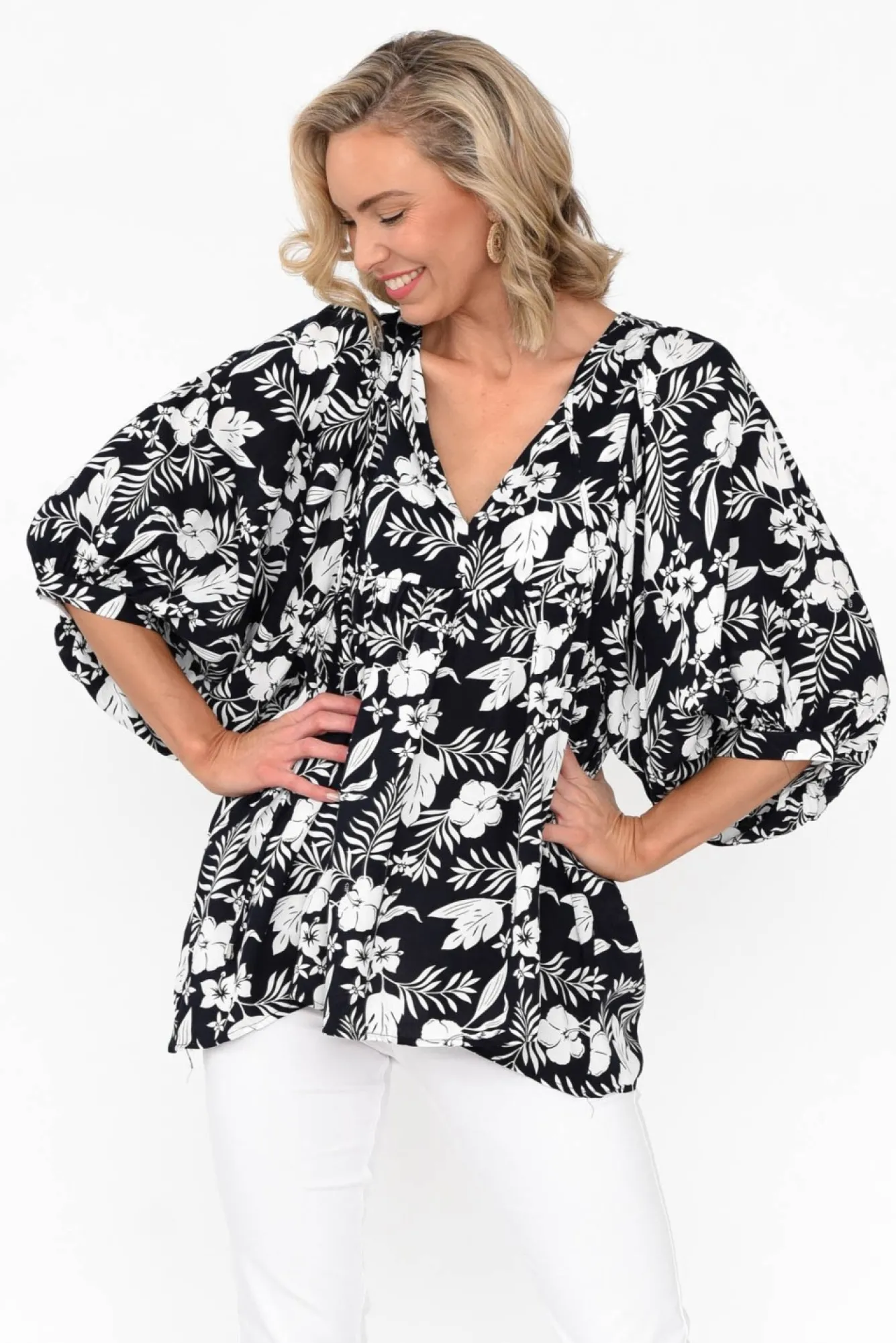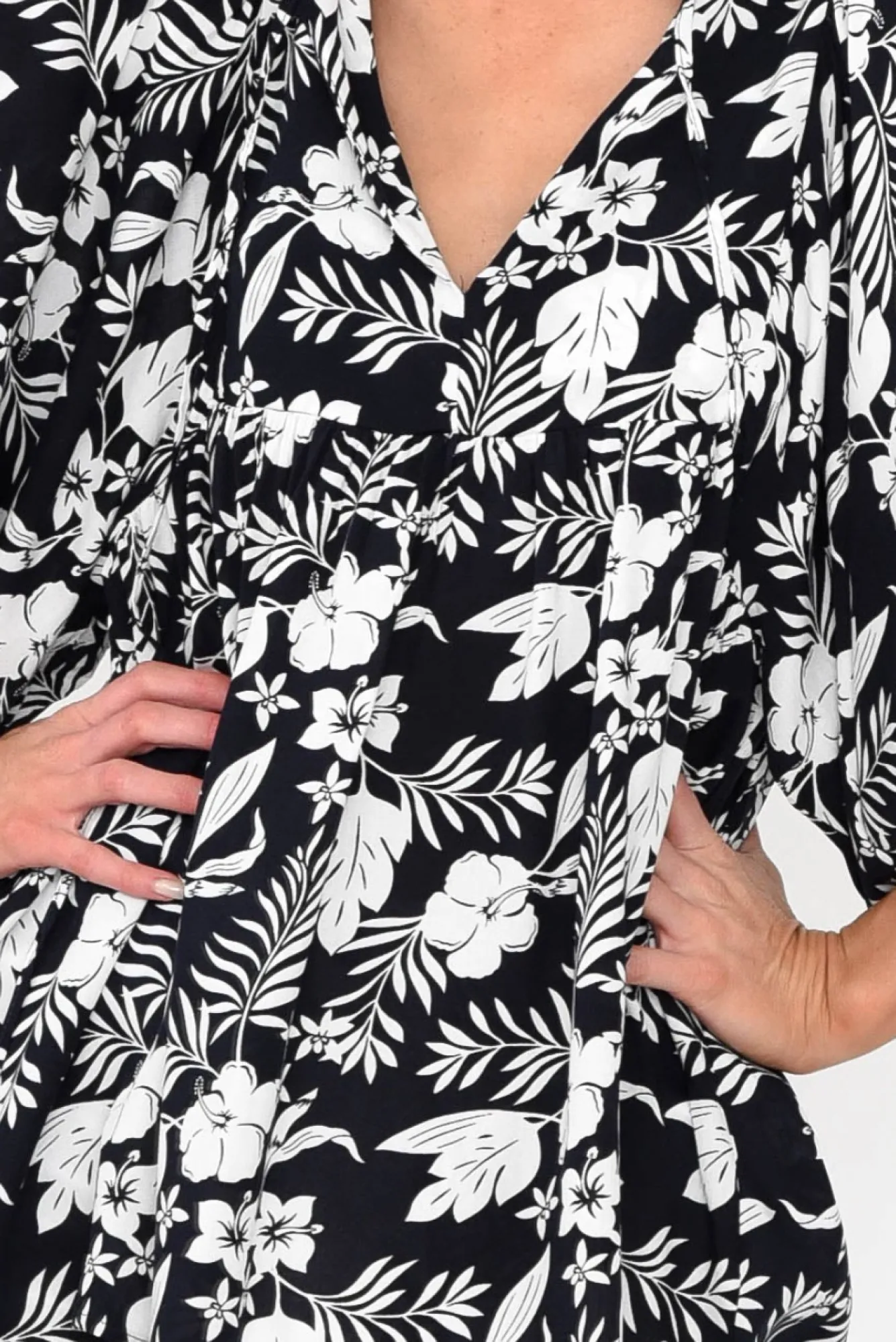 Fit: True To Size. Refer To Size & Fit Tab Below For Specific Size RecommendationNNfabric: 100% RayonNlightweight, Non-Stretch Rayon With A Lovely Soft Hand FeelNNround Neckline With A V-Split And Tie DetailNNwide, Three-Quarter Sleeves Featuring Subtle Pleating Details From The Shoulder NNnon-Stretch Waist Seam DetailNsubtle A-Line Silhouette Swings At The HipsNperfect Hip-Skimming LengthNNNcare: Cool Gentle Hand Wash RecommendedNNcolour: Navy Base With A White Floral Overlay