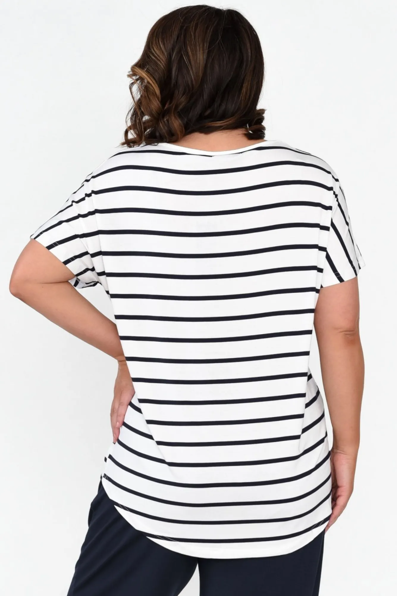 Fit: True To Size. Refer To Size & Fit Tab Below For Specific Size RecommendationNNfabric: 95% Bamboo Viscose, 5% SpandexNbamboo Blend Top In A Wardrobe Staple Style Offering Stretchy, Soft And Breathable QualitiesNclassic Round Neckline Nshort, Tee-Style Sleeves Neveryday Straight, Relaxed Silhouette NNdramatic Hi-Lo, Curved Hemline Provides More Coverage At The BackNNNcare: Cool Gentle Machine Wash RecommendedNNcolour: White Base With Navy Stripes