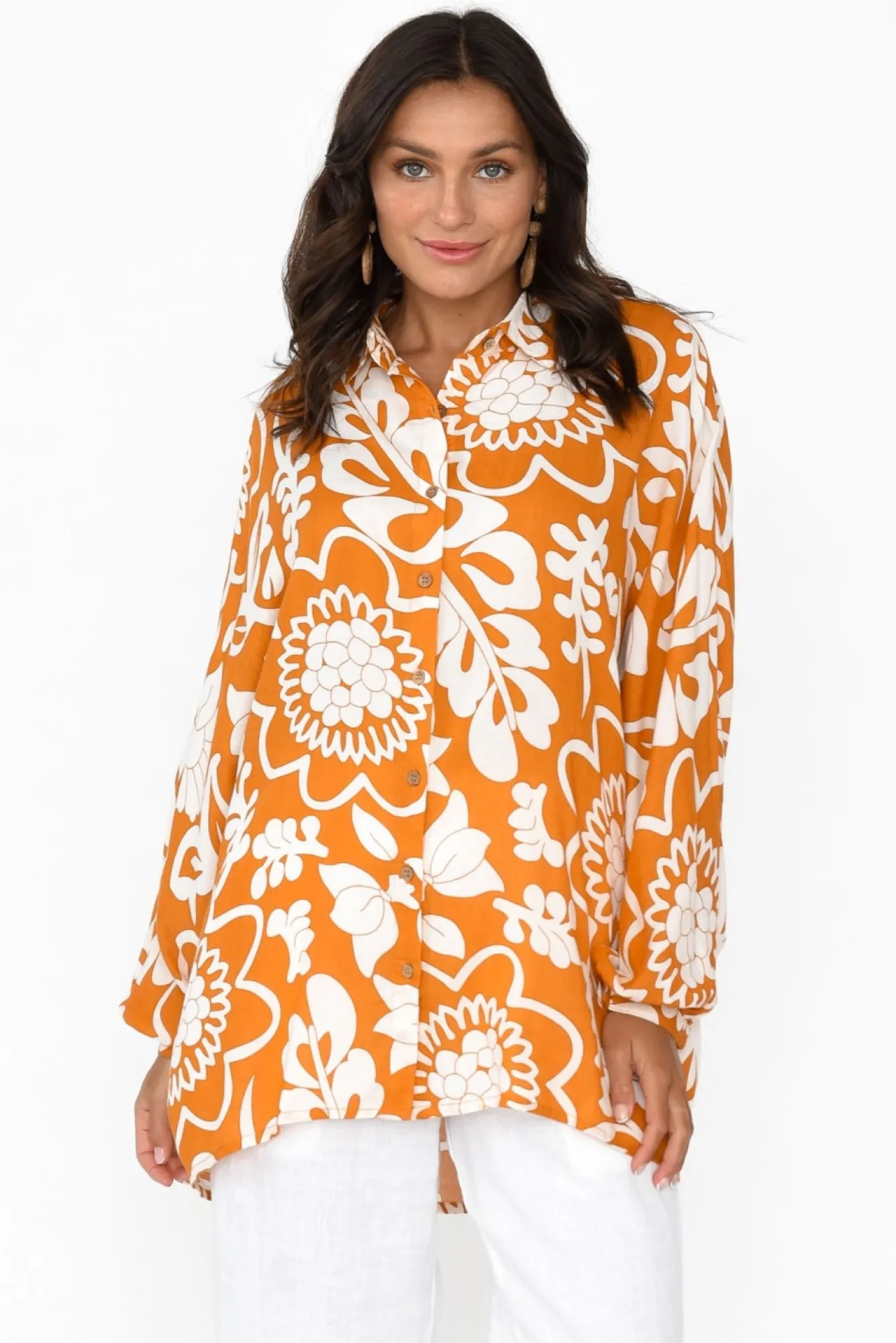 Fit: True To Size. Refer To Size & Fit Tab Below For Specific Size RecommendationNNfabric: 50% Viscose, 35% Cotton, 15% FlexNbreezy, Lightweight And Non-Stretch Fabric Designed With A Smooth Woven Feel NNsharp Collared Neckline For A Refined Look NNbutton-Down Front Featuring Wooden Button Detailing Nfull-Length Billowy Sleeves Complete With A Button Cuff NNdrape-Style SilhouetteNNhi-Lo Hemline Falls Below Hip LengthNNNcare: Cool Gentle Machine Wash RecommendedNNcolour: Burnt Orange Base With Off-White Floral Illustrations