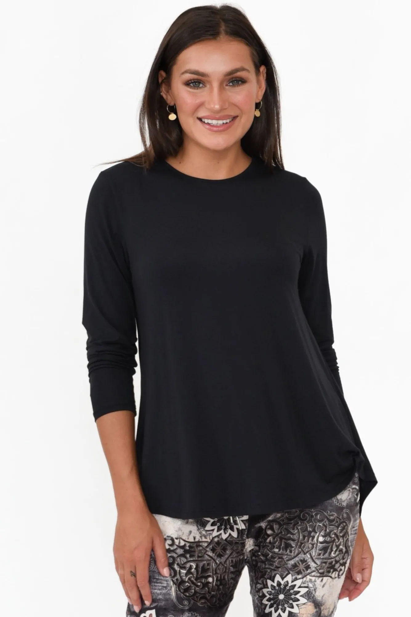 Fit: True To Size. Refer To Size & Fit Tab Below For Specific Size RecommendationNNfabric: 96% Micromodal®Air 4% Lycra®NNlightweight, Ultra-Soft And Stretchy Micro Modal Fabric Made From Sustainably Sourced Beechwood FibresNsimple High Round Neckline NNfull-Length Sleeves NNtimeless And Flattering A-Line Silhouette Nsubtle Curved Hemline Falls To A Hip-Skimming Length NNNcare: Cool Gentle Machine Wash RecommendedNNcolour: Midnight Black Shade
