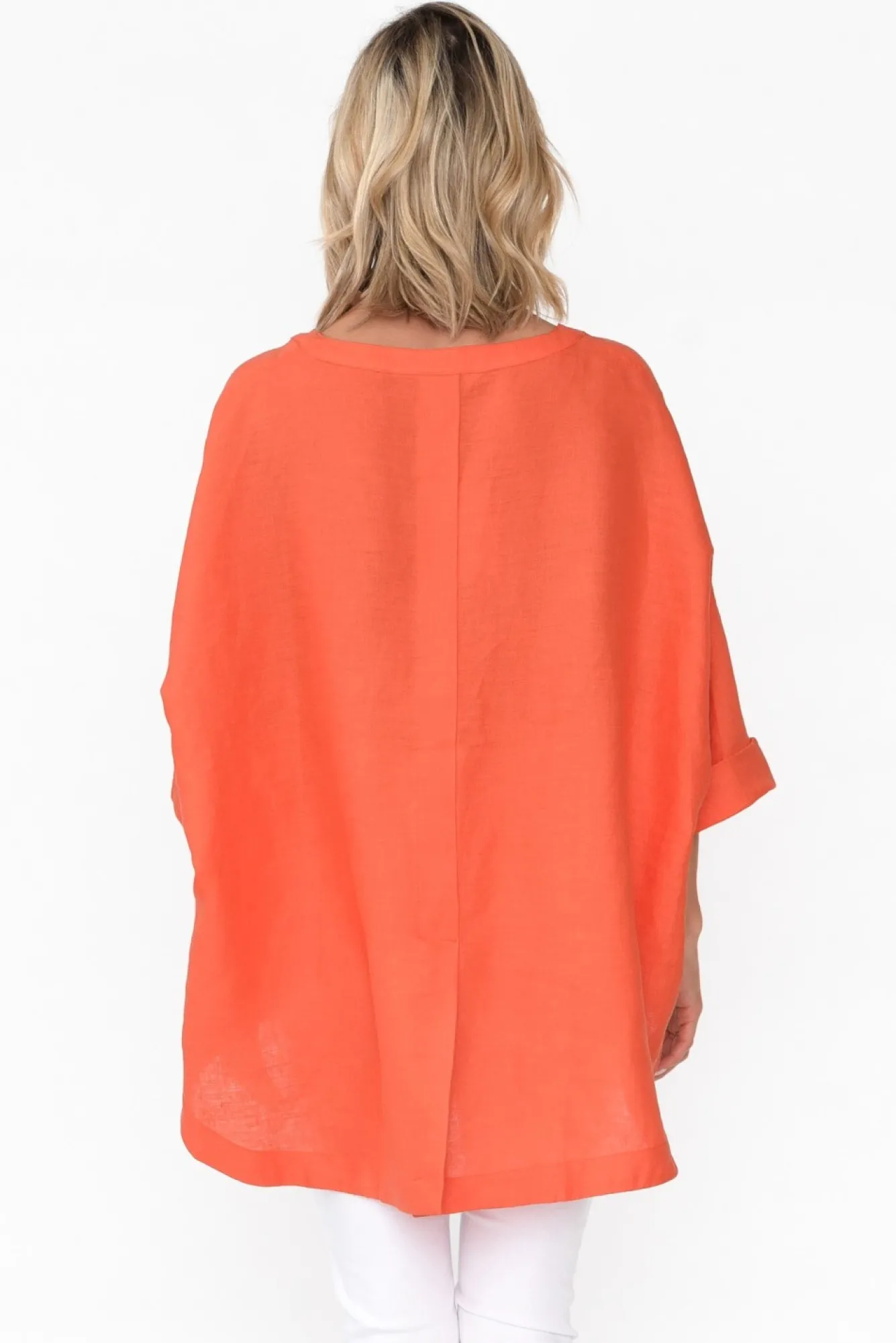 Fit: True To Size. Refer To Size & Fit Tab Below For Specific Size RecommendationNNfabric: 100% Linen Ntightly Woven Linen Offering A Breathable And Lightweight Feel NNrounded Neckline With Banded DetailNNthree-Quarter Length Oversized Sleeve Features A Drop ShoulderNNstraight Silhouette Drapes Over CurvesNNpleat Detail On The Back Elevates This StyleNcurved Hi-Lo Hem Provides More Coverage At The BackNNcare: Cool Gentle Machine Wash RecommendedNNNcolour: Stunning Orange Hue