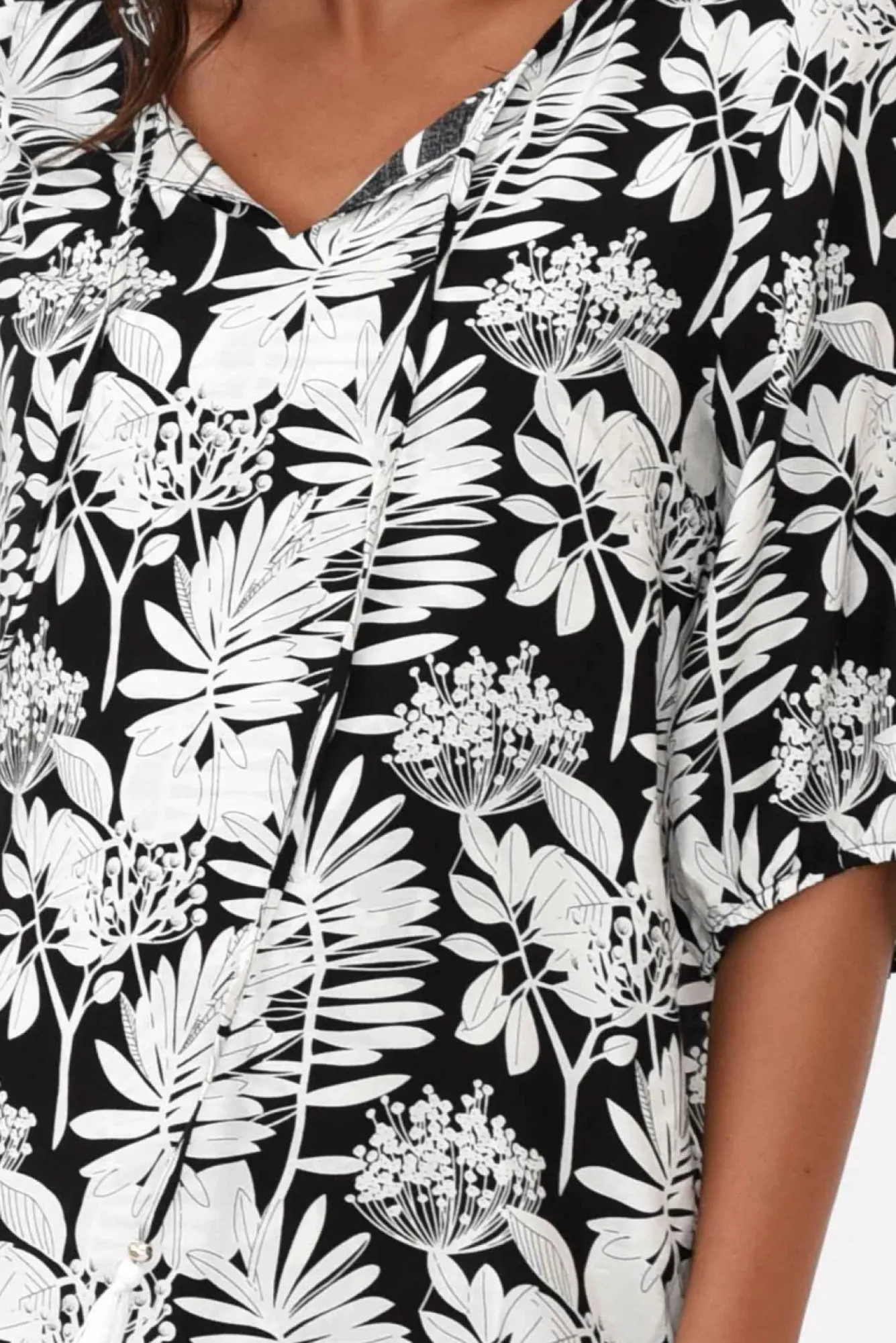Fit: True To Size. Refer To Size & Fit Tab Below For Specific Size Recommendation NNfabric: 100% RayonNan Easy-To-Wear Top Made Of Lightweight, Non-Stretch And Silky-Smooth FabricNsoft V-Split Neckline With Adjustable Tassel Tie DetailNNhalf-Length Billowy Sleeves With Loose Elasticated CuffNNfloaty Straight Silhouette Nfeaturing An Asymmetric Overlay On The Front For Additional Coverage Nlayered Hi-Lo Hemline Falls To Hip Length NNNcare: Cool Gentle Hand Wash RecommendedNNcolour: Black With A White Floral Overlay