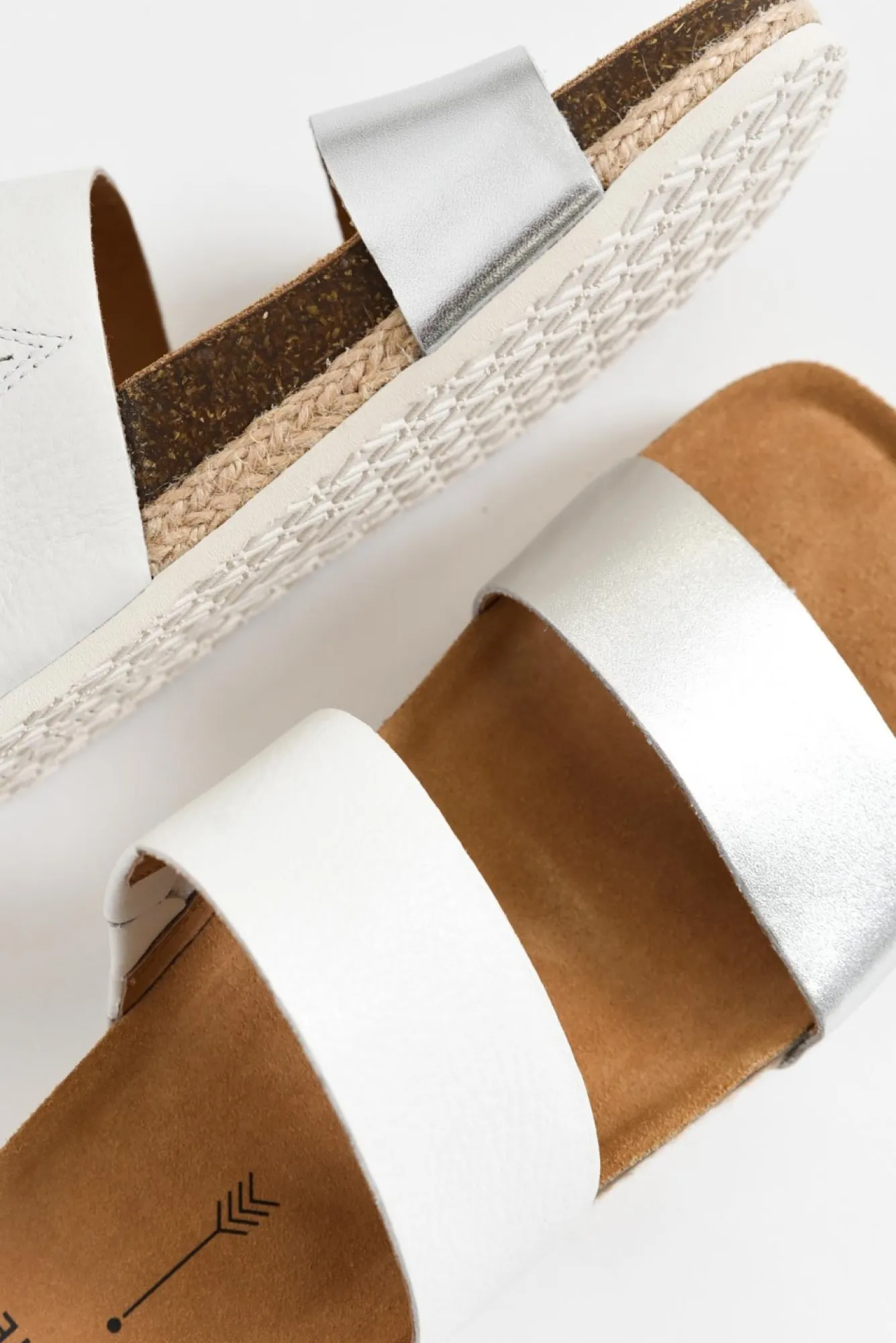 True To Size: Pick The Size You Would Normally Buy NN Fit: Standard – Wide Na Versatile, Everyday Slide With All The Signature Frankie4 Comfort FeaturesNwide Silver And White Feature Straps Across The Toes And Bridge Nelasticated Segment On The White Strap Offers A Comfortable Stretch NNfrankie4 Signature Sole Hero™ Footbed Featuring Supportive Cushioning And Arch-Support, Designed In A Soft Suede Fabric NNlayered Sole With A Feature Rope Detail And An Embossed Base To Reduce SlippingNNupper: LeatherNNlining: LeatherNsole: ManmadeNcolour: White And SilverNheel Height: 2.5Cm NNshoe Care: Use A Water And Stain-Repellent Spray To Protect Before Wearing