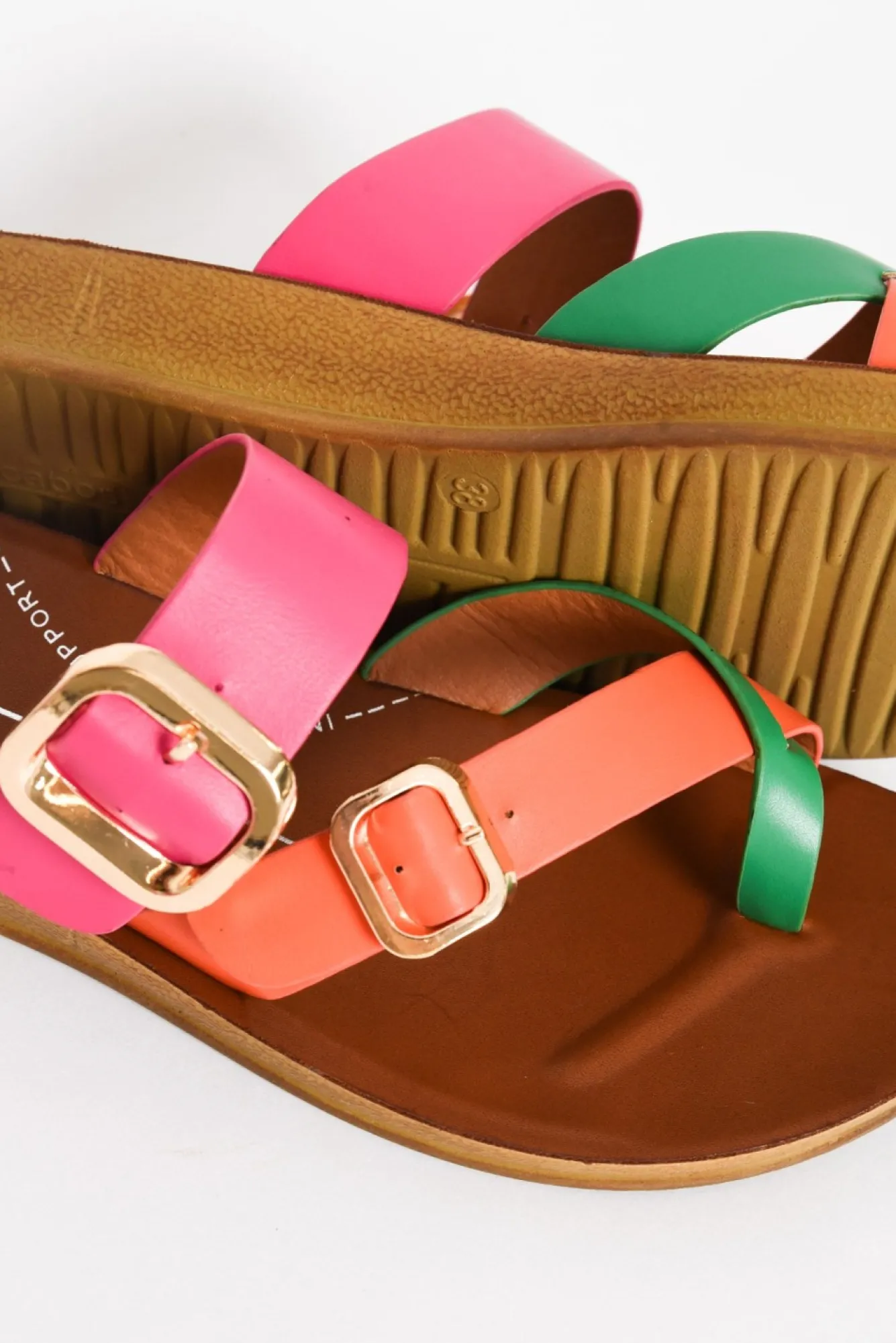 True To Size: Pick The Size You Would Normally BuyNNfit: Narrow-StandardNexperience Comfort In These Easy-To-Wear Slides, Designed With Vibrant Pops Of ColourNmulti-Strap Design With A Toe Ring And Strap Over The Bridge Of The FootNfunctional Gold Buckles On Each Strap For A Personalised FitNmoulded Footbed With Built-In Arch Support For All-Day Comfortable Wear Nlightweight, Flexible And Non-Slip Sole In A Warm BrownNNupper: Man MadeNNlining: Man MadeNNsole: Man MadeNheel Height: 2.3CmNcolour: Bright Colour-Block Straps Featuring Orange, Green And Pink NNshoe Care: Use A Water And Stain-Repellent Spray To Protect Before Wearing. To Clean Use A Damp Cloth And Polish Afterwards.